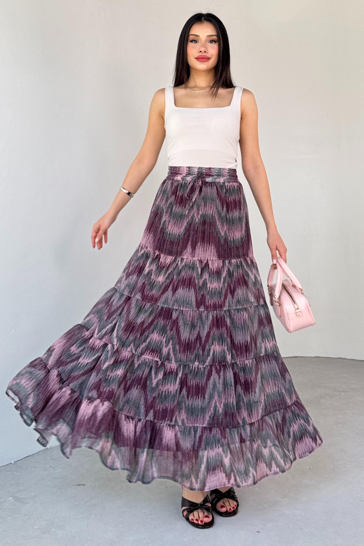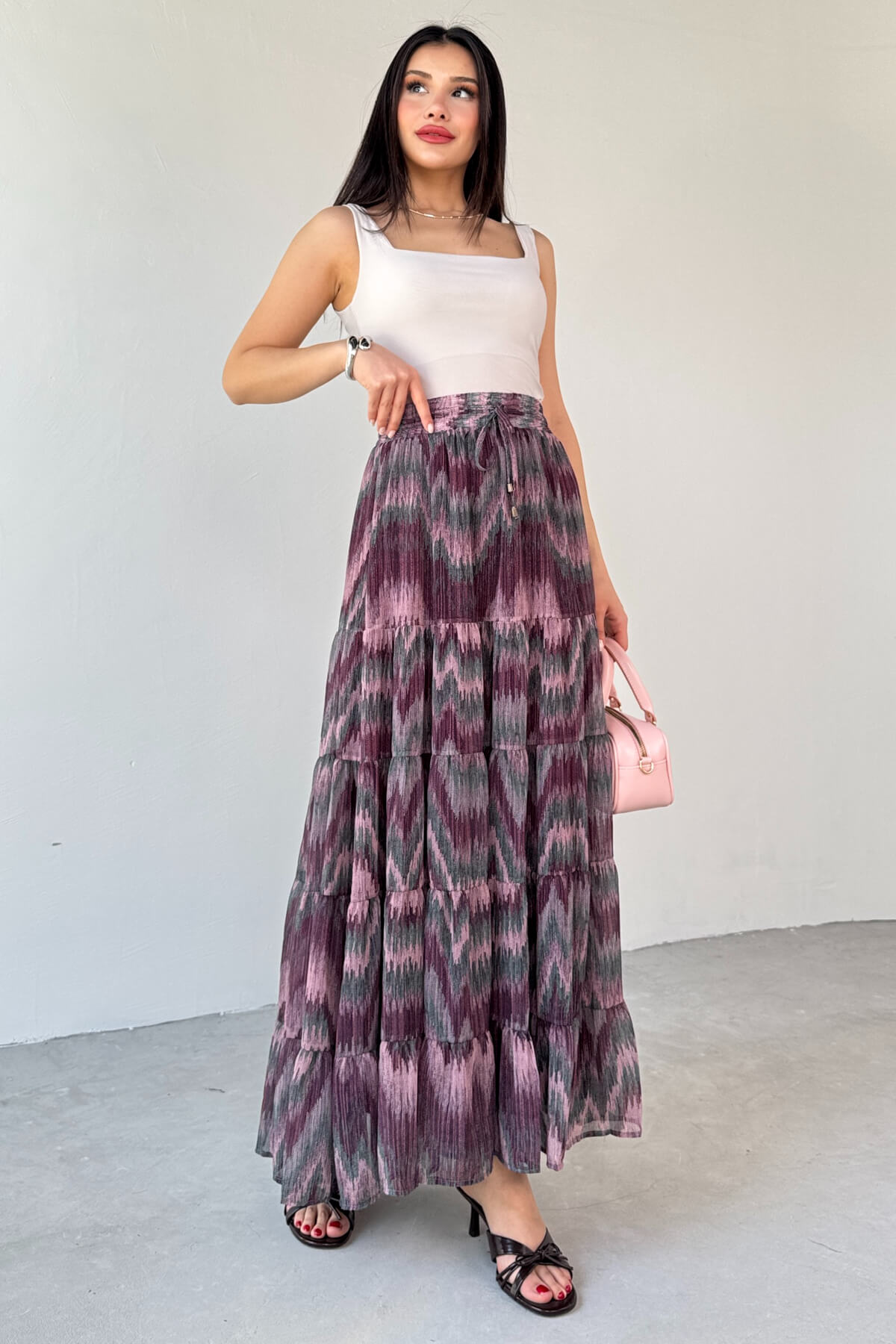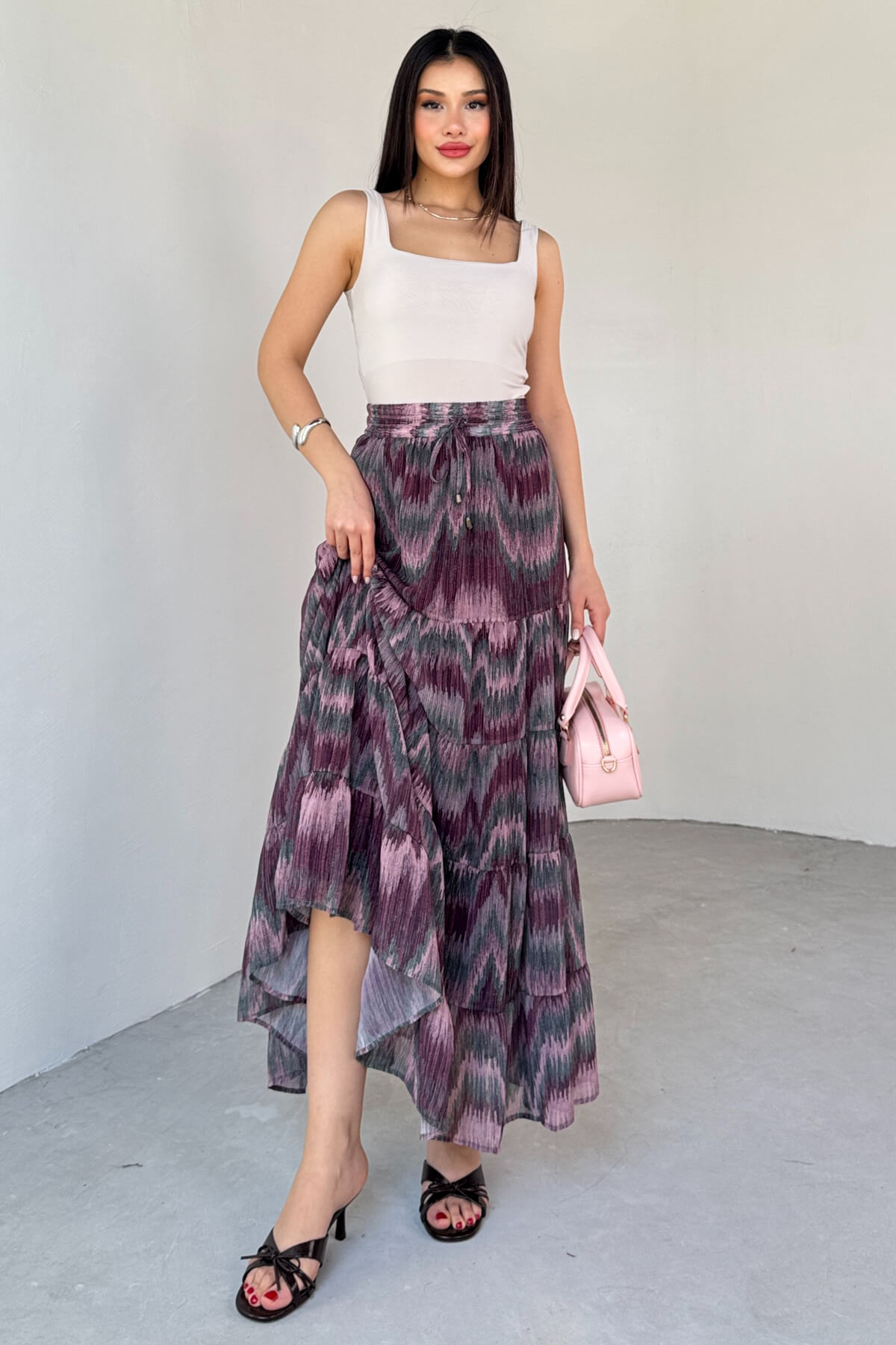 Etek katlı model, beli lastikli ve astarlıdır. Empirme baskılı şifon kumaştır.