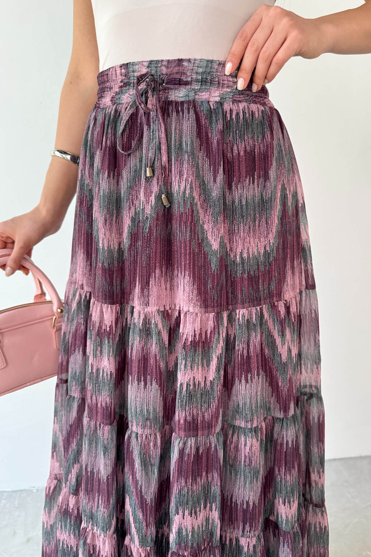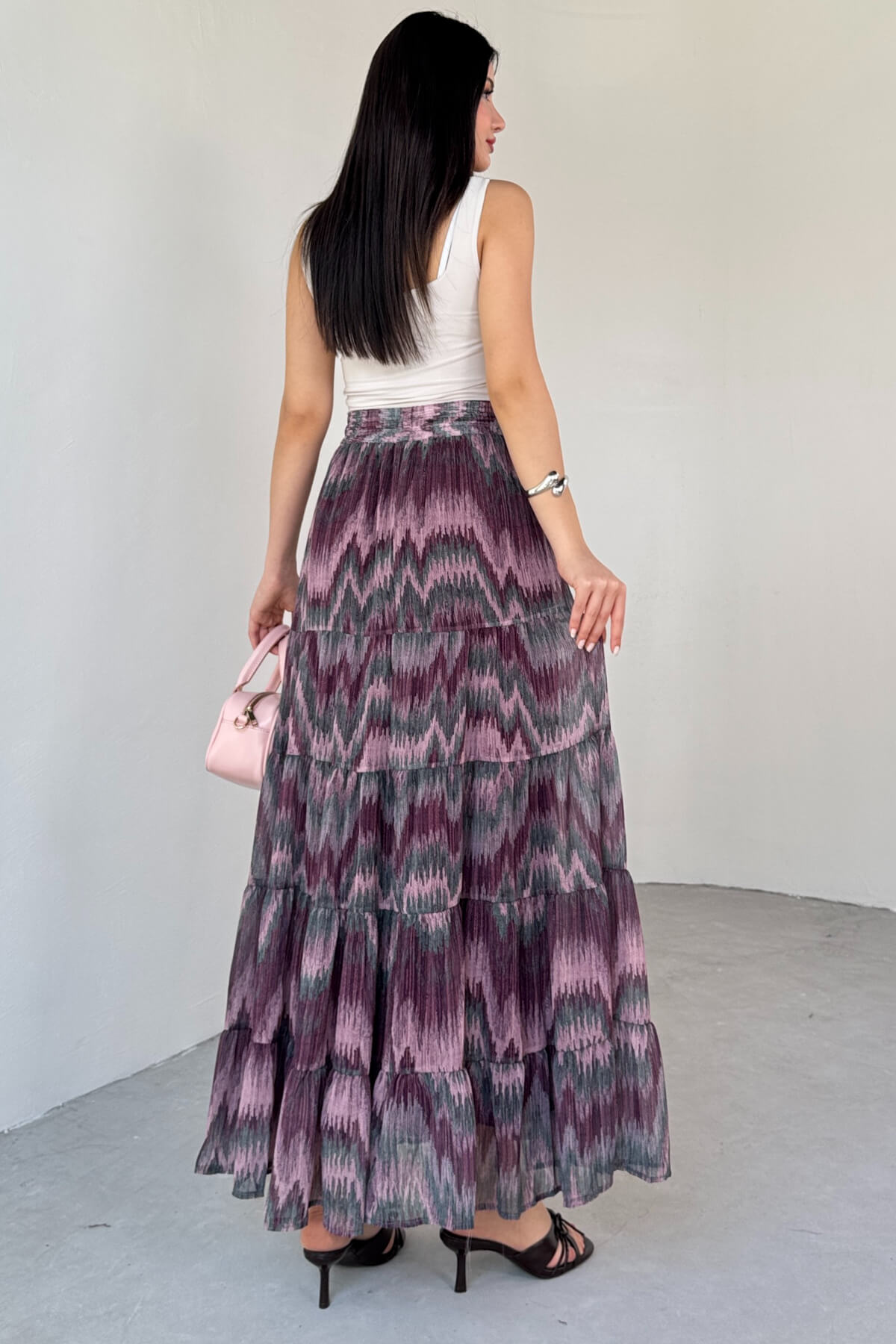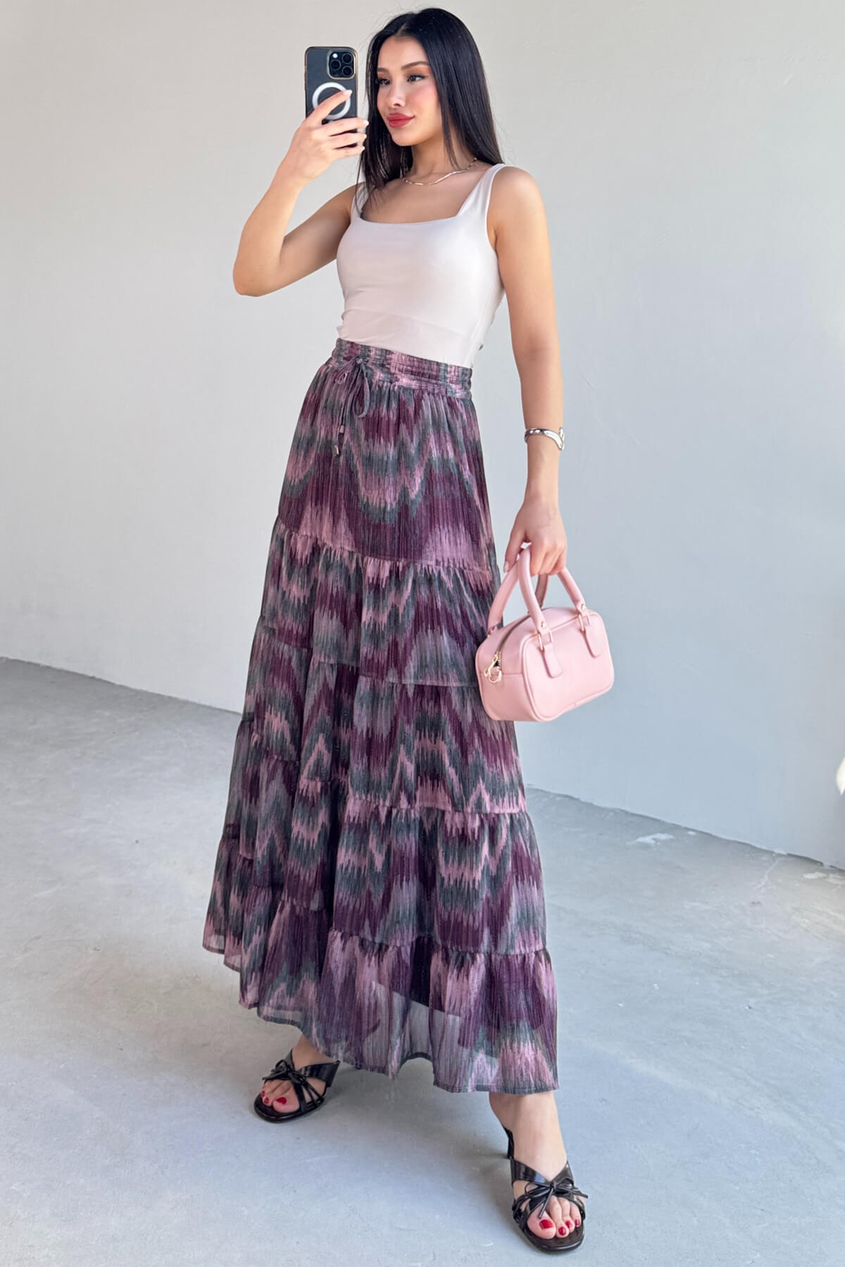 Etek katlı model, beli lastikli ve astarlıdır. Empirme baskılı şifon kumaştır.