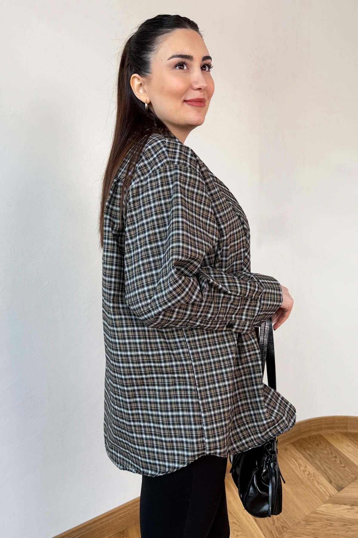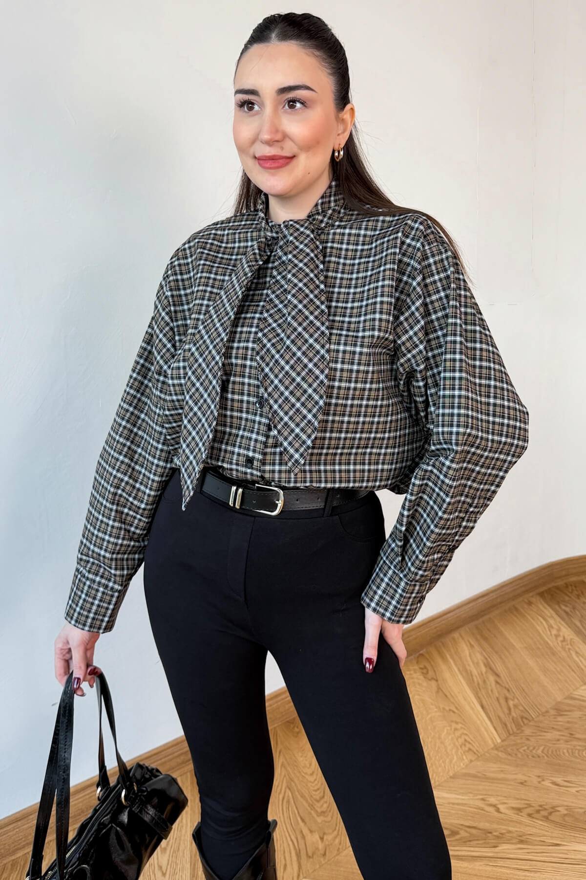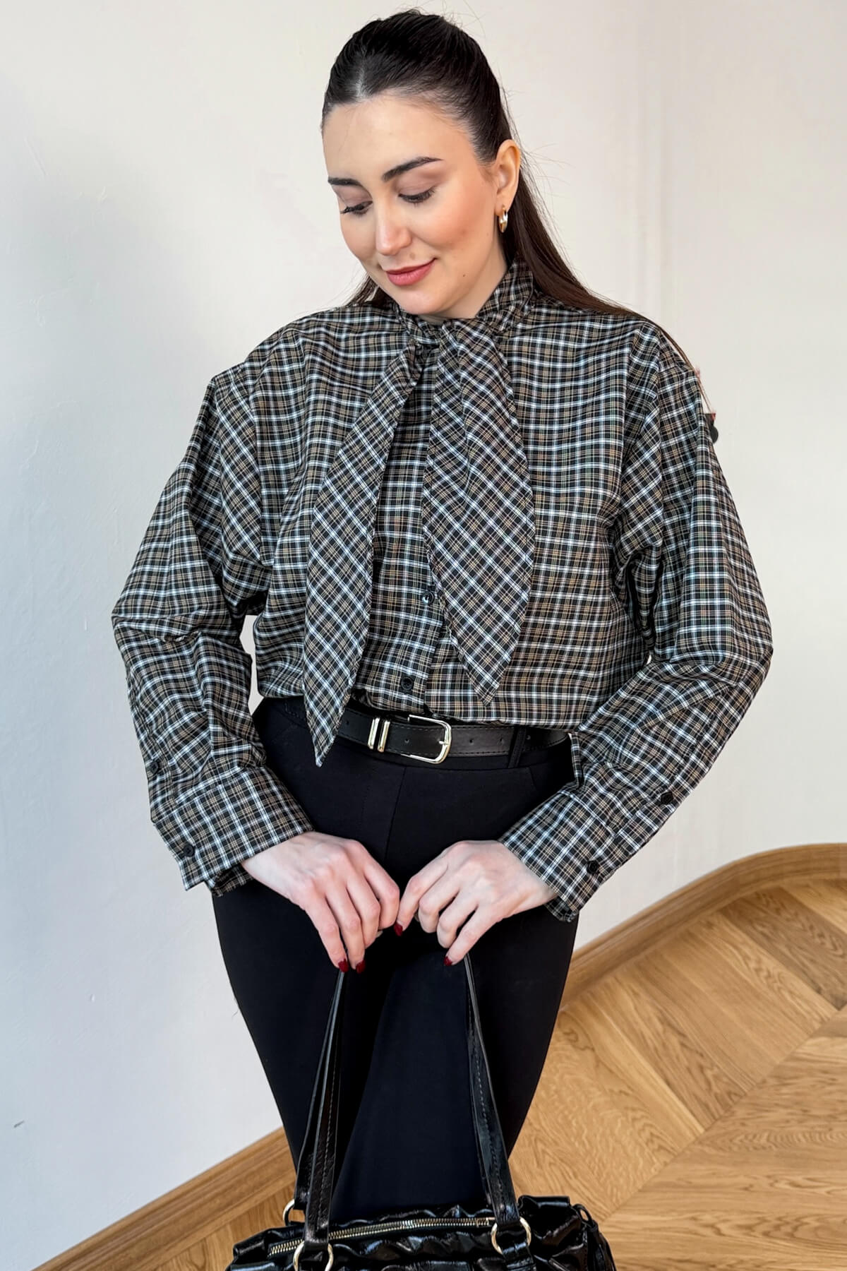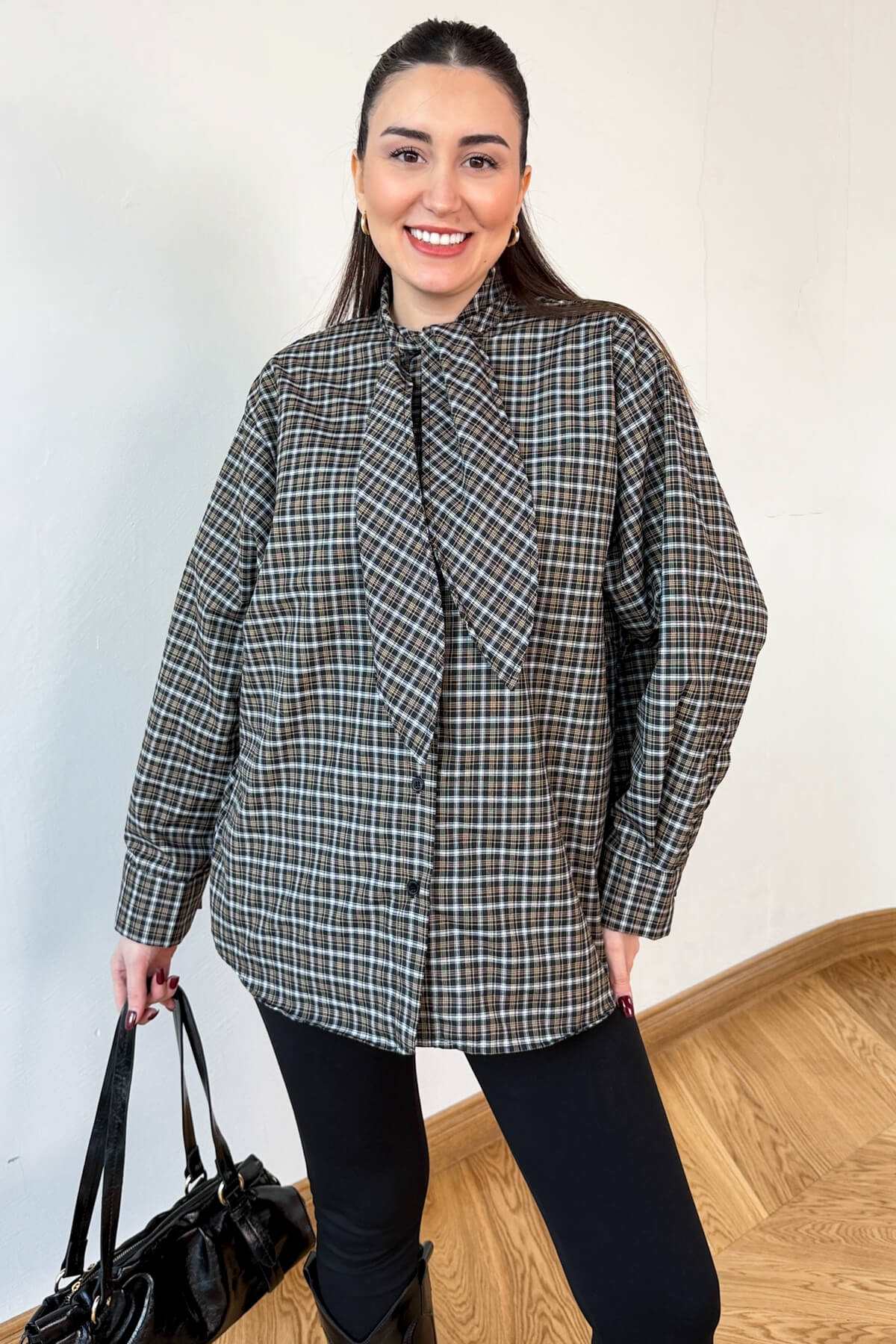 Klasik ekose deseninin modern ve sofistike bir yorumu olan bu gömlek, fular yaka detayıyla stilinize iddialı bir dokunuş katıyor. Vizon ve Siyah tonlarının kusursuz uyumunu sergileyen tasarım, akışkan formu ve konforlu oversize kesimiyle gün boyu zarif bir silüet sunuyor. Hem ofis şıklığında hem de günlük kombinlerinizde "çabasız şıklık" temasını tamamlayan bu parça, gardırobunuzun en dinamik üyelerinden biri olmaya aday.