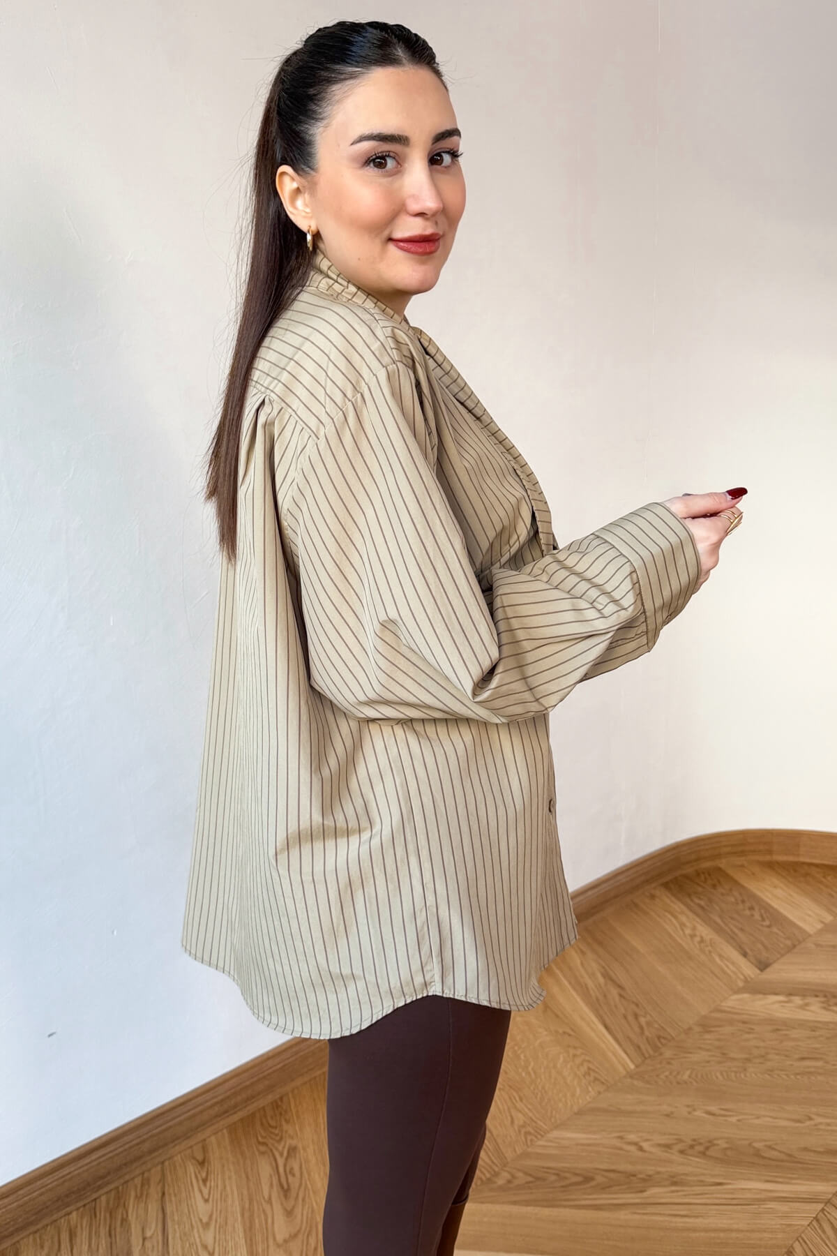 odern çizgilerin sofistike bir tasarımla buluştuğu bu özel gömlek, gardırobunuza zamansız bir dokunuş katıyor. İnce çizgi desenleri ve özgün fular yaka detayıyla hareket kazanan tasarım, 72 cm boyu ve konforlu oversize kesimi sayesinde hem şık hem de eforsuz bir duruş sergiliyor. Tok duruşlu kumaşı ve dikey hatları, silüetinizi daha uzun ve zarif gösterirken, stilinize dinamik bir hava katıyor.