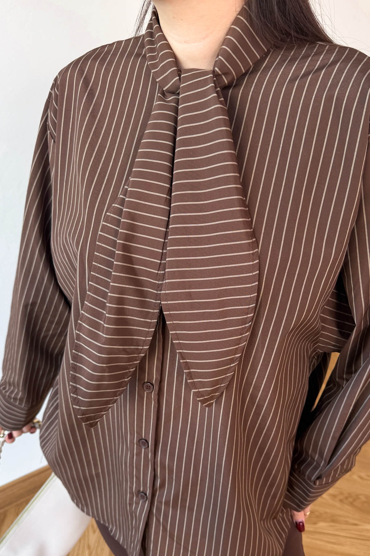 odern çizgilerin sofistike bir tasarımla buluştuğu bu özel gömlek, gardırobunuza zamansız bir dokunuş katıyor. İnce çizgi desenleri ve özgün fular yaka detayıyla hareket kazanan tasarım, 72 cm boyu ve konforlu oversize kesimi sayesinde hem şık hem de eforsuz bir duruş sergiliyor. Tok duruşlu kumaşı ve dikey hatları, silüetinizi daha uzun ve zarif gösterirken, stilinize dinamik bir hava katıyor.