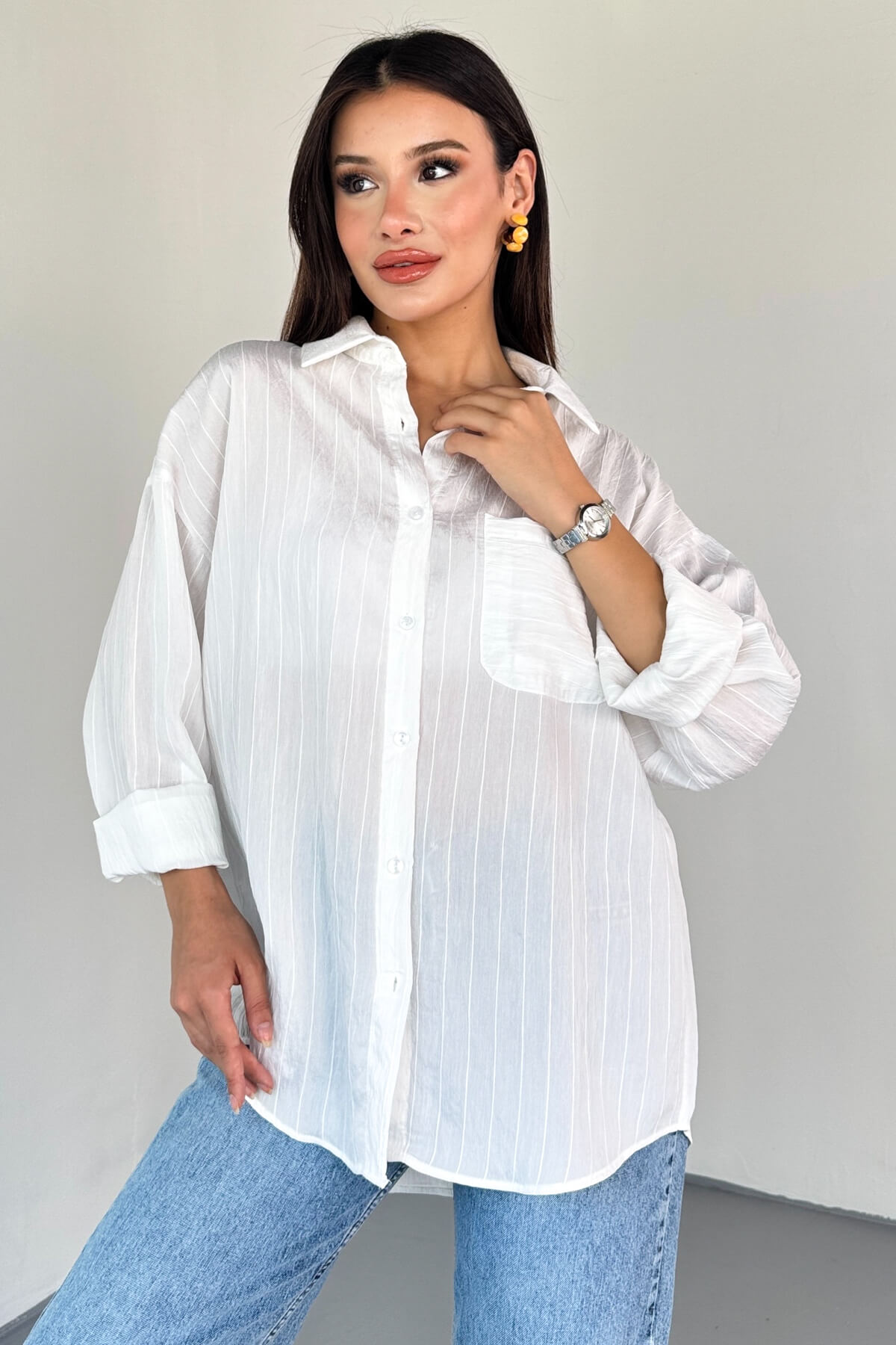 GML-10241 Beyaz Cep Detay Çizgili Salaş Gömlek