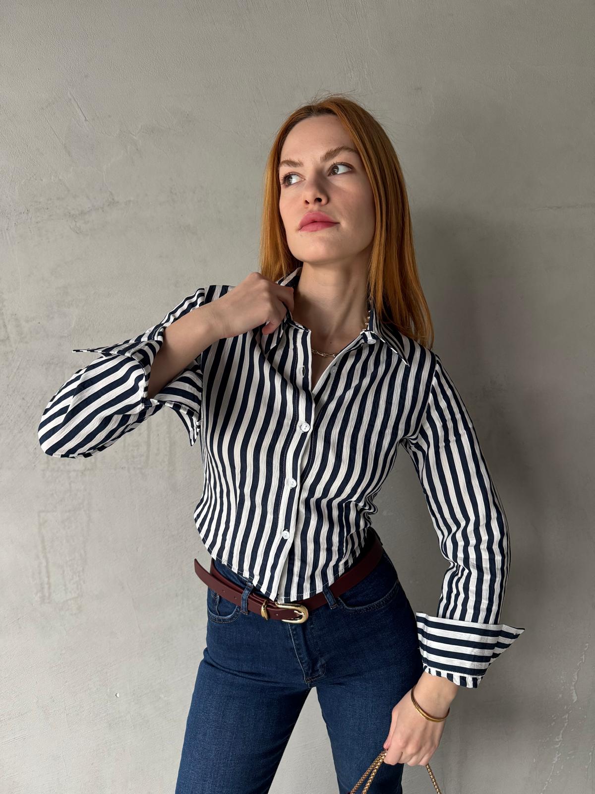 Cappmoda  GML-10244 Lacivert Beyaz Çizgili Arka Bel Lastikli Detay Düğmeli Gömlek