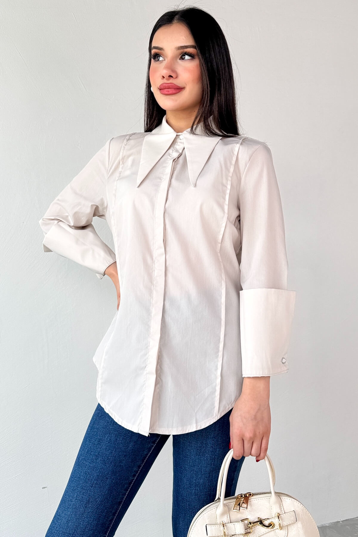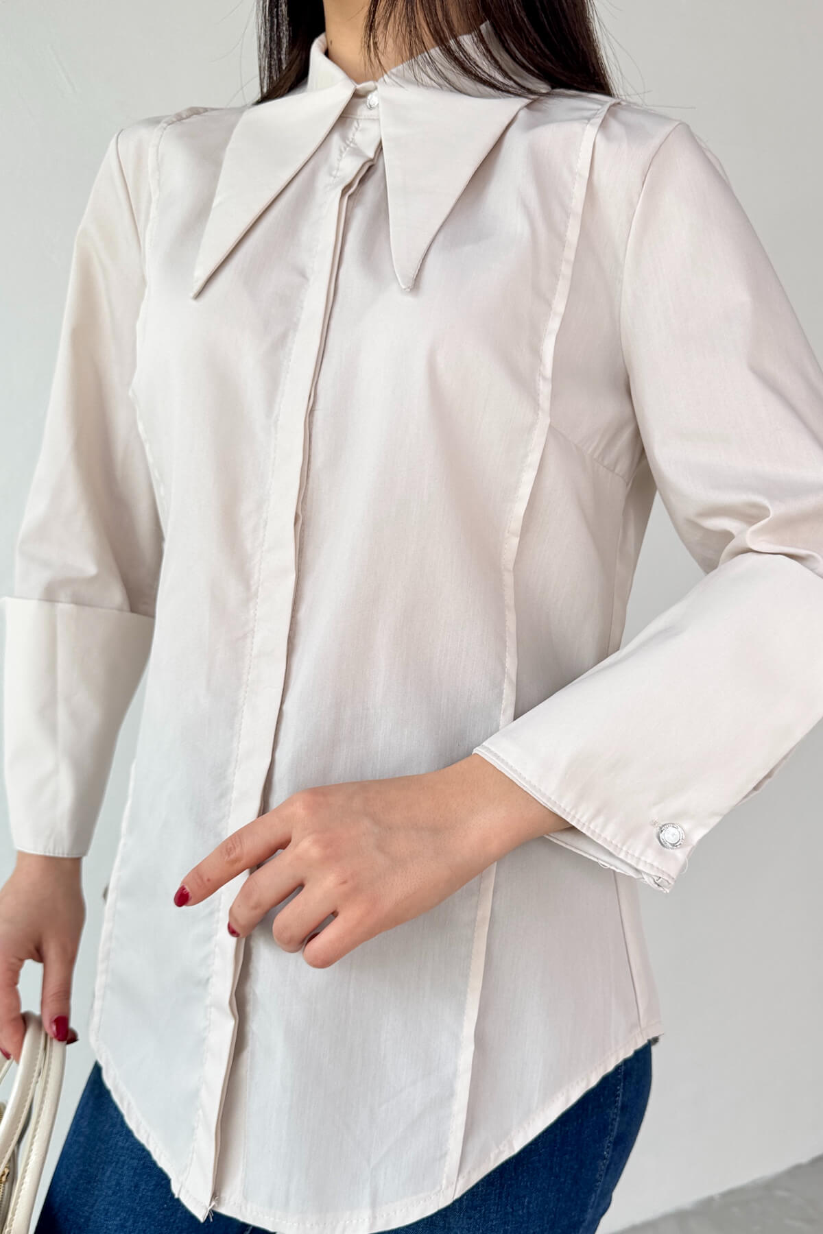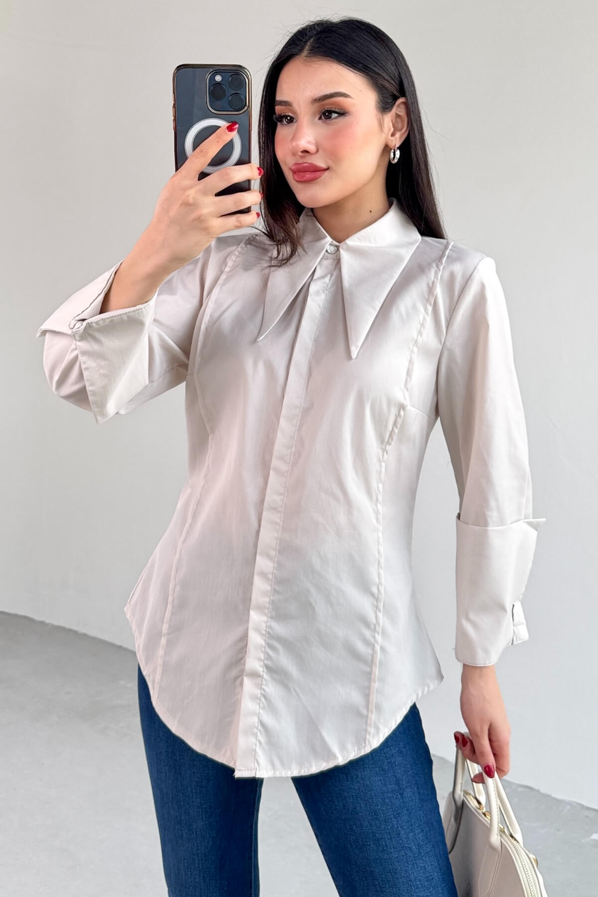 Gömlek manşet kollu, sivri yakalıdır ve önünde dikiş detayları bulunur. Vücuda tam oturan kalıptır.