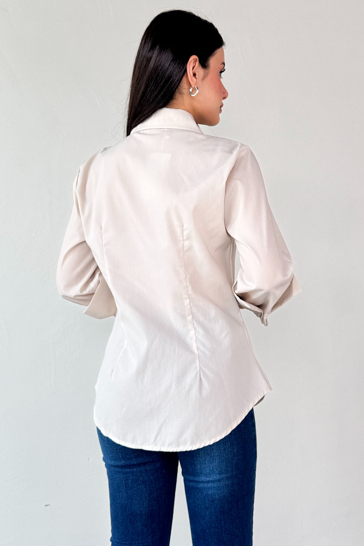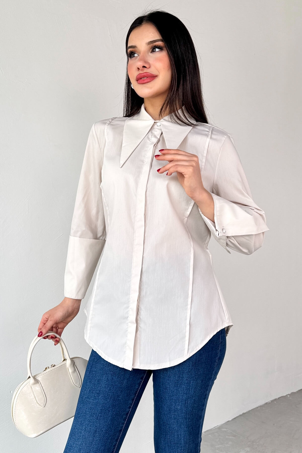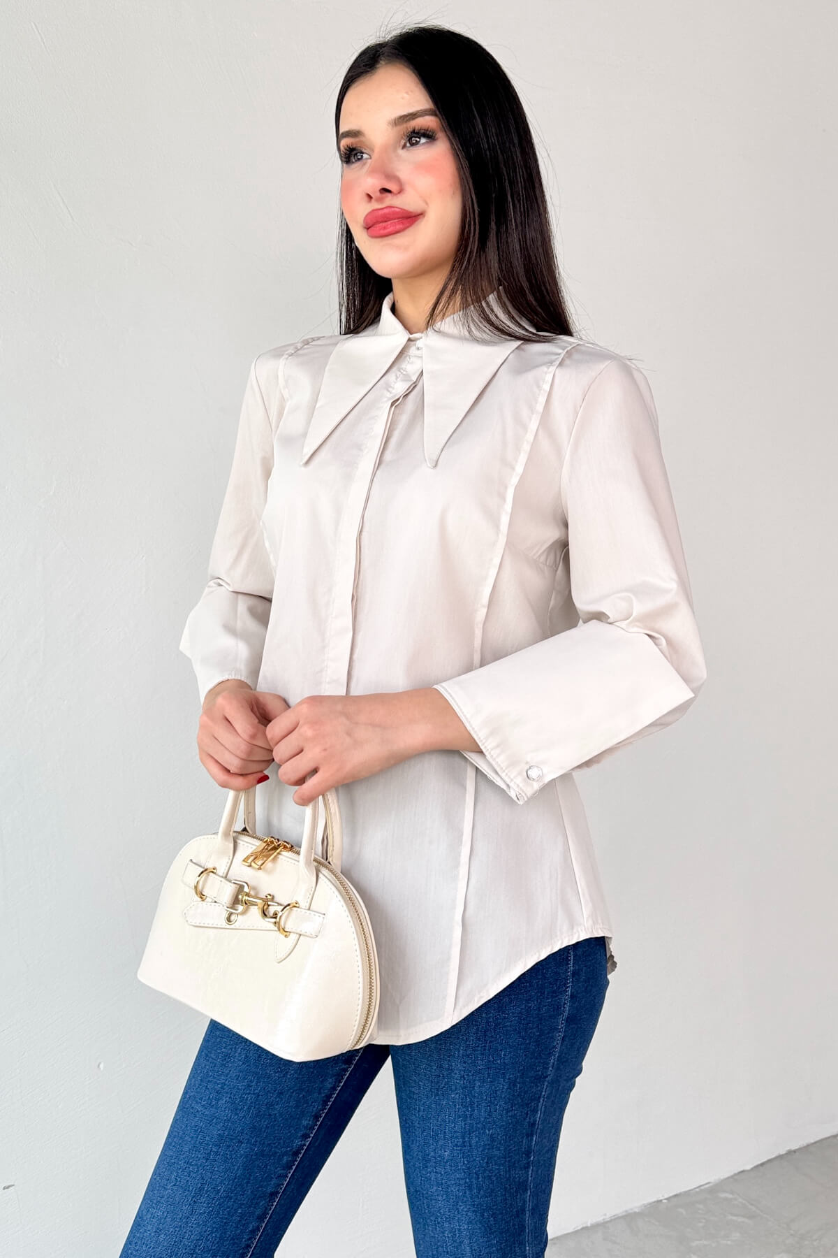 Gömlek manşet kollu, sivri yakalıdır ve önünde dikiş detayları bulunur. Vücuda tam oturan kalıptır.