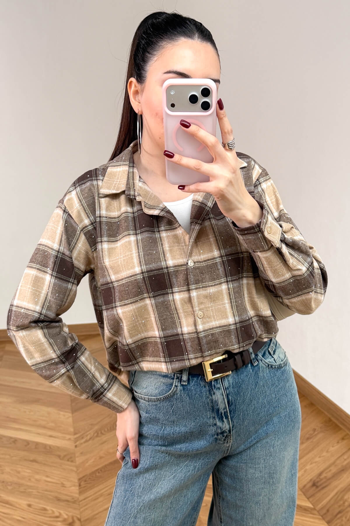 okak modasının dinamizmini sofistike detaylarla buluşturan bu özel tasarım gömlek, gardırobunuzun en özgün parçalarından biri olmaya aday. Klasik ekose desenin üzerine işlenen zarif taş detayları ve "kendinden atletli" pratik yapısı ile katmanlı şıklığı tek parçada zahmetsizce sunuyor. Önü 42 cm olan modern crop kesimi ve kıvırmalı tasarım detayı bele vurgu yaparken, arkadaki 60 cm'lik uzunluk dengeli ve akışkan bir silüet yaratıyor. Tok duruşlu dokuma kumaşı ile hem şık hem de konforlu bir deneyim vadediyor.
