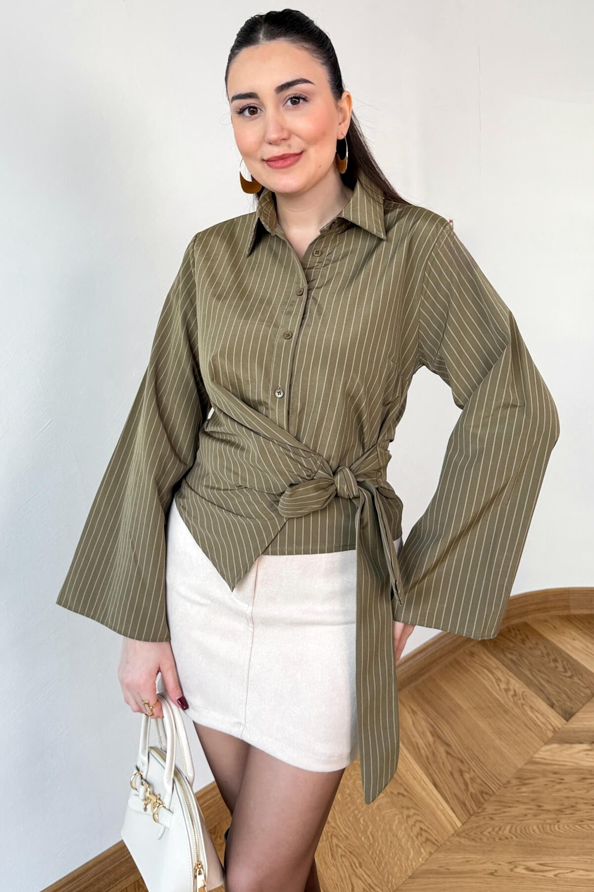 Klasik çizgilerin modern bir yorumu olan bu gömlek, feminen detaylarıyla gardırobunuzun yeni favorisi olmaya aday. Bel kısmındaki kuşak bağlama detayı sayesinde bel hattınızı vurgulayan tasarım, 54 cm boyuyla crop formun en zarif halini sunuyor. 44 cm en ölçüsüyle vücuda dengeli bir şekilde oturan bu gömlek, dik yaka formu ve dikey çizgileriyle hem ofis hem de hafta sonu şıklığı için kusursuz bir silüet oluşturuyor.