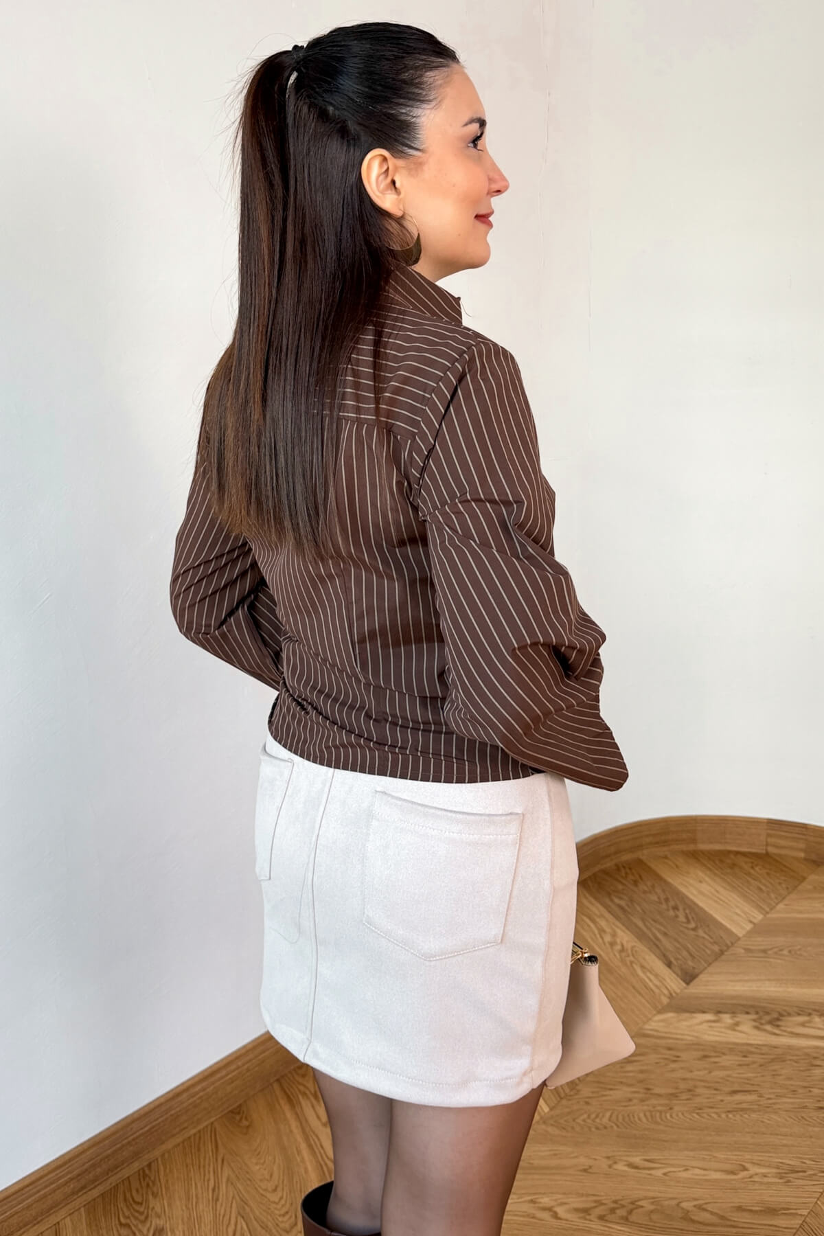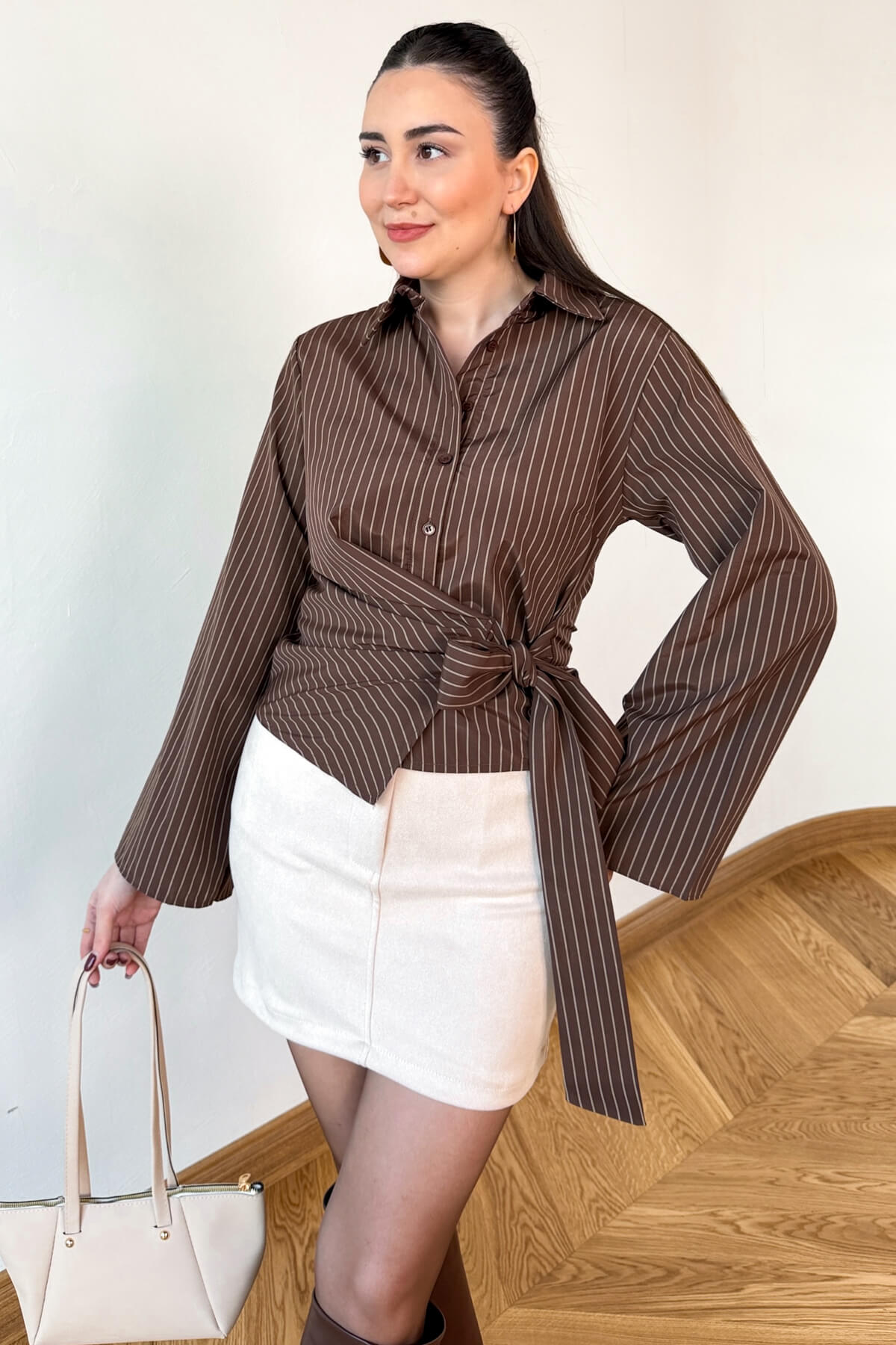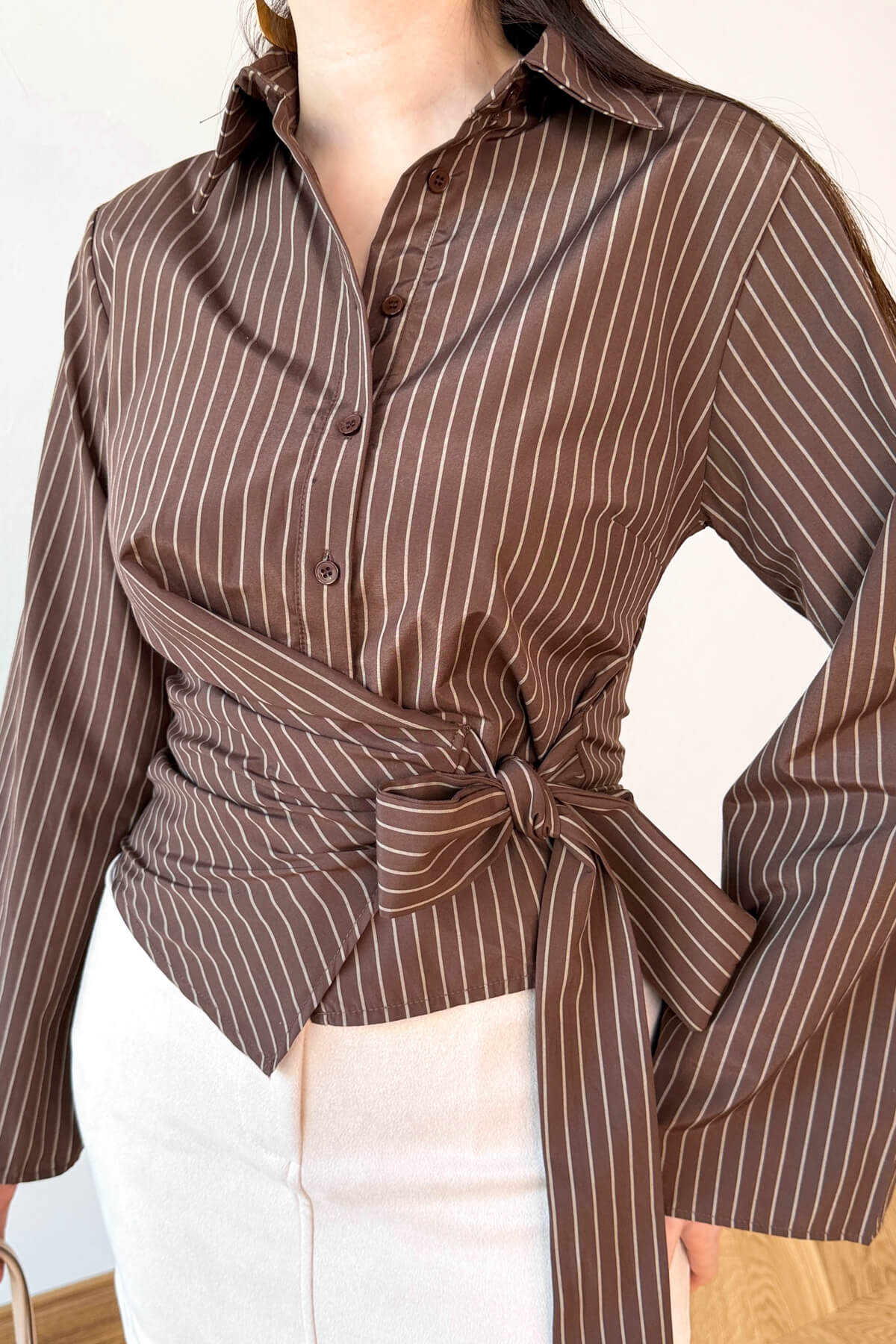 Klasik çizgilerin modern bir yorumu olan bu gömlek, feminen detaylarıyla gardırobunuzun yeni favorisi olmaya aday. Bel kısmındaki kuşak bağlama detayı sayesinde bel hattınızı vurgulayan tasarım, 54 cm boyuyla crop formun en zarif halini sunuyor. 44 cm en ölçüsüyle vücuda dengeli bir şekilde oturan bu gömlek, dik yaka formu ve dikey çizgileriyle hem ofis hem de hafta sonu şıklığı için kusursuz bir silüet oluşturuyor.