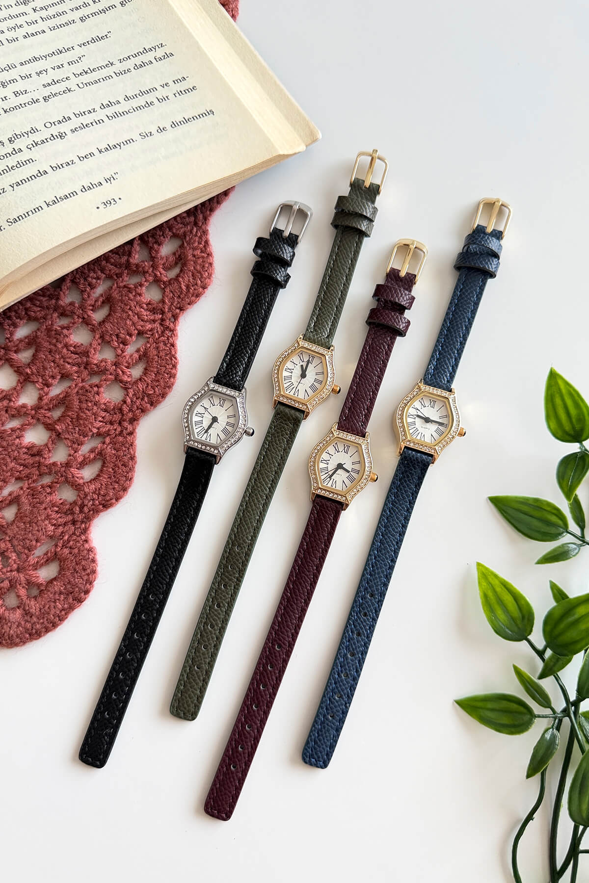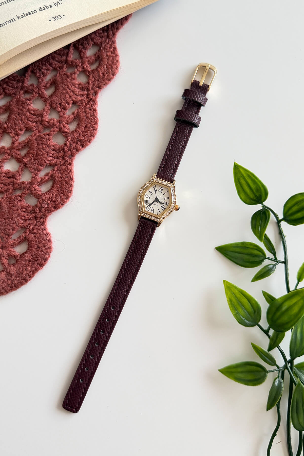 Geometrik formun modern gücü, klasik taş işçiliğiyle buluşuyor. Altıgen altın rengi kasanın etrafını saran zarif taş detayları, Roma rakamlı vintage kadranla kusursuz bir uyum içinde. İnce deri kordonun naifliği, saatin ışıltısını dengelerken bileğinizde lüks bir mücevher etkisi yaratıyor. Özel anlarınızın ve en şık kombinlerinizin vazgeçilmez tamamlayıcısı.