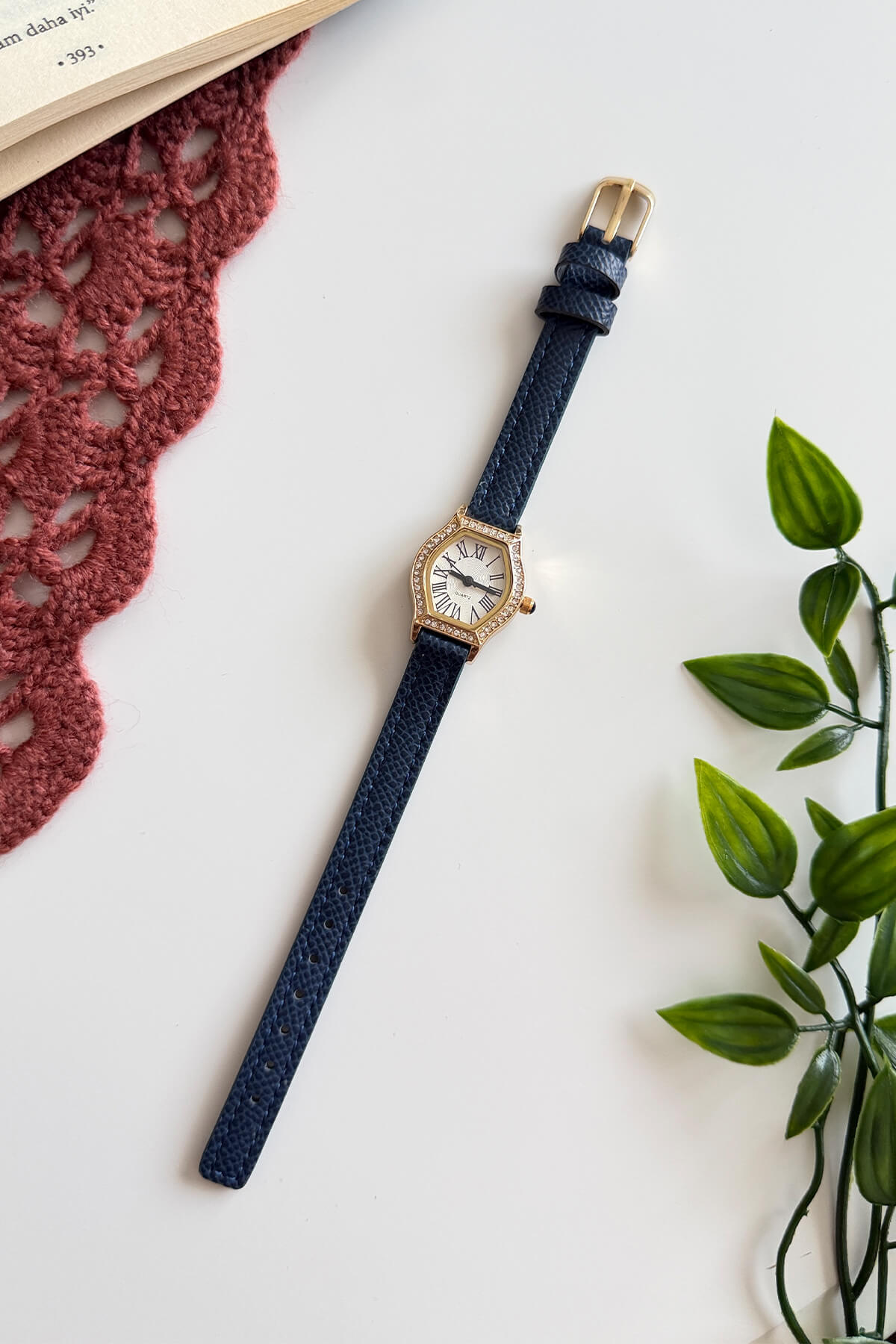 Geometrik formun modern gücü, klasik taş işçiliğiyle buluşuyor. Altıgen altın rengi kasanın etrafını saran zarif taş detayları, Roma rakamlı vintage kadranla kusursuz bir uyum içinde. İnce deri kordonun naifliği, saatin ışıltısını dengelerken bileğinizde lüks bir mücevher etkisi yaratıyor. Özel anlarınızın ve en şık kombinlerinizin vazgeçilmez tamamlayıcısı.