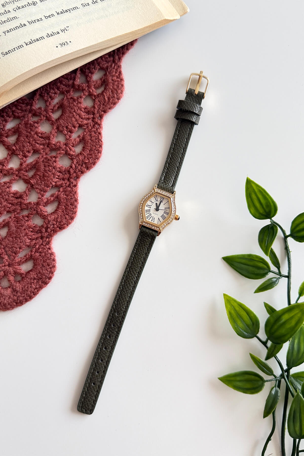 Geometrik formun modern gücü, klasik taş işçiliğiyle buluşuyor. Altıgen altın rengi kasanın etrafını saran zarif taş detayları, Roma rakamlı vintage kadranla kusursuz bir uyum içinde. İnce deri kordonun naifliği, saatin ışıltısını dengelerken bileğinizde lüks bir mücevher etkisi yaratıyor. Özel anlarınızın ve en şık kombinlerinizin vazgeçilmez tamamlayıcısı.