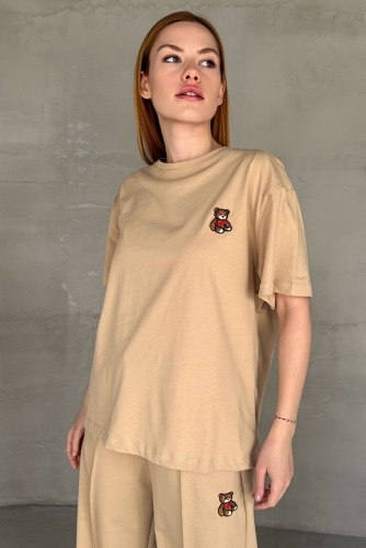 İND-20313 Vizon Ayıcık Nakışlı Bisiklet Yaka Tişört