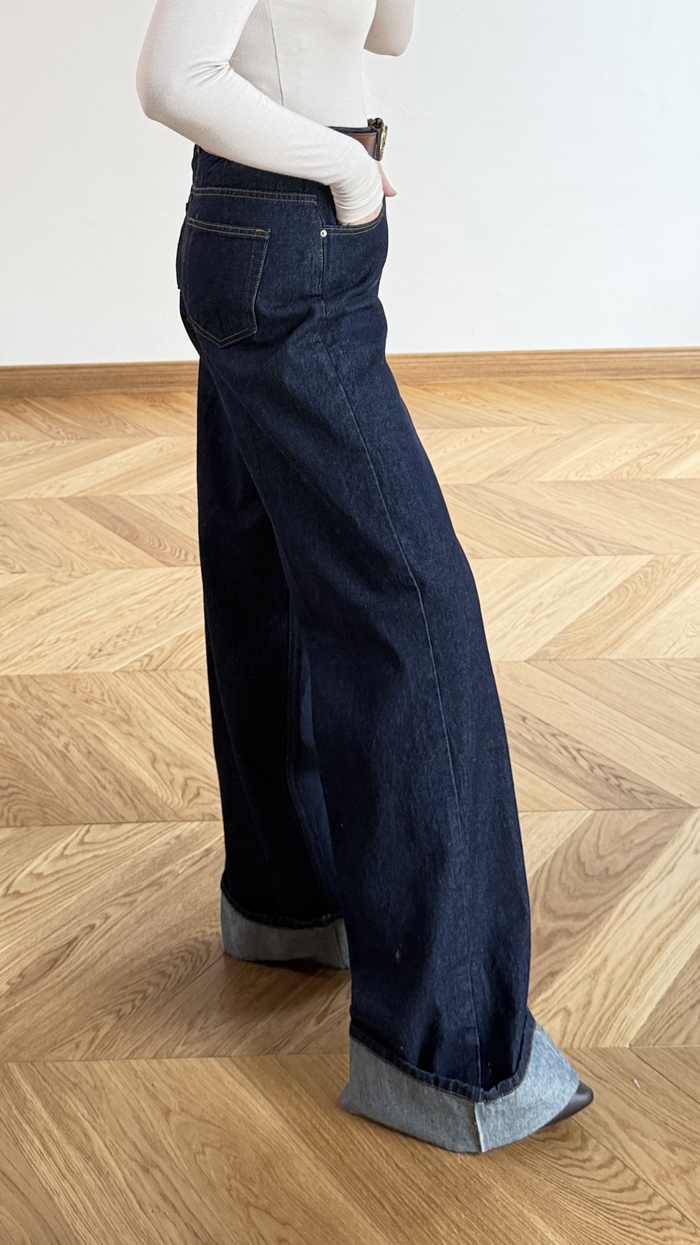 Kıvrık paça detayı ile modern ve farklı bir stil sunar.