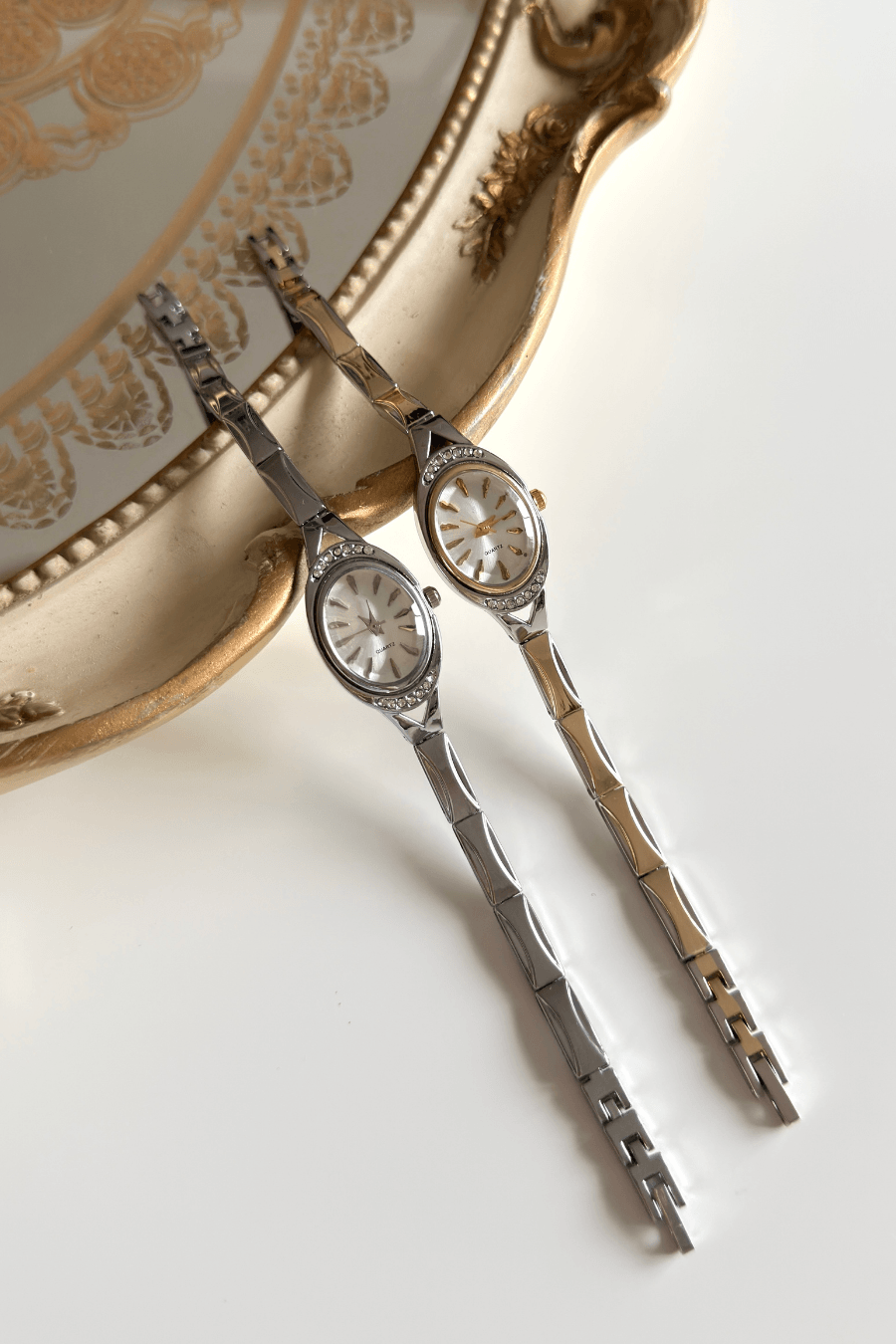 Gümüşün soğuk ışıltısı ile gold rengin sıcak detayları Jenna serisinde kusursuzca harmanlanıyor. Oval kasayı çevreleyen kristal taşlar ve kordonun kendine has ince yapısı, vintage mücevher tasarımlarını andırıyor. Kadran içindeki ve kordon bağlantısındaki gold dokunuşlar, saati hem altın hem de gümüş takılarınızla kombinlenebilir kılıyor. Naif duruşuyla stilinize romantik ve lüks bir hava katmak için tasarlandı.
