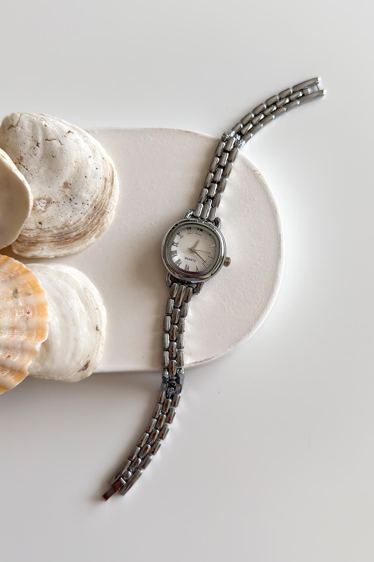 Zarif zincir detaylarıyla klasik saat tasarımını bir adım öteye taşıyarak bileğinizde ince bir bileklik zarafeti sunuyor. Gümüşün serin ve asil tonu, beyaz kadranın sadeliğiyle birleşerek hem günlük kullanımda hem de özel anlarda stilinize naif bir dokunuş katıyor. Minimalist kasası ve vintage esintiler taşıyan kordon yapısıyla bu model, modern kadının zarafetini tamamlayan en şık aksesuarlardan biri.