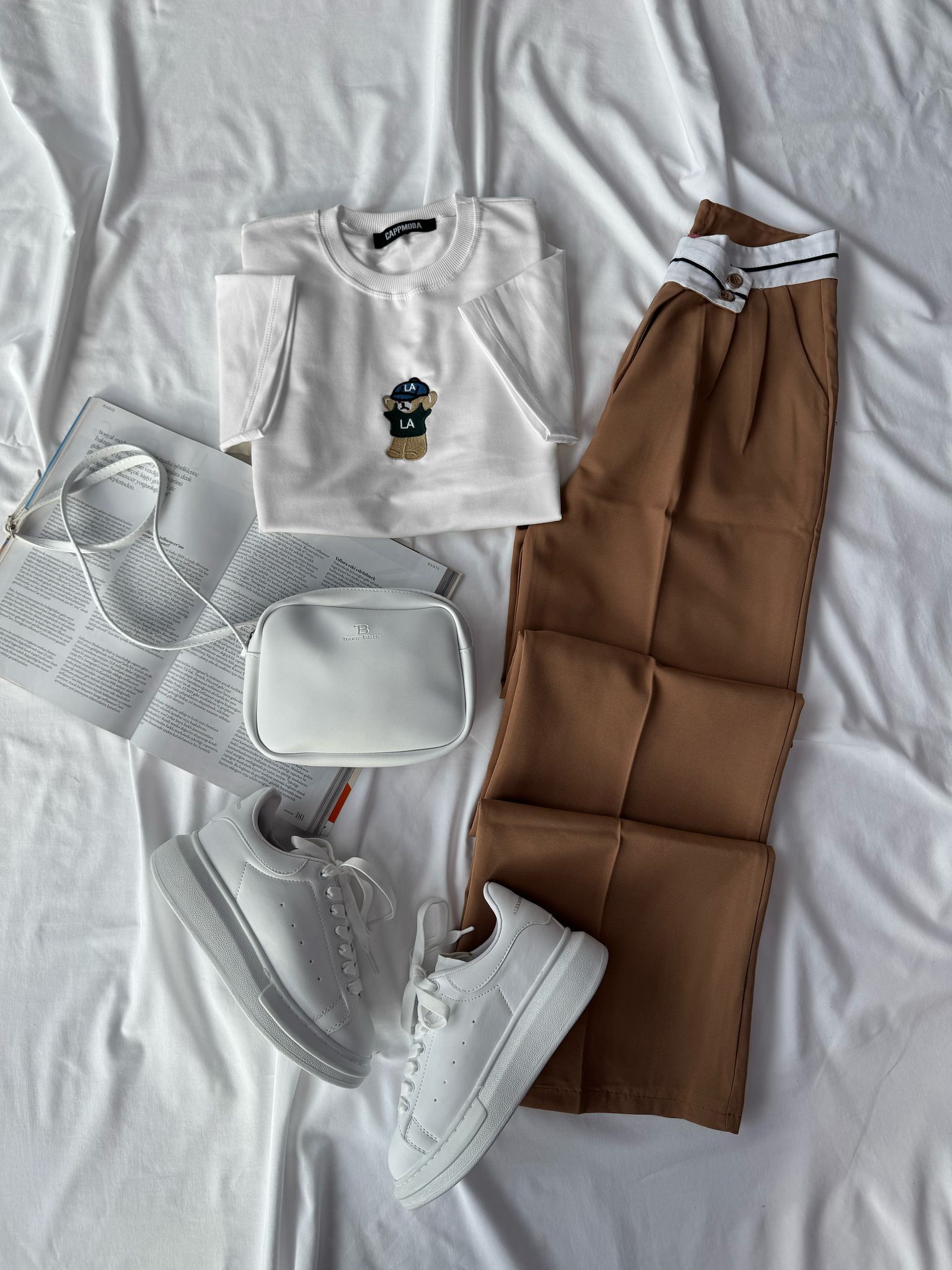 K023 Krem Rengi Tişört Kemerli Palazzo Pantolon Leopar SMB Sneaker Üçlü Kombin