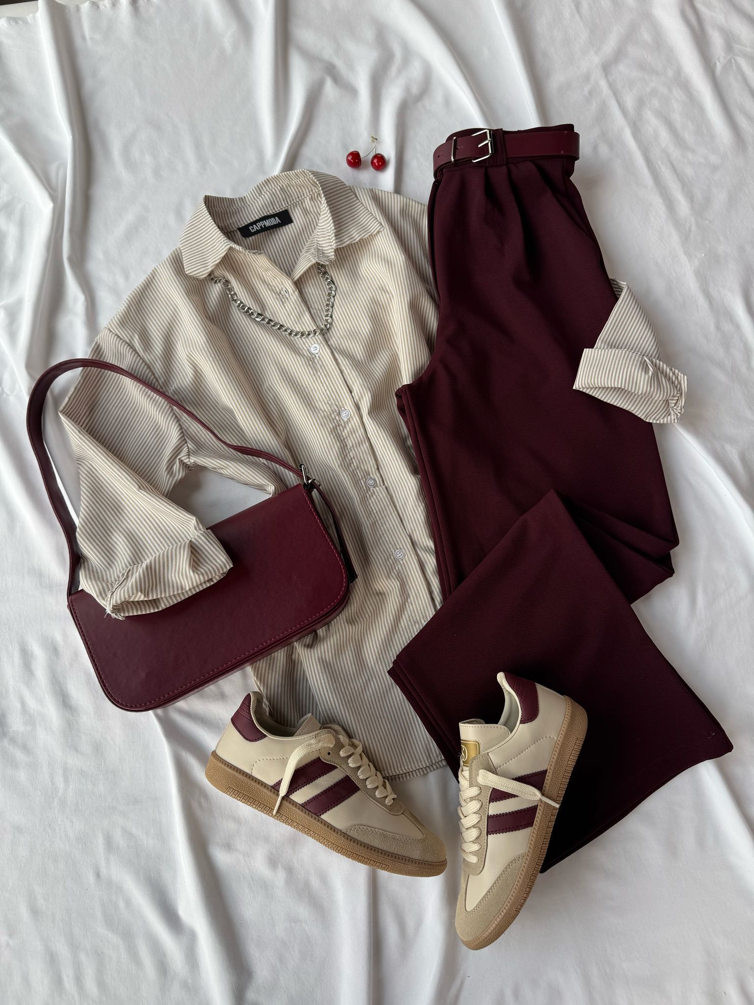 K038 Vizon Çizgili Gömlek Kemerli Palazzo Pantolon Bordo Çanta Şeritli SMB Snaeker Dörtlü Kombinn