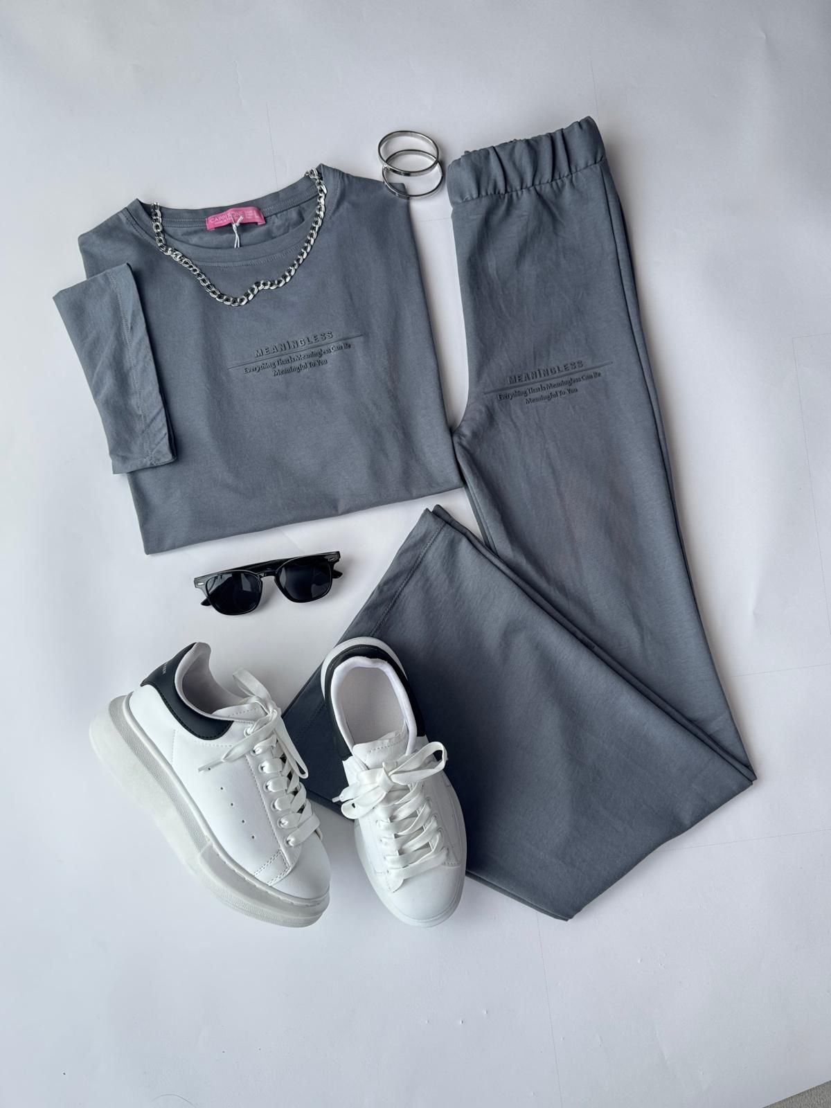 K075 Gri Destınatıon Is Done Yazı Enjeksiyon Baskılı İkili Takım Beyaz SMB Şeritli Sneaker Üçlü Kombin