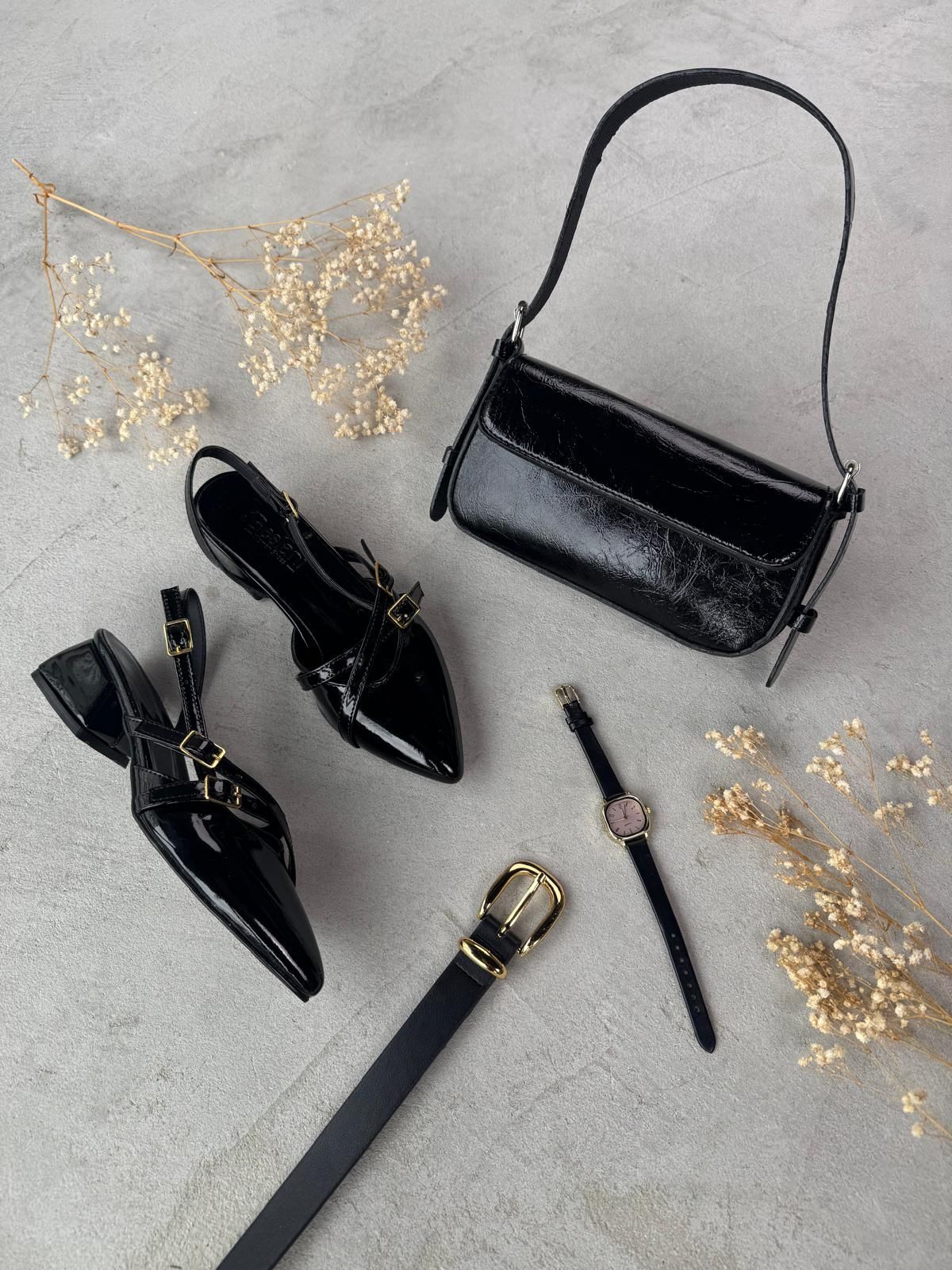 K092 Siyah Rugan Topuklu Ayakkabı Rugan Kol Çantası Gold Tokalı Kemer Siyah Kordonlu Kol Saati Dörtlü Set