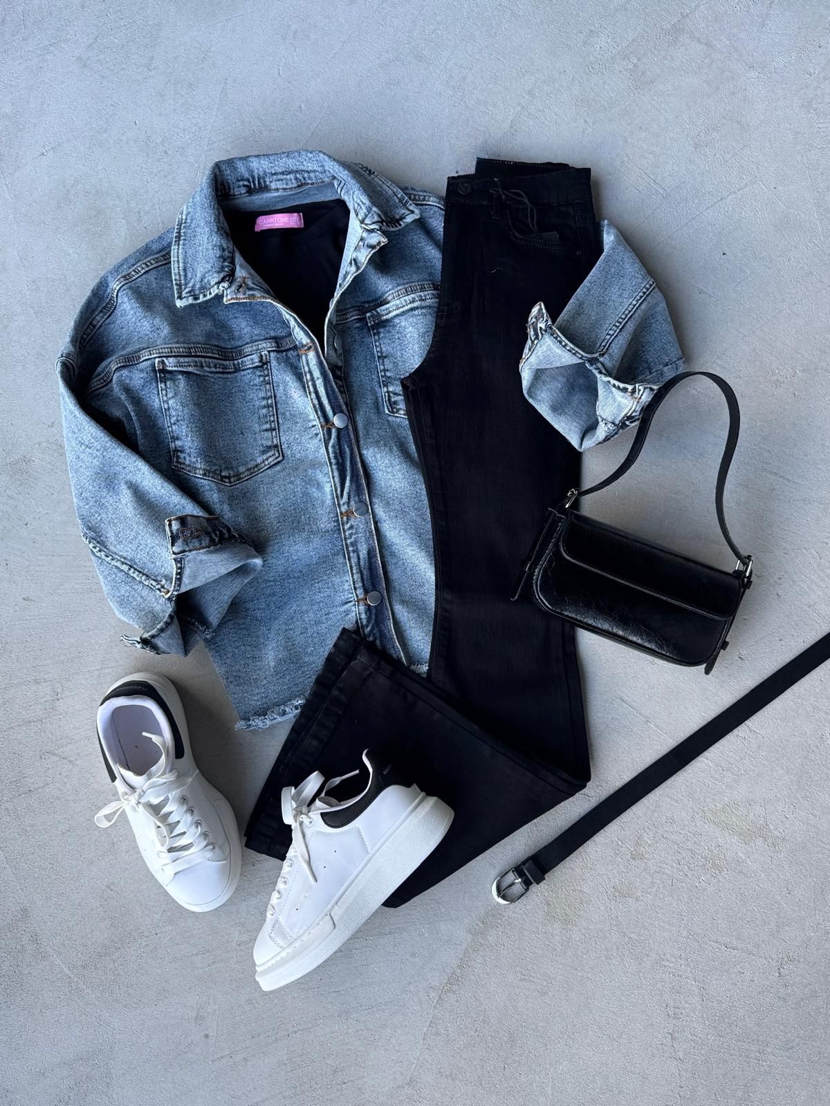 K097 Mavi Kesik Model Kot Ceket Siyah İspanyol Jean Siyah Rugan Kemer Detaylı Omuz Çantası Siyah Sılver Tokalı Kemer Beyaza Siyah Detaylı Yüksek Taban Suni Deri Muadil Snekaer Beşli Kombin