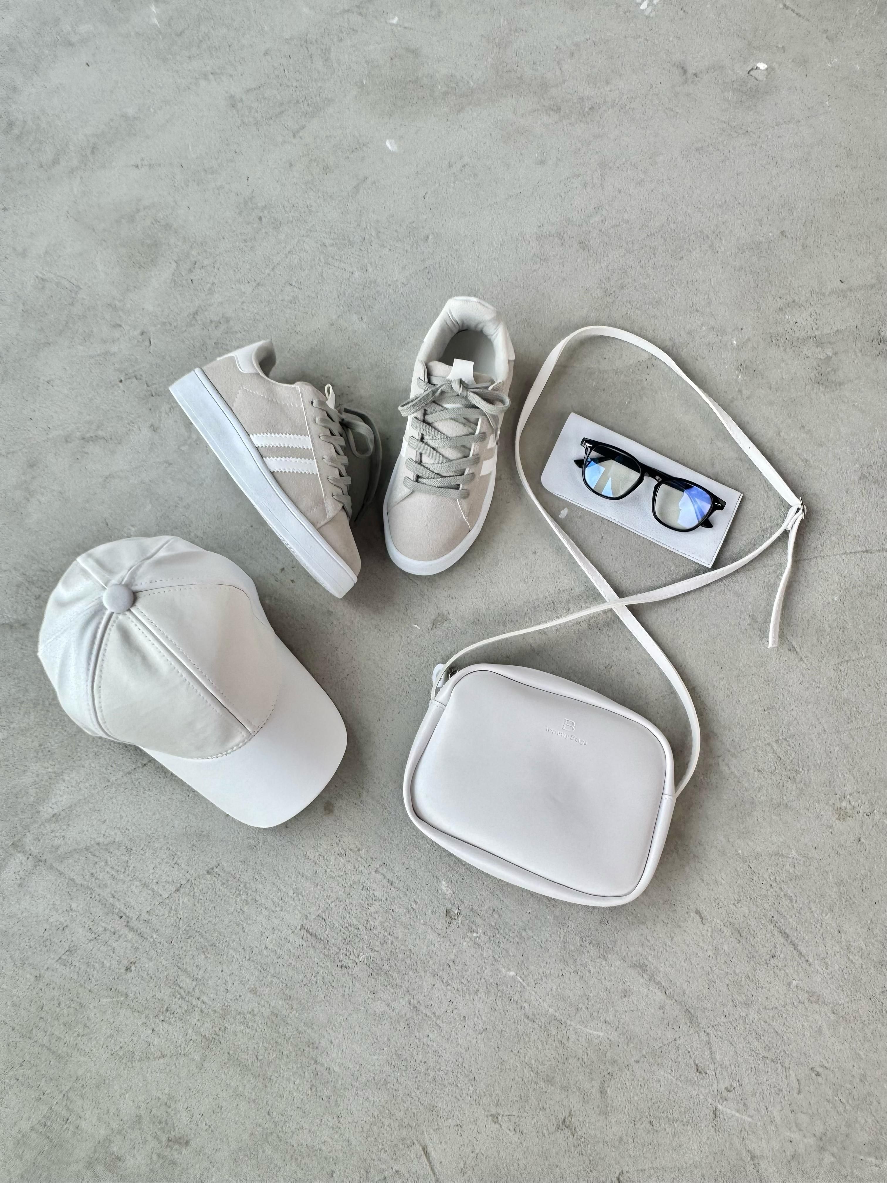 K100 Gri Süet Şeritli Muadil Sneaker Beyaz Mini Kare Suni Deri Çanta Beyaz Suni Deri Cap Şapka Siyah Şeffaf Cam Kalın Çerçeveli İmaj Gözlüğü Dörtlü Kombin