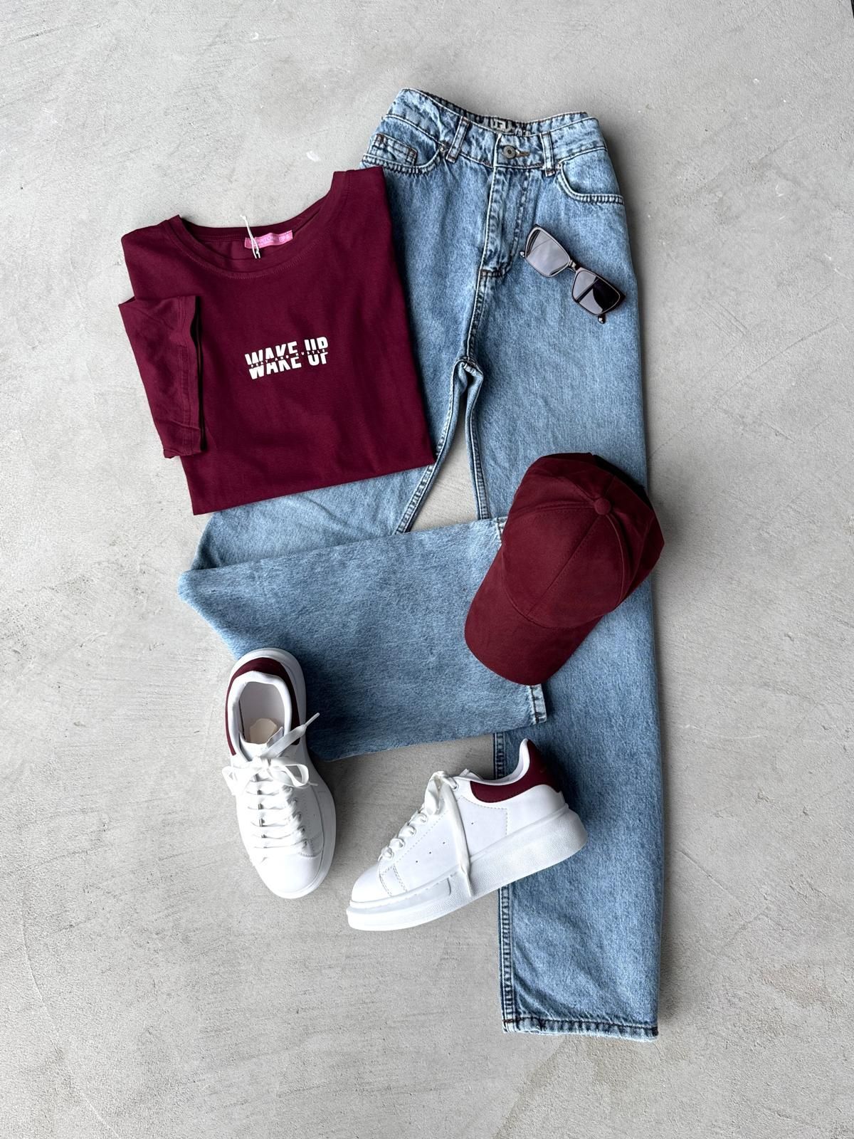 K105 Bordo Wake Up Yazılı Bisiklet Yaka Tişört Buz Mavisi Taşlamalı Momfit Jean Beyaza Bordo Detaylı Yüksek Taban Muadil Snekaer Bordo Kumaş Cap Şapka Dörtlü Kombin