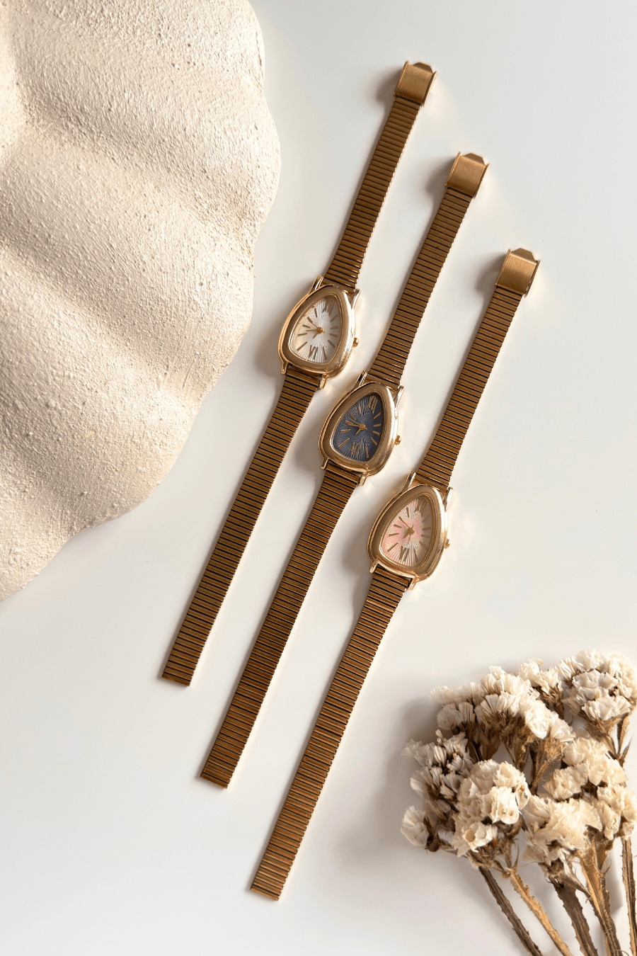 Modern geometrinin keskin hatlarını, klasik saatçiliğin zarafetiyle birleştirdik. Bu özel model, alışılmışın dışındaki üçgen kasa tasarımı ve mücevher işçiliğini anımsatan sıralı segmentli kordonuyla stilinize sofistike bir imza atıyor.