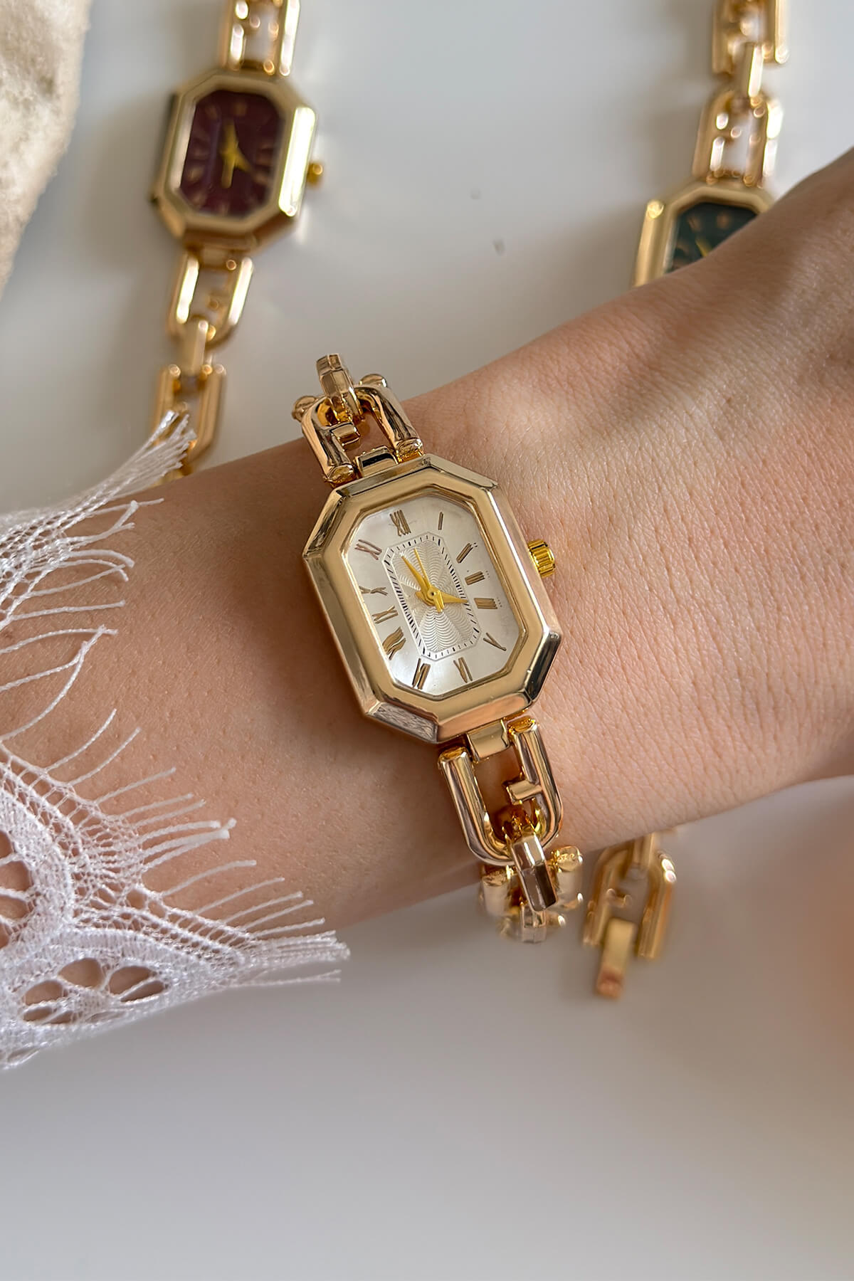 Bazı aksesuarlar sadece tamamlar, bazıları ise hikayeyi baştan yazar. Sekizgen kasa yapısıyla kuralları bozan bu model, kalın zincir formuyla saatten çok bir "it-piece" bileklik duruşuna sahip. Minimalist kadranı ve ağırbaşlı renk seçenekleriyle (Bordo, Zümrüt, Beyaz) stilinde keskin bir imza arayanlar için. Karmaşadan uzak ama iddialı.