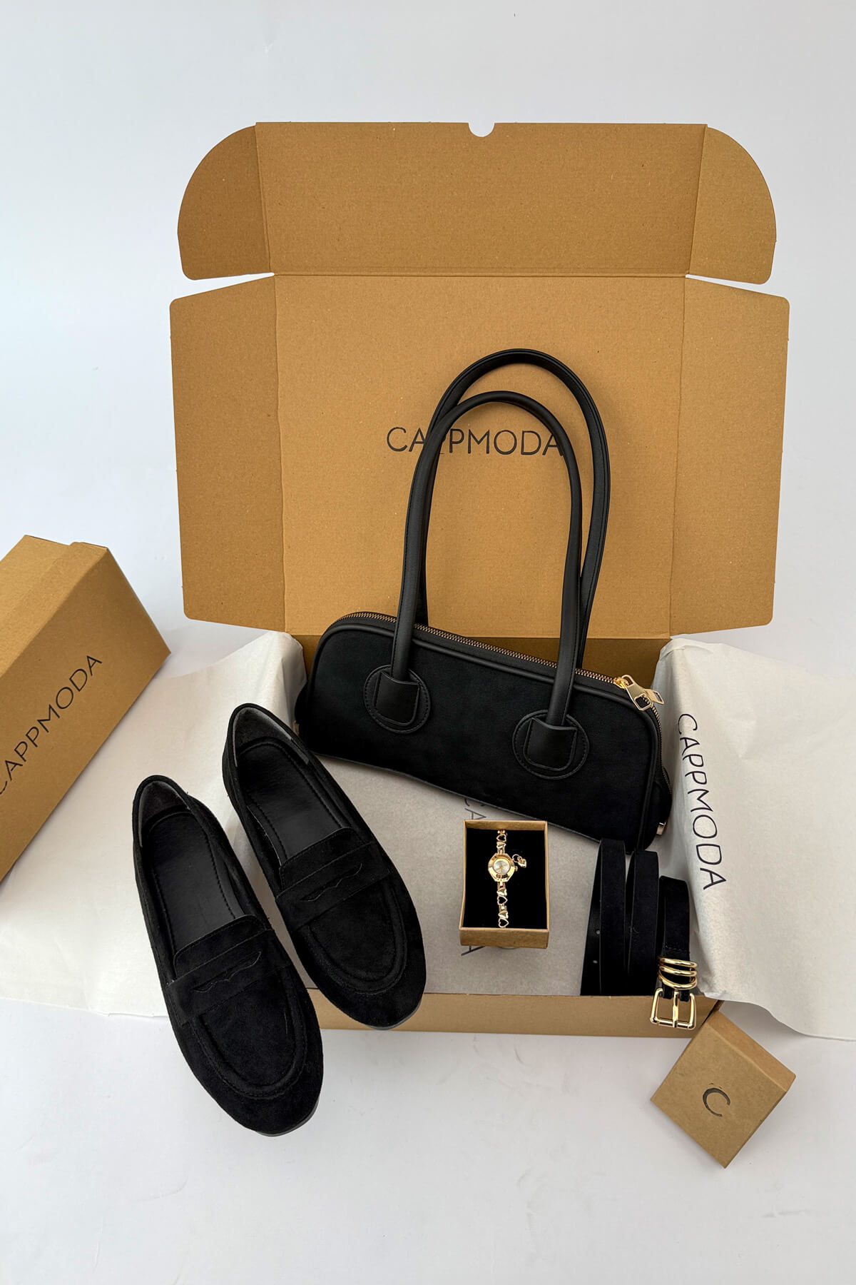 "Sessiz lüks" akımının en rafine temsilcisi olan Lofur Seti, nubuk ve süetin kadifemsi dokusunu maskülen loafer estetiğiyle en feminen şekilde birleştiriyor. 32 cm uzunluğundaki minimalist nubuk çanta ve üçlü gold köprü detayıyla parlayan 106 cm süet kemer, stilinize aristokrat bir derinlik katarken; tam kalıp loaferlar gün boyu kusursuz bir konfor vadediyor. Sete eşlik eden gold zincir kordonlu vintage mücevher saat, bu özel kürasyonu zamansız bir şıklık imzasına dönüştürerek gardırobunuzun en güçlü yatırımı olmaya ada
