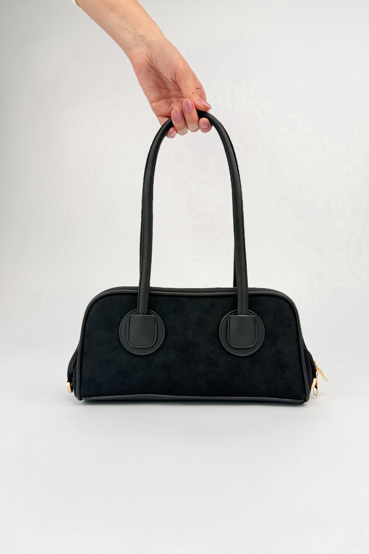 Çanta: Üst segment yumuşak nubuk yüzey, dairesel askı bağlantı detayları ve güvenli metal fermuar (32x15x7 cm).