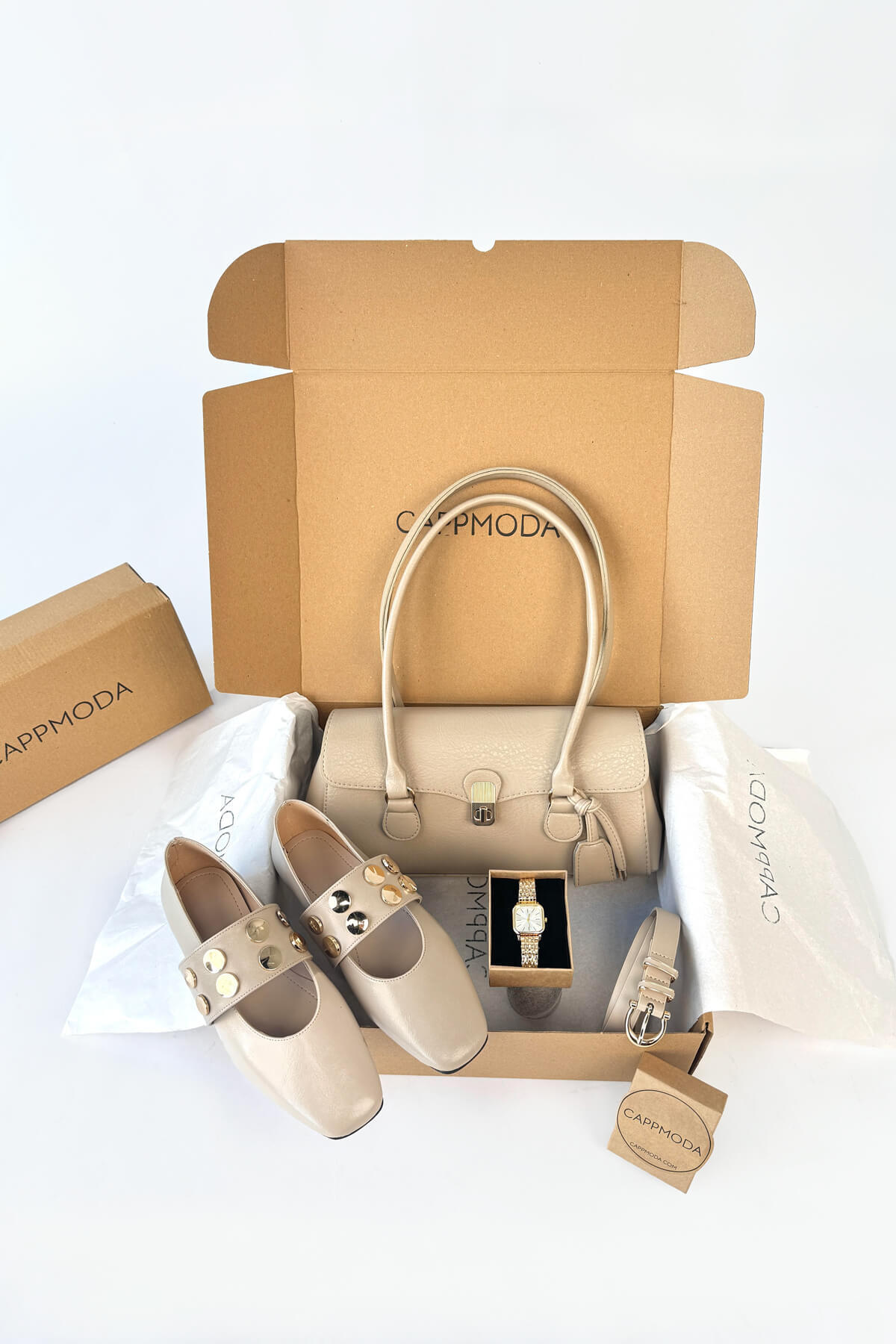 Stilini bir adım öteye taşımak isteyen kadınlar için özel olarak küratörlüğünü yaptığımız Lovren Set, zarafeti ve fonksiyonelliği bir arada sunuyor. Set içerisinde yer alan dokulu deri yüzeyli omuz çantası ve altın zımba detaylarıyla hareketlendirilmiş küt burun babetler, zamansız kahve tonuyla kusursuz bir uyum yakalıyor. Takımı tamamlayan şık deri kemer ve gold detaylı klasik kol saati, her kombinine sofistike bir dokunuş katmak için tasarlandı. Günlük şıklığınızdan ofis stilinize kadar her anınıza eşlik edecek bu dörtlü set, Cappmoda kalitesiyle gardırobunuzun en değerli parçası olmaya aday.