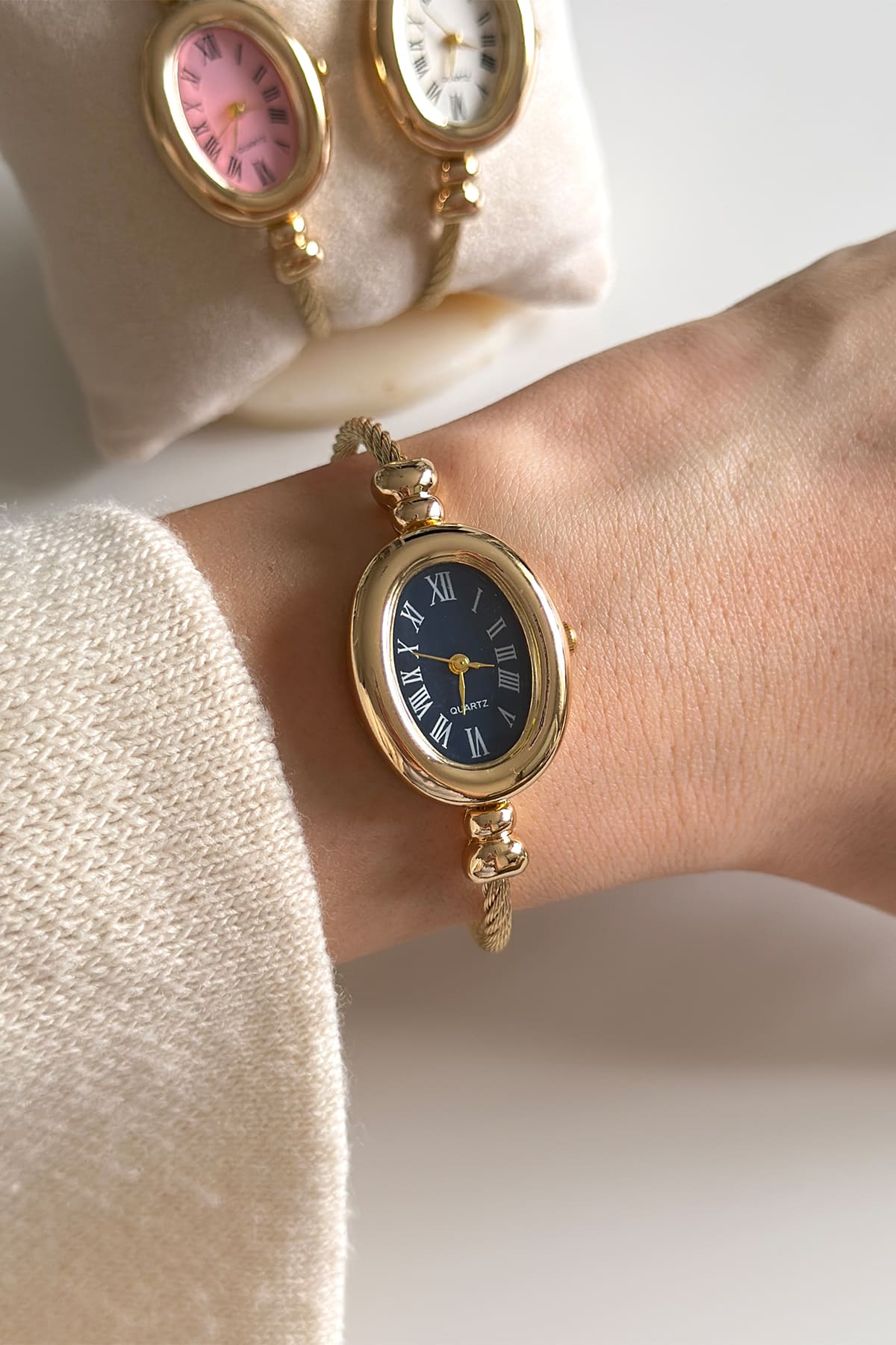 Lucia , pembe kadranın romantik tonlarını gold rengin ihtişamıyla birleştirerek bileğinizde masalsı bir duruş sergiliyor. Özel tasarım burgu detaylı kelepçe kordonu, saati klasik bir zaman ölçerden çok şık bir bilekliğe dönüştürüyor. Oval kasanın yumuşak hatları ve Roma rakamlı kadranıyla vintage ruhunu yansıtan bu model, en sade kombinlerinize bile anında sofistike bir hava katmak için tasarlandı.