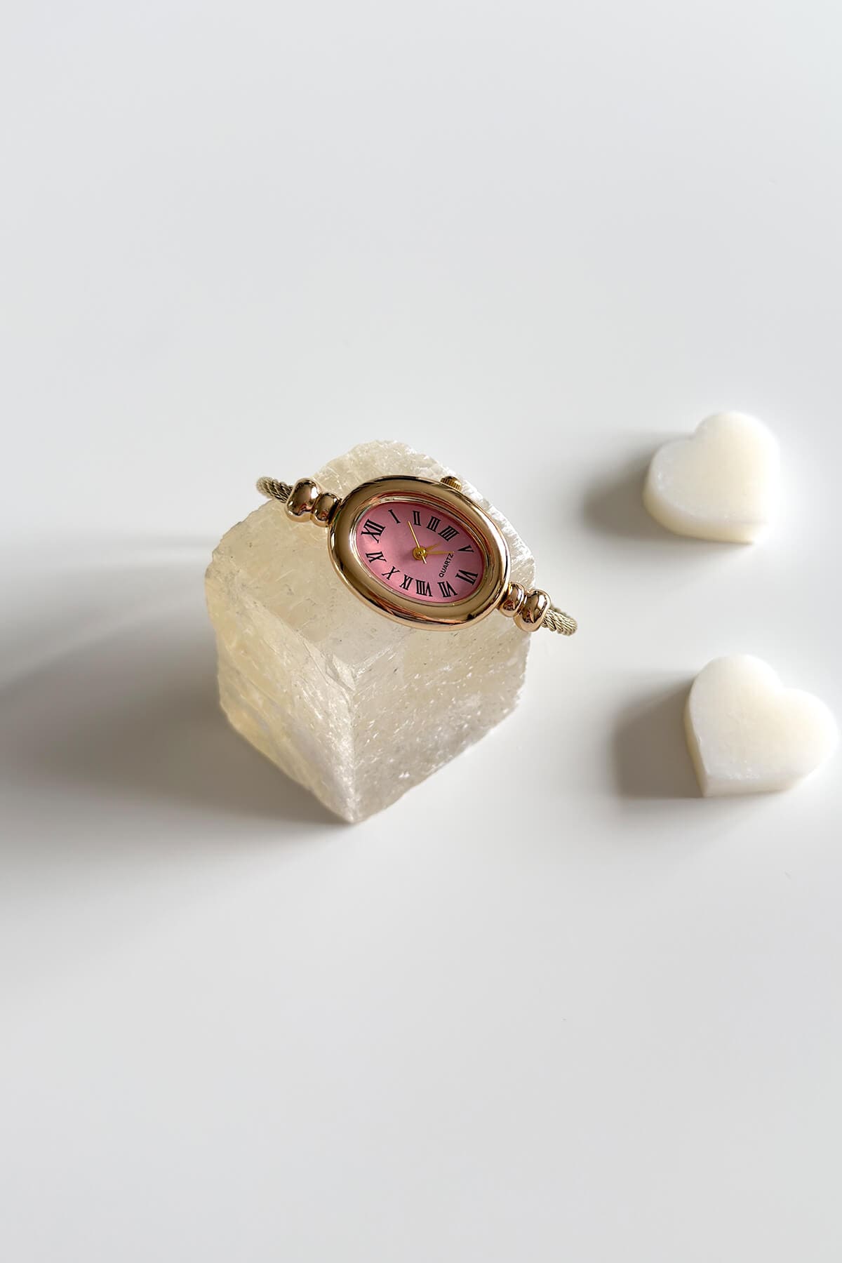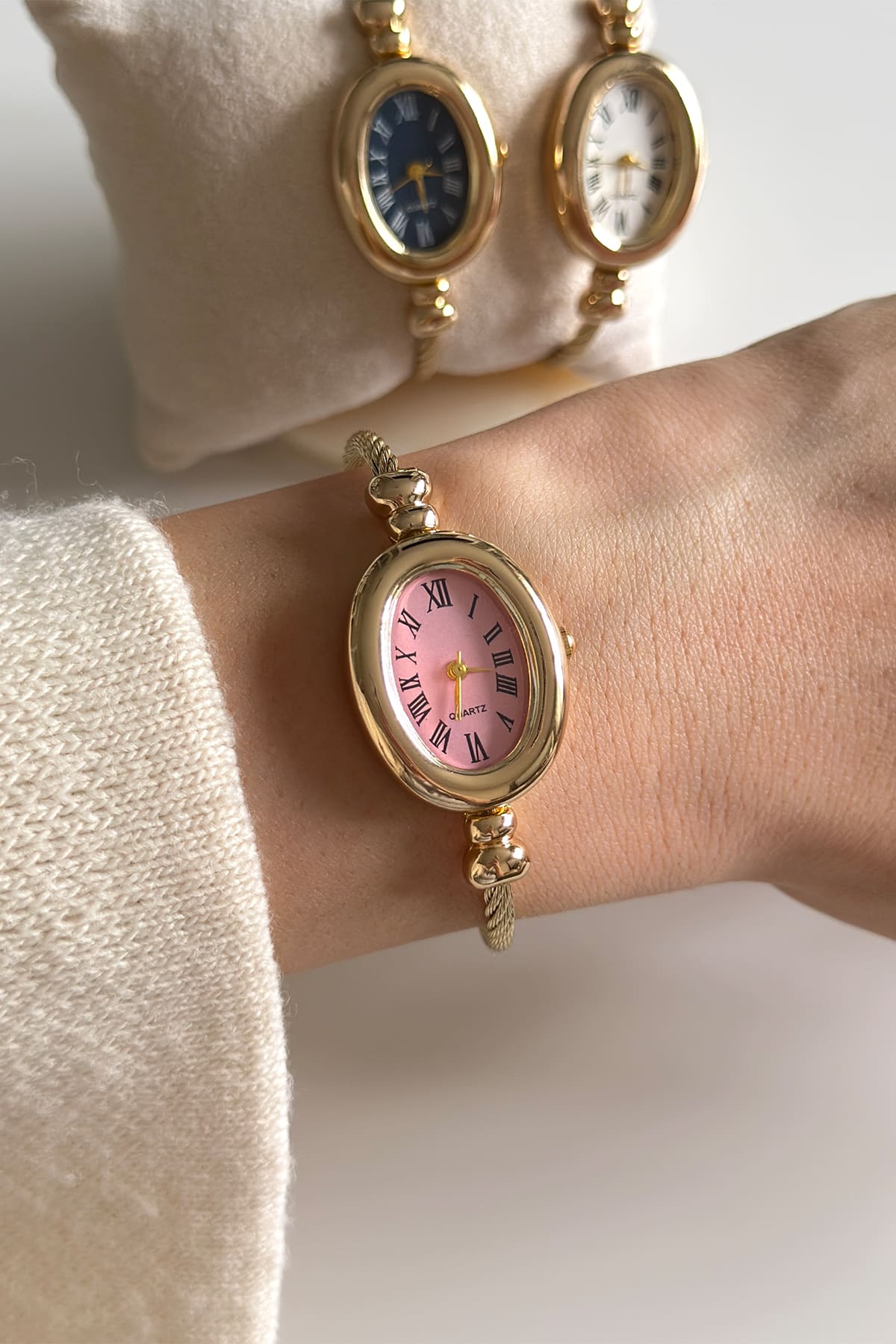 Lucia , pembe kadranın romantik tonlarını gold rengin ihtişamıyla birleştirerek bileğinizde masalsı bir duruş sergiliyor. Özel tasarım burgu detaylı kelepçe kordonu, saati klasik bir zaman ölçerden çok şık bir bilekliğe dönüştürüyor. Oval kasanın yumuşak hatları ve Roma rakamlı kadranıyla vintage ruhunu yansıtan bu model, en sade kombinlerinize bile anında sofistike bir hava katmak için tasarlandı.