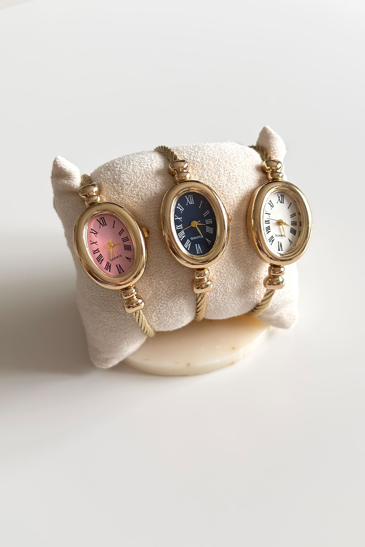 Lucia , pembe kadranın romantik tonlarını gold rengin ihtişamıyla birleştirerek bileğinizde masalsı bir duruş sergiliyor. Özel tasarım burgu detaylı kelepçe kordonu, saati klasik bir zaman ölçerden çok şık bir bilekliğe dönüştürüyor. Oval kasanın yumuşak hatları ve Roma rakamlı kadranıyla vintage ruhunu yansıtan bu model, en sade kombinlerinize bile anında sofistike bir hava katmak için tasarlandı.