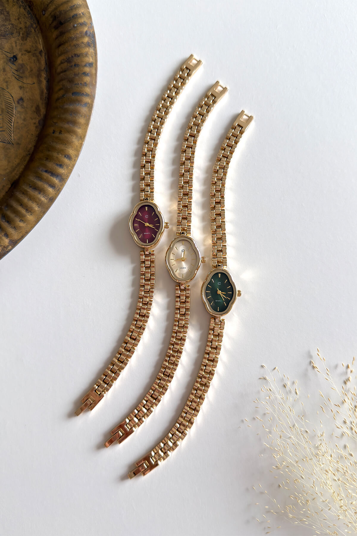 Nostaljik esintileri modern bir zarafetle buluşturun! Bu özel seri, retro tarzı yansıtan dikdörtgen kasa yapısı ve bileği zarifçe saran ince ikili zincir kordonuyla dikkat çekiyor. Klasik Roma rakamı detayları (bazı modellerde) ve renkli kadran seçenekleriyle hem bir saat hem de antika değerinde bir takı şıklığı sunuyor.