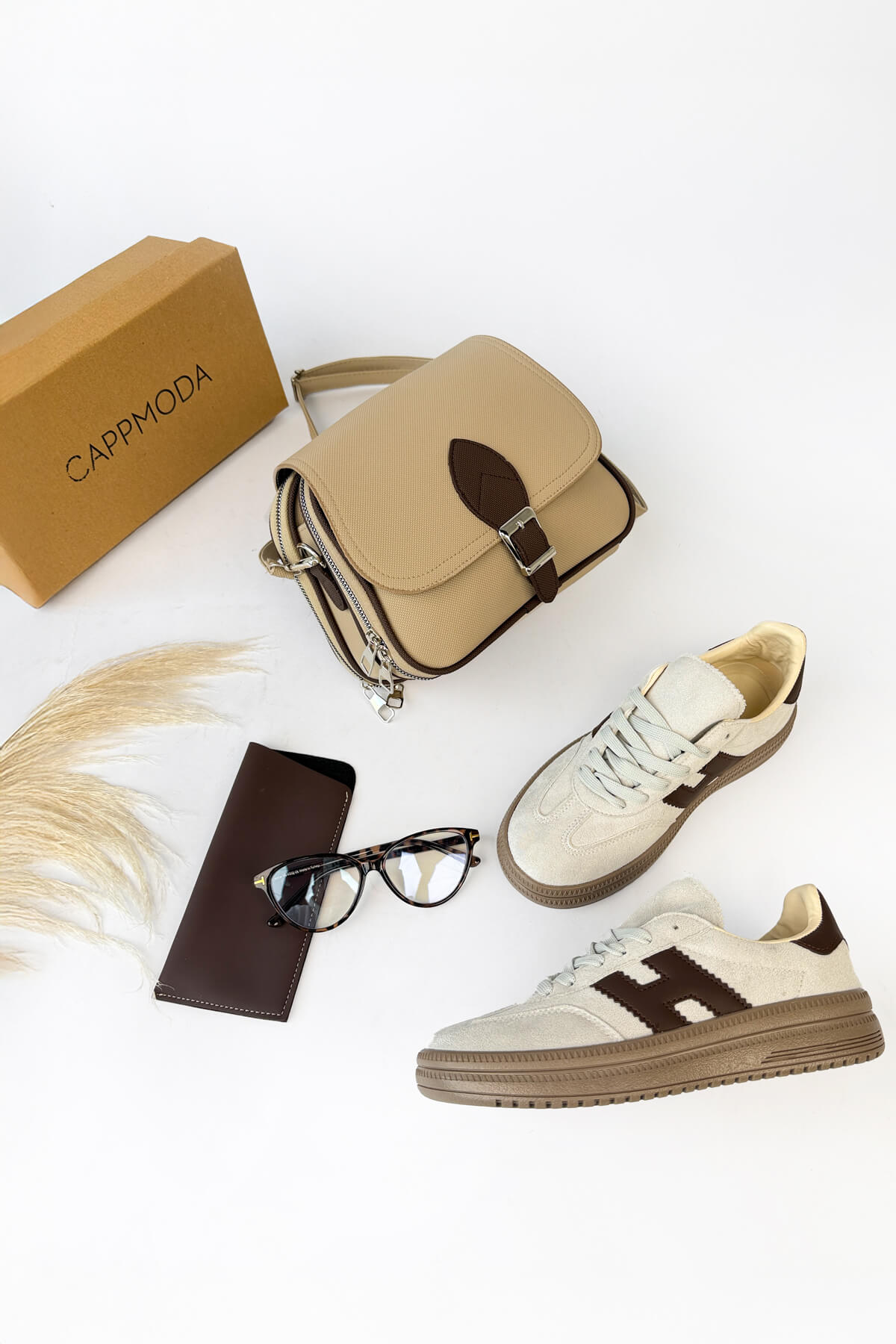 ahmetsiz şıklığın yeni tanımı olan Nola Serisi, taba renginin sıcaklığını modern tasarım detaylarıyla buluşturuyor. Yüksek kaliteli süet dokusu ve kontrast krem panelleriyle dikkat çeken sneakerlar, adımlarınıza hem konfor hem de sofistike bir hava katıyor. Setin tamamlayıcısı olan çok bölmeli omuz çantası ve şık gözlük kılıfı, günlük stilinizde ihtiyaç duyduğunuz fonksiyonelliği kusursuz bir estetikle sunuyor. "Tok duruşlu" yapısı ve zamansız tasarımıyla Nola, şehirli kadının favori kombin parçası olmaya aday.