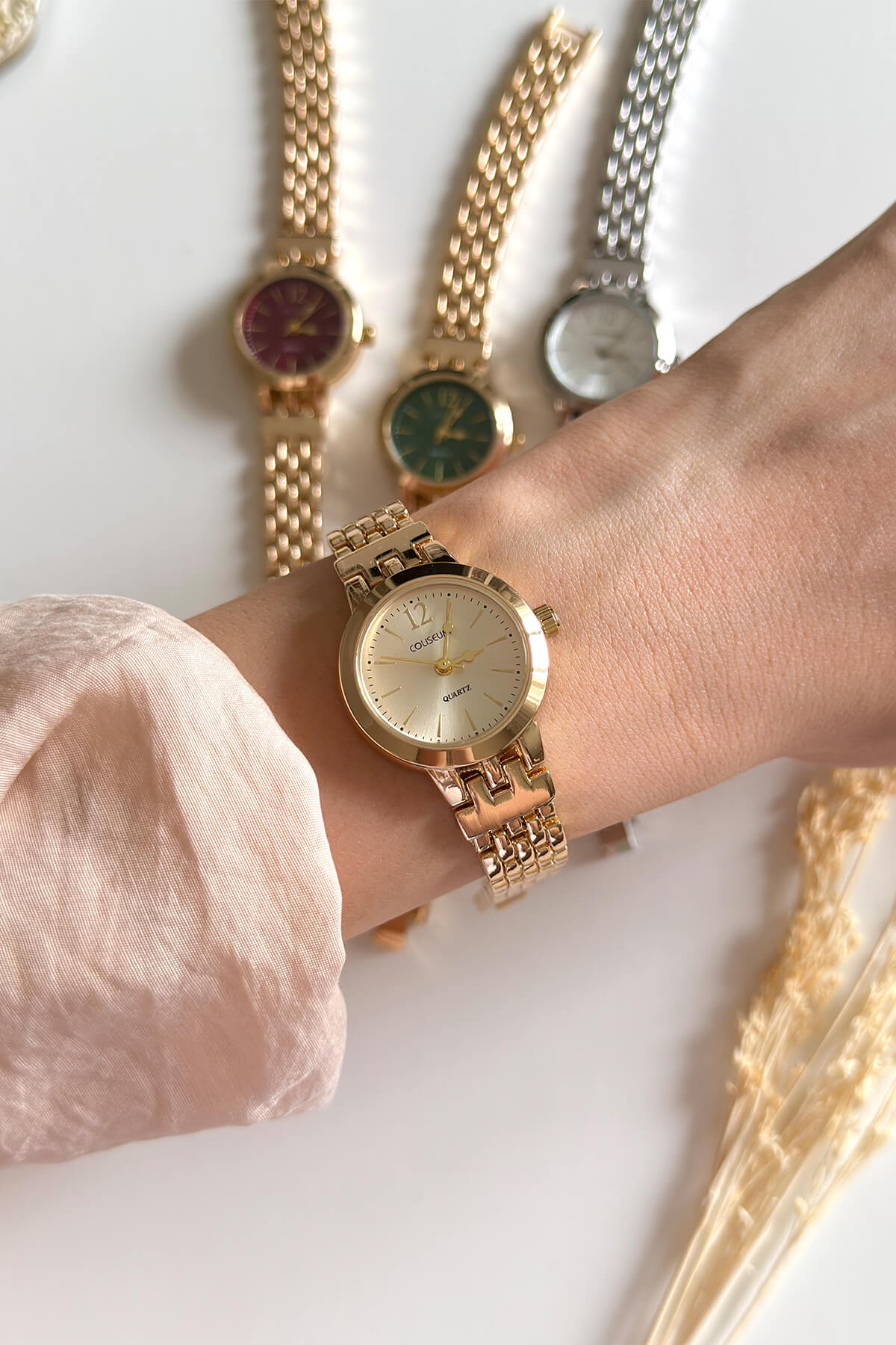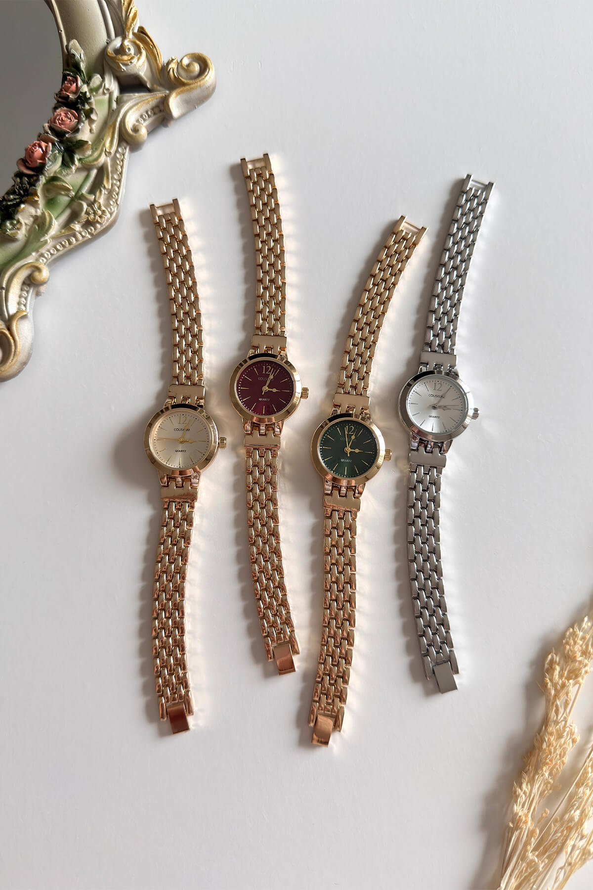 Zengin renk seçenekleri ve özel dokulu kordonuyla şıklığı yeniden tanımlayın! Bu koleksiyon, hasır örgüyü andıran pirinç kordon yapısıyla bilekte yumuşak ve konforlu bir his bırakırken, görsel olarak dolu dolu bir görünüm sunuyor. Zümrüt yeşili, mürdüm, klasik gümüş ve şampanya tonlarındaki kadranlar, her zevke hitap eden bir seçki oluşturuyor.