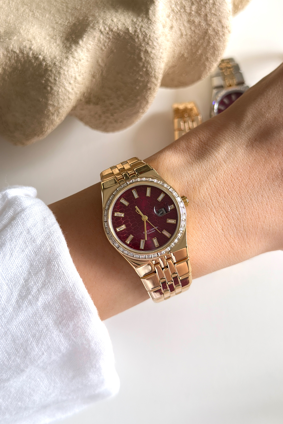 Zarafeti ışıltıyla buluşturun. Çerçevesini çevreleyen kristal taş detayları ve özel dokulu petek kadran tasarımıyla bu seri, tüm bakışları bileğinize çekecek. Hem çift renkli gümüş-altın hem de tam gold kordon seçenekleriyle sunulan bu koleksiyon, lüks bir aksesuar deneyimi arayanlar için tasarlandı. Derin bordo, şampanya gold ve soft pudra kadran alternatifleriyle her anınıza göz alıcı bir şıklık katın.