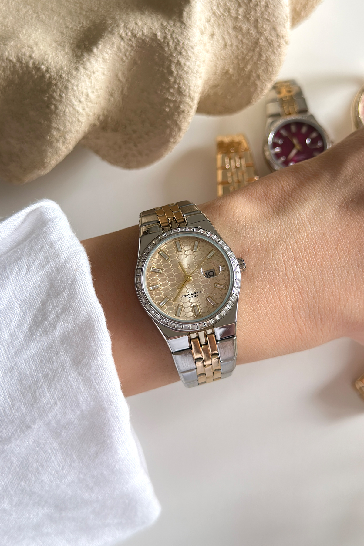 Zarafeti ışıltıyla buluşturun. Çerçevesini çevreleyen kristal taş detayları ve özel dokulu petek kadran tasarımıyla bu seri, tüm bakışları bileğinize çekecek. Hem çift renkli gümüş-altın hem de tam gold kordon seçenekleriyle sunulan bu koleksiyon, lüks bir aksesuar deneyimi arayanlar için tasarlandı. Derin bordo, şampanya gold ve soft pudra kadran alternatifleriyle her anınıza göz alıcı bir şıklık katın.
