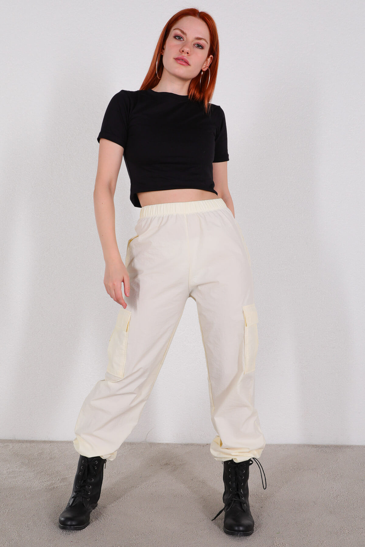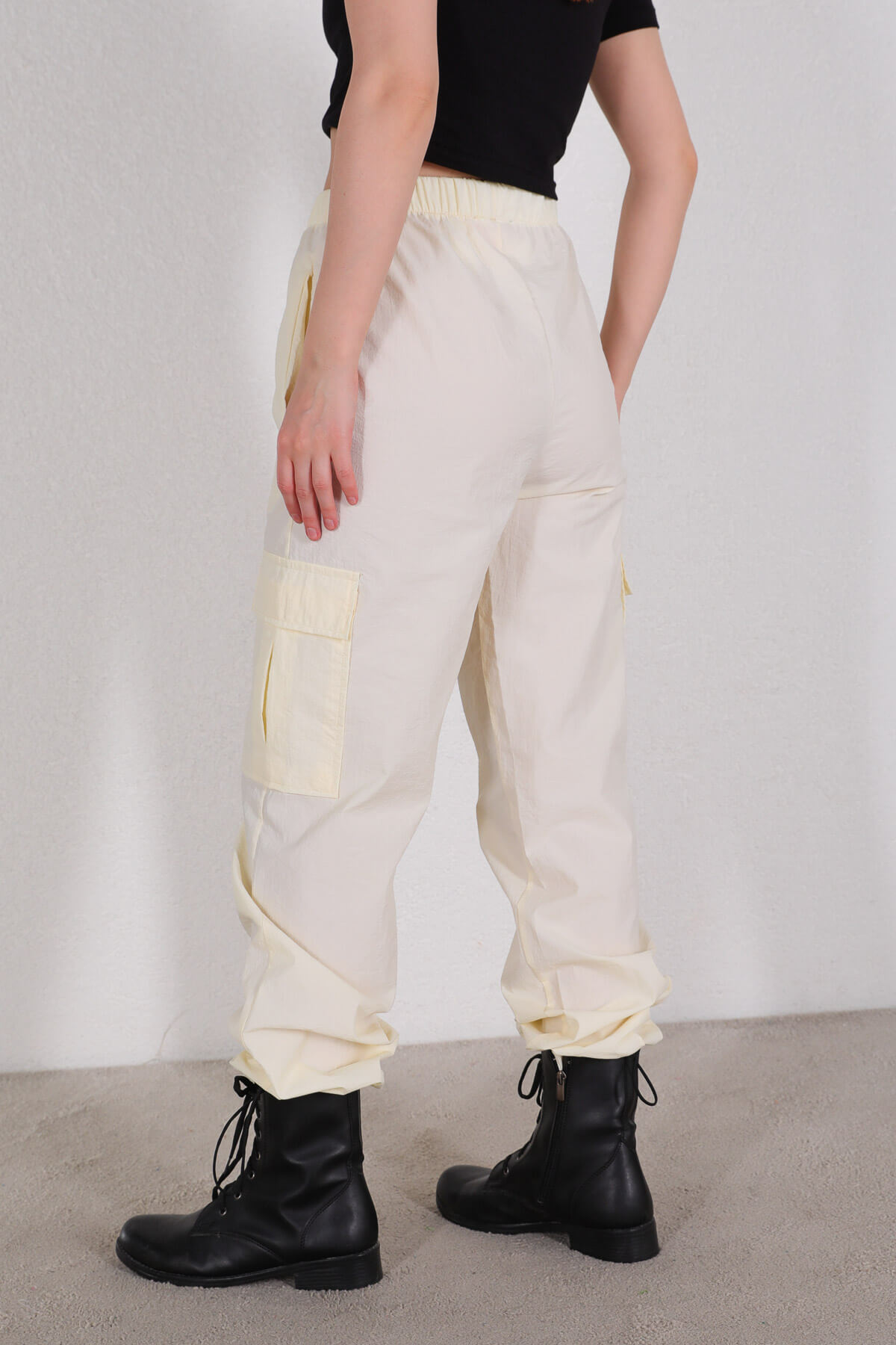 PNT-07327 Ekru Paça Lastikli Kargo Cepli Paraşüt Pantolon