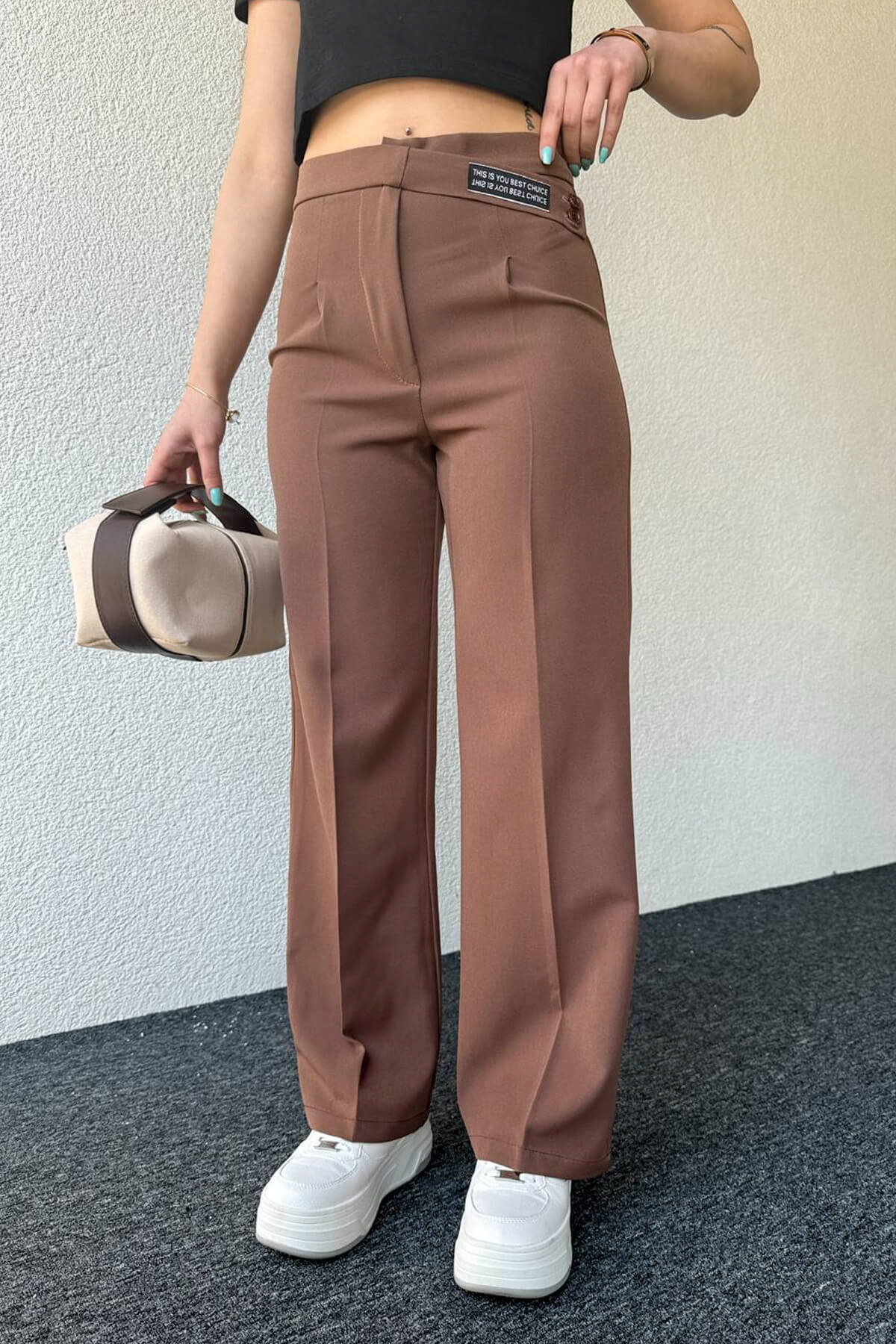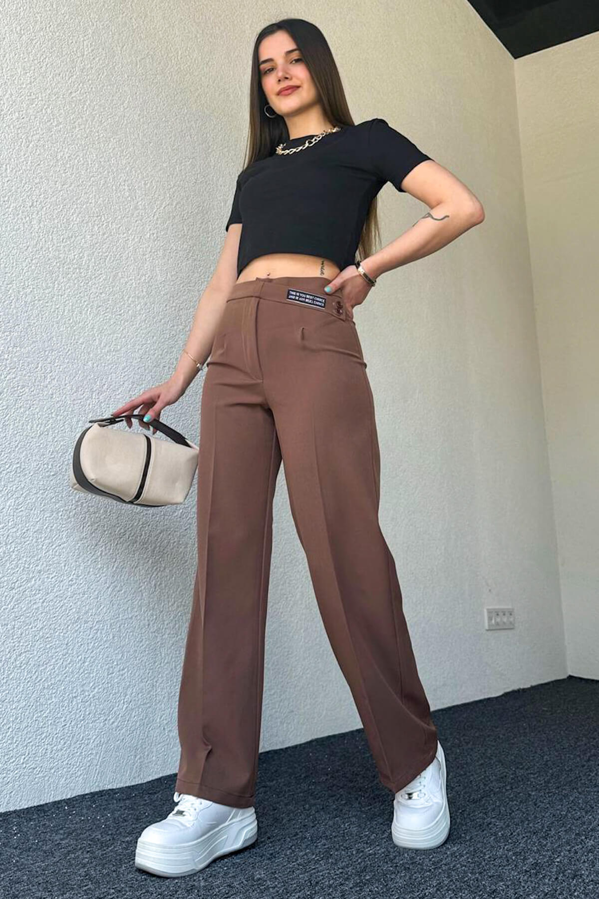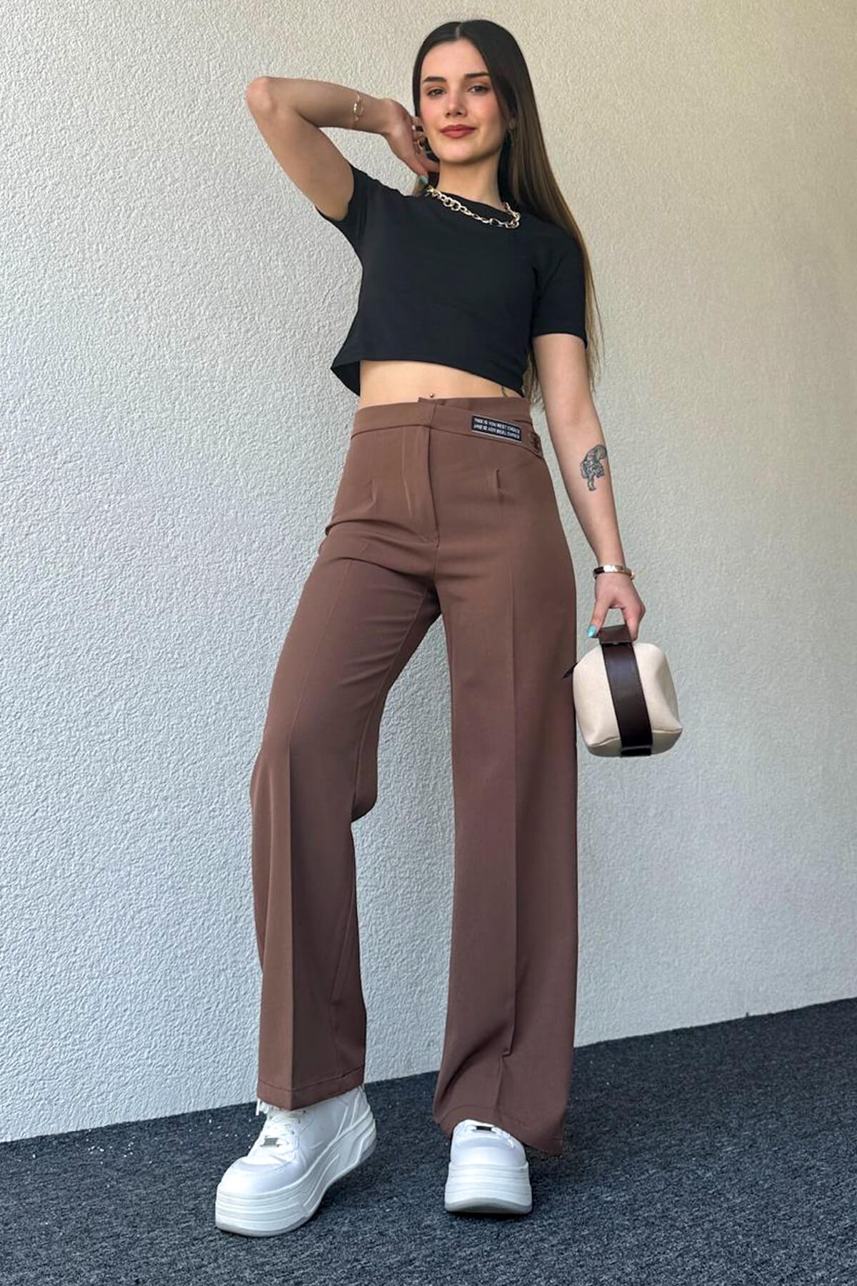 PNT-07367 Kahverengi Bel Etiket Detaylı Palazzo Kumaş Pantolon