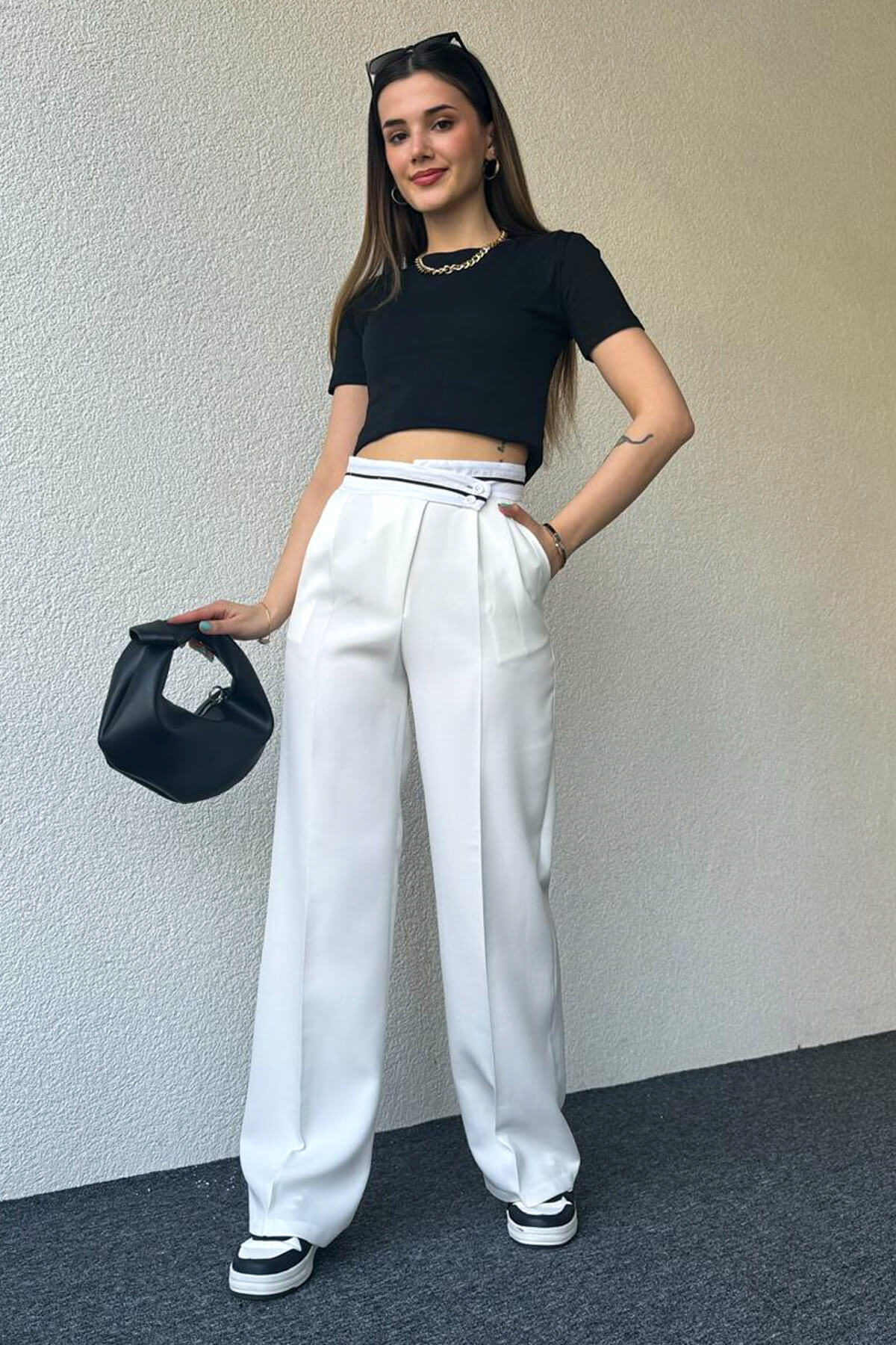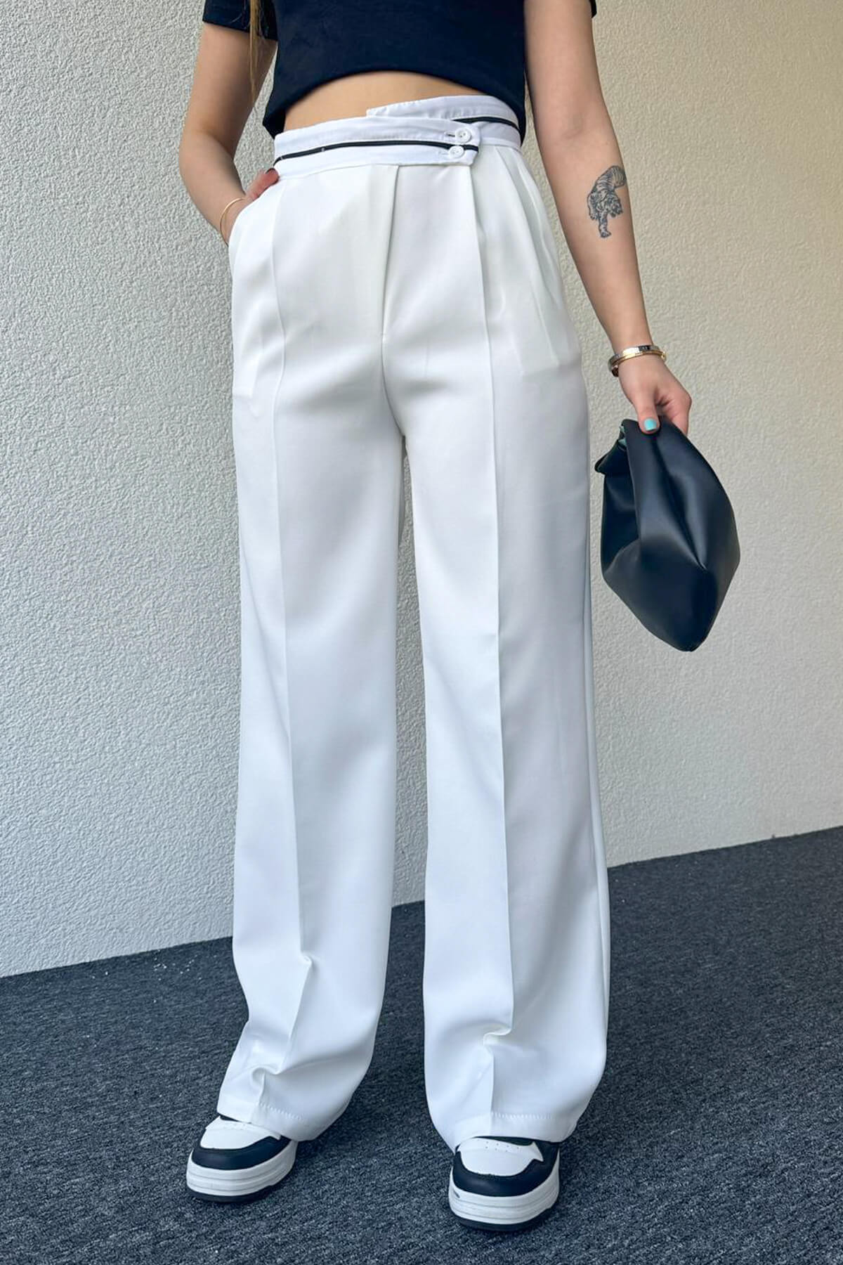 PNT-07373 Beyaz Bel Şerit Ve Düğme Detaylı Pantolon