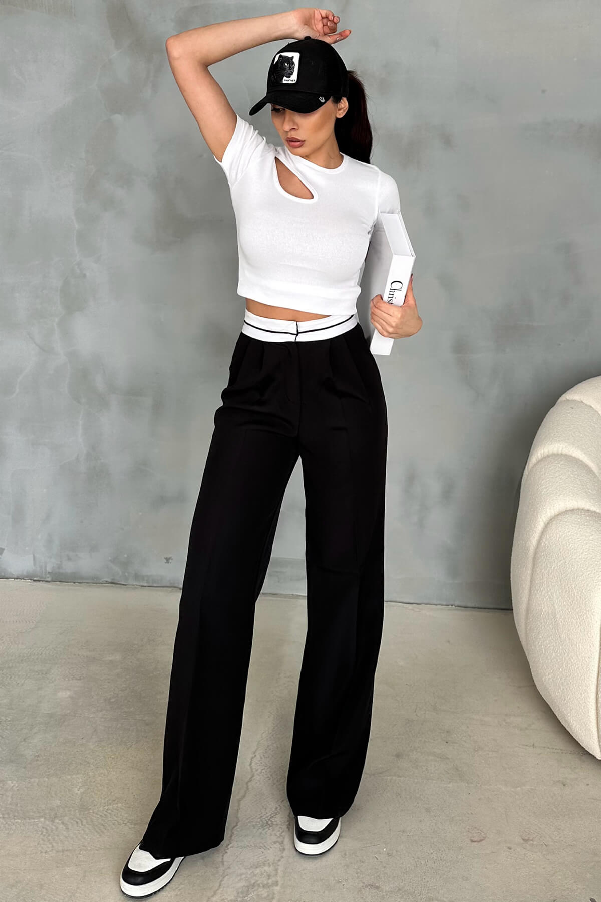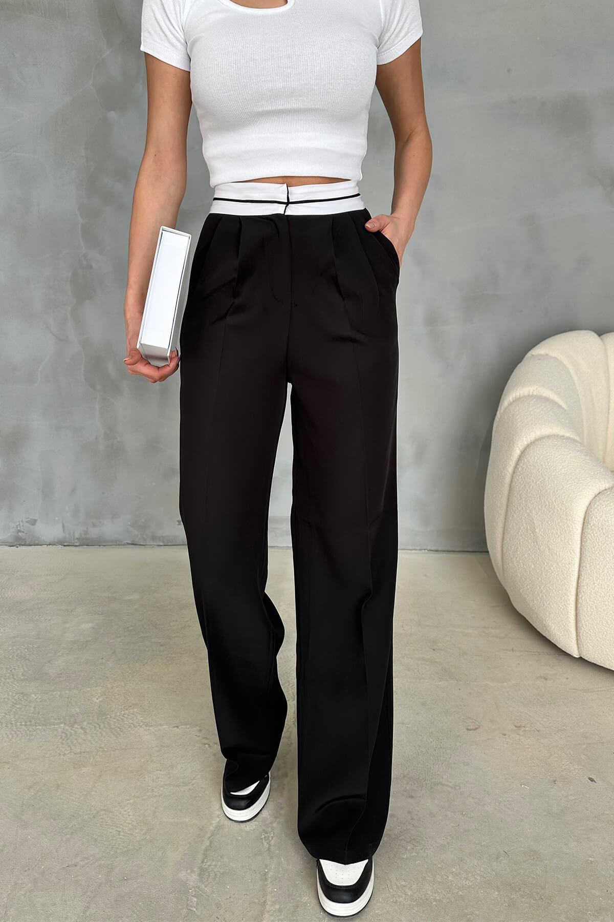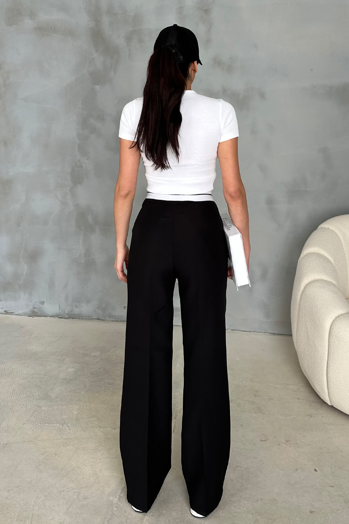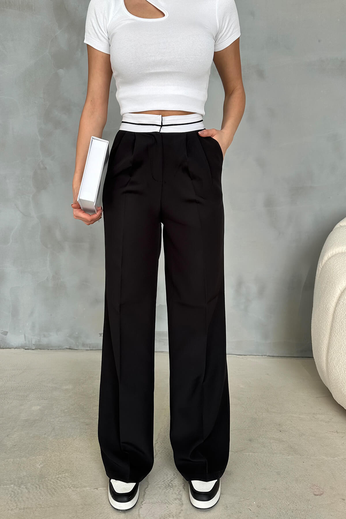PNT-07375 Siyah Bel Şerit Detaylı Tek Düğmeli Palazzo Pantolon