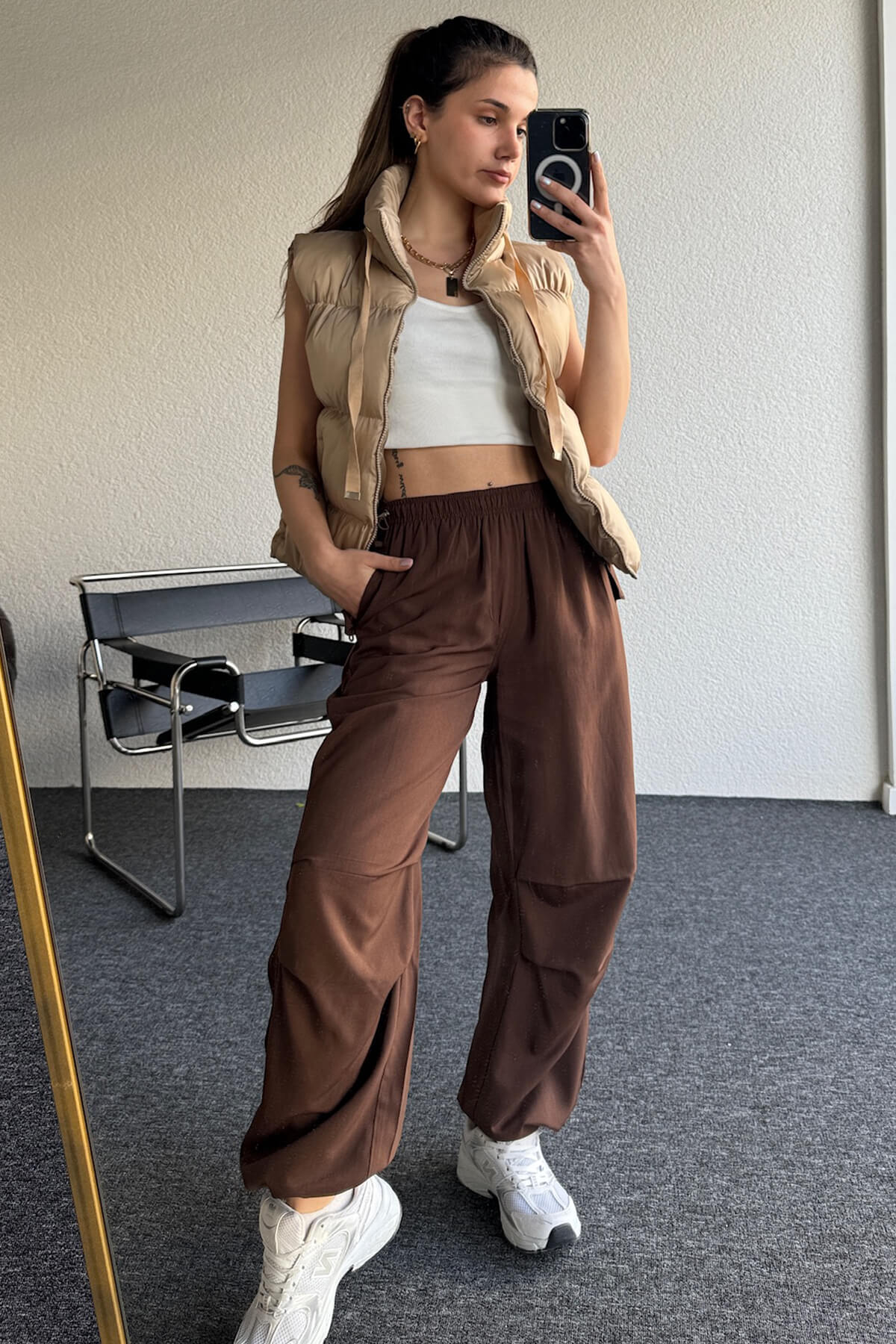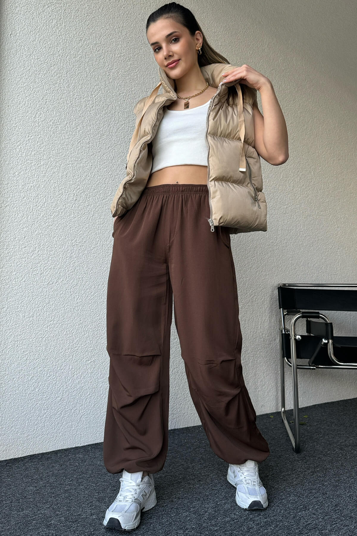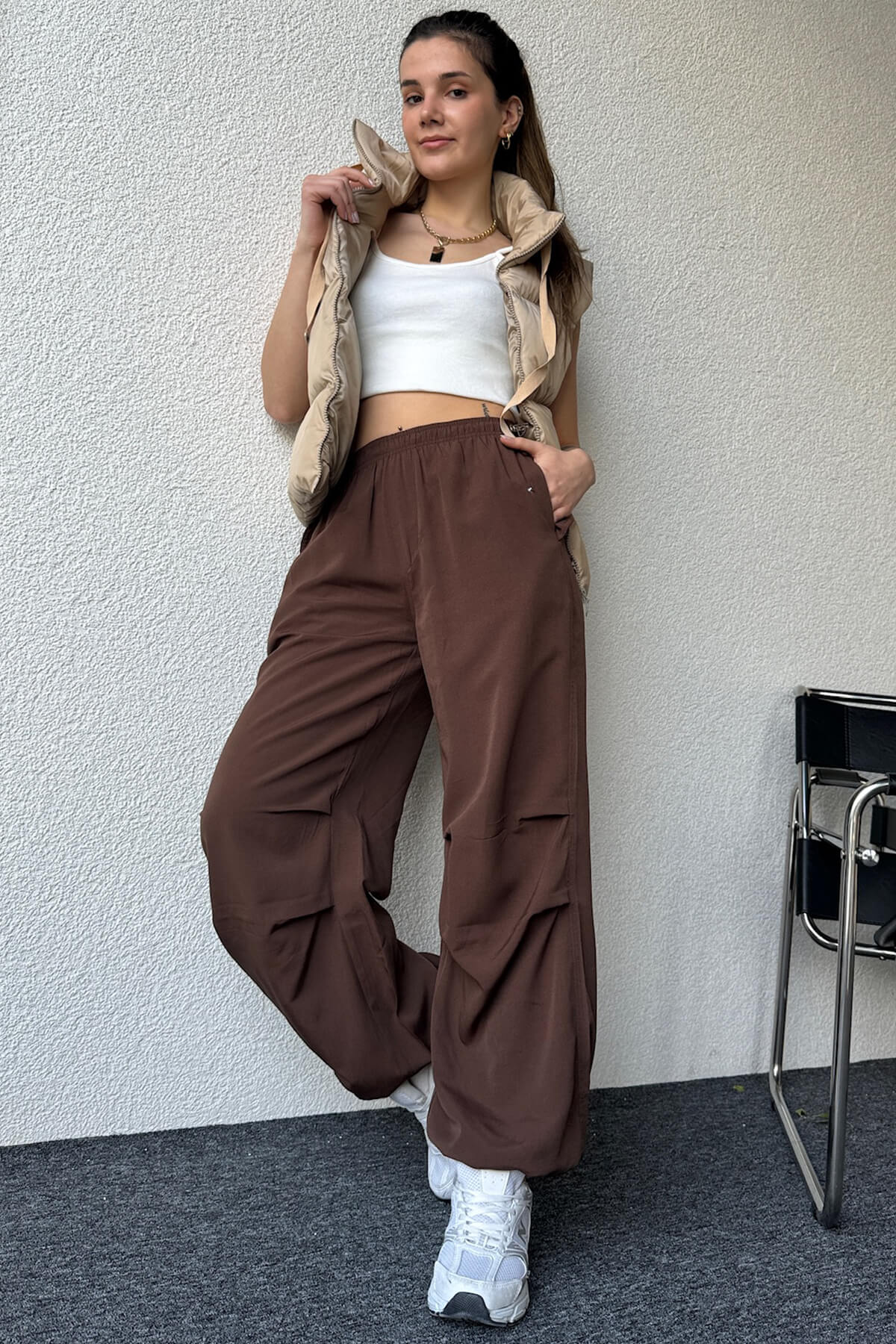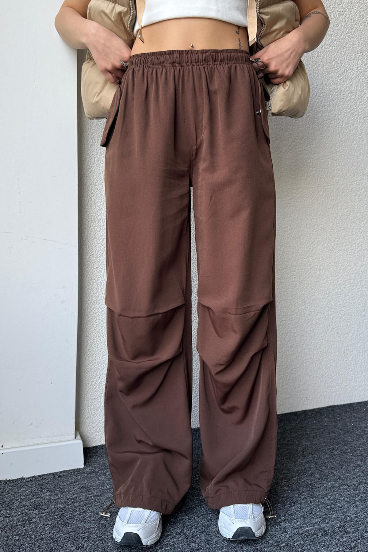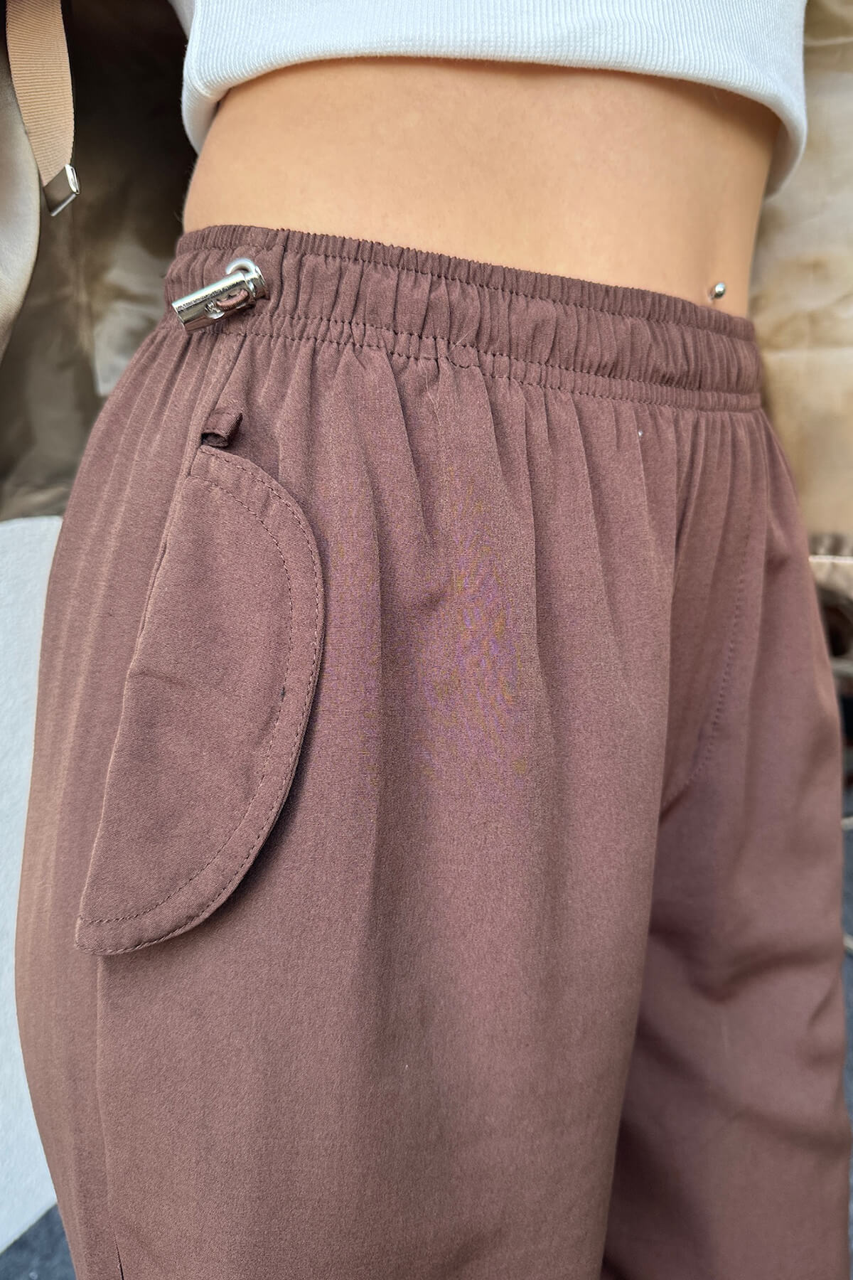PNT-07376 Kahverengi Bel Ve Paça İpli Cepli Salaş Pantolon