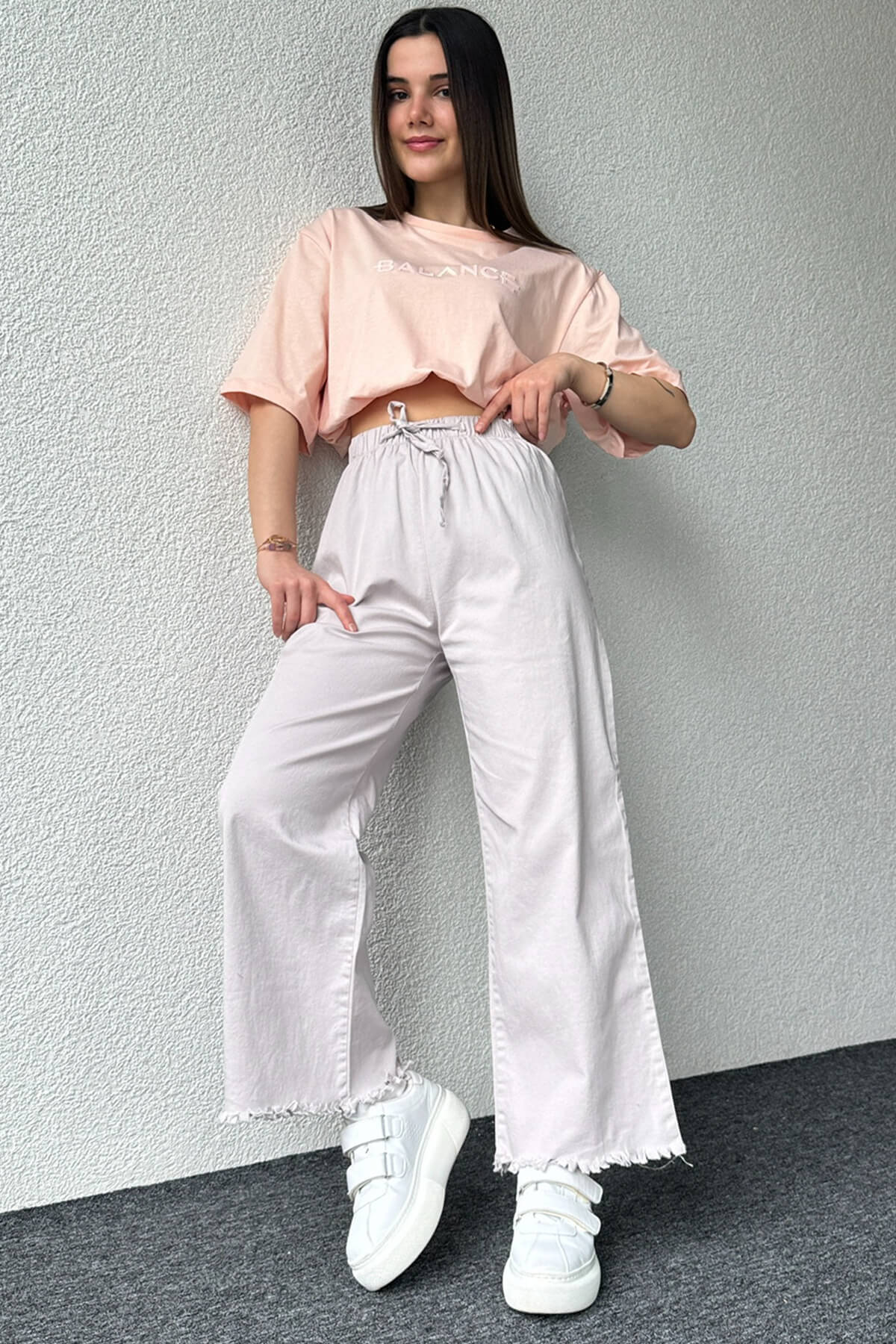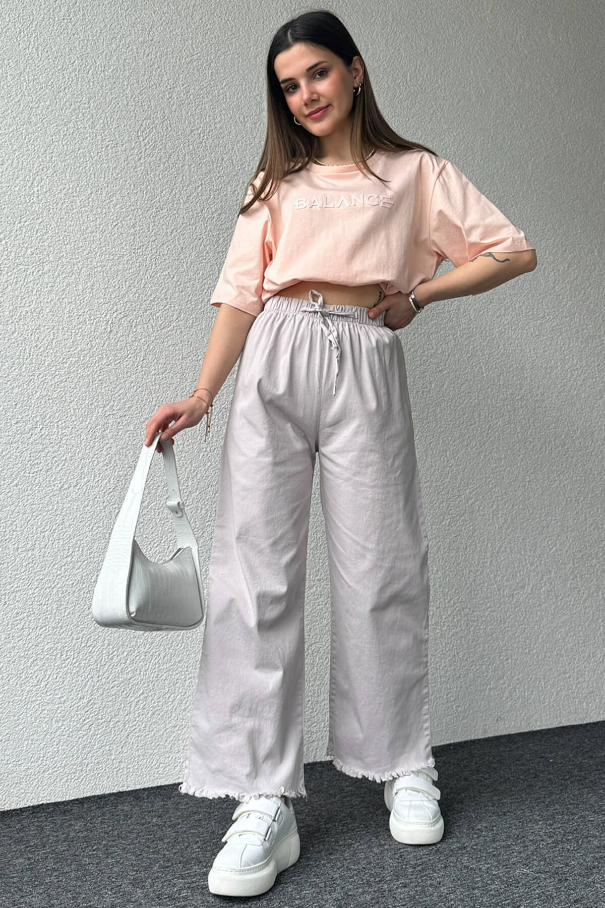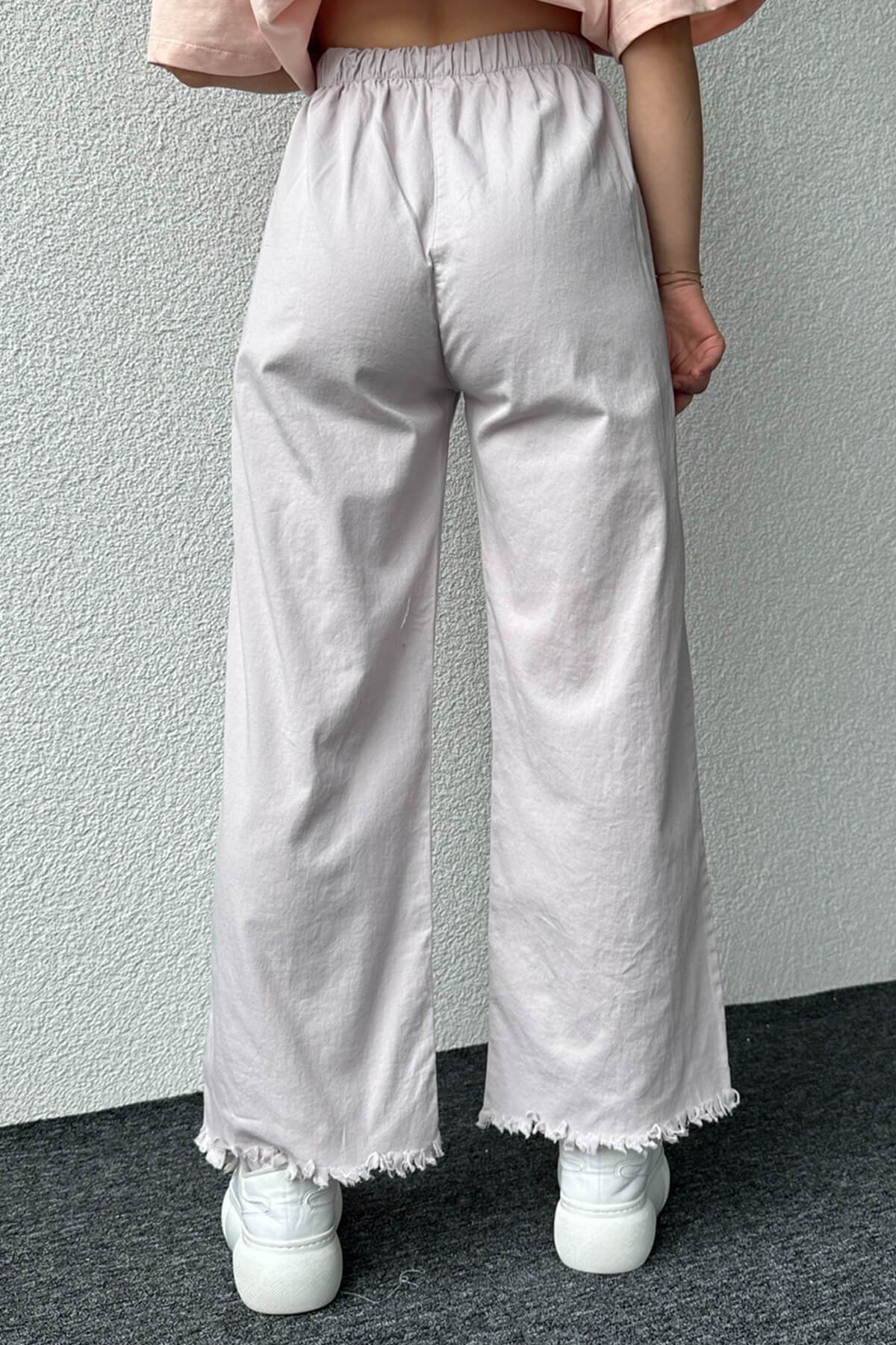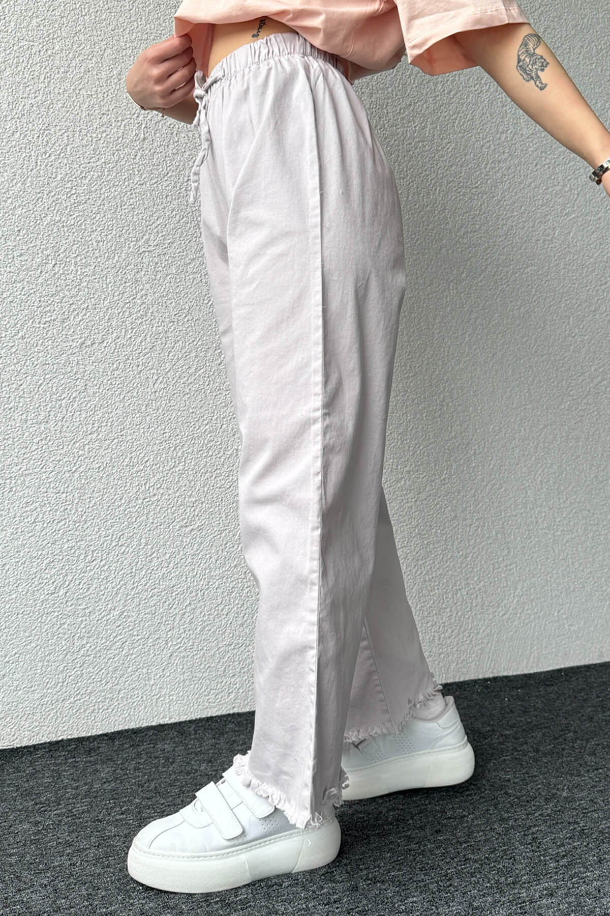 PNT-07379 Gri Paça Püsküllü Bel Lastik Ve İp Detay Keten Kumaş Salaş Pantolon