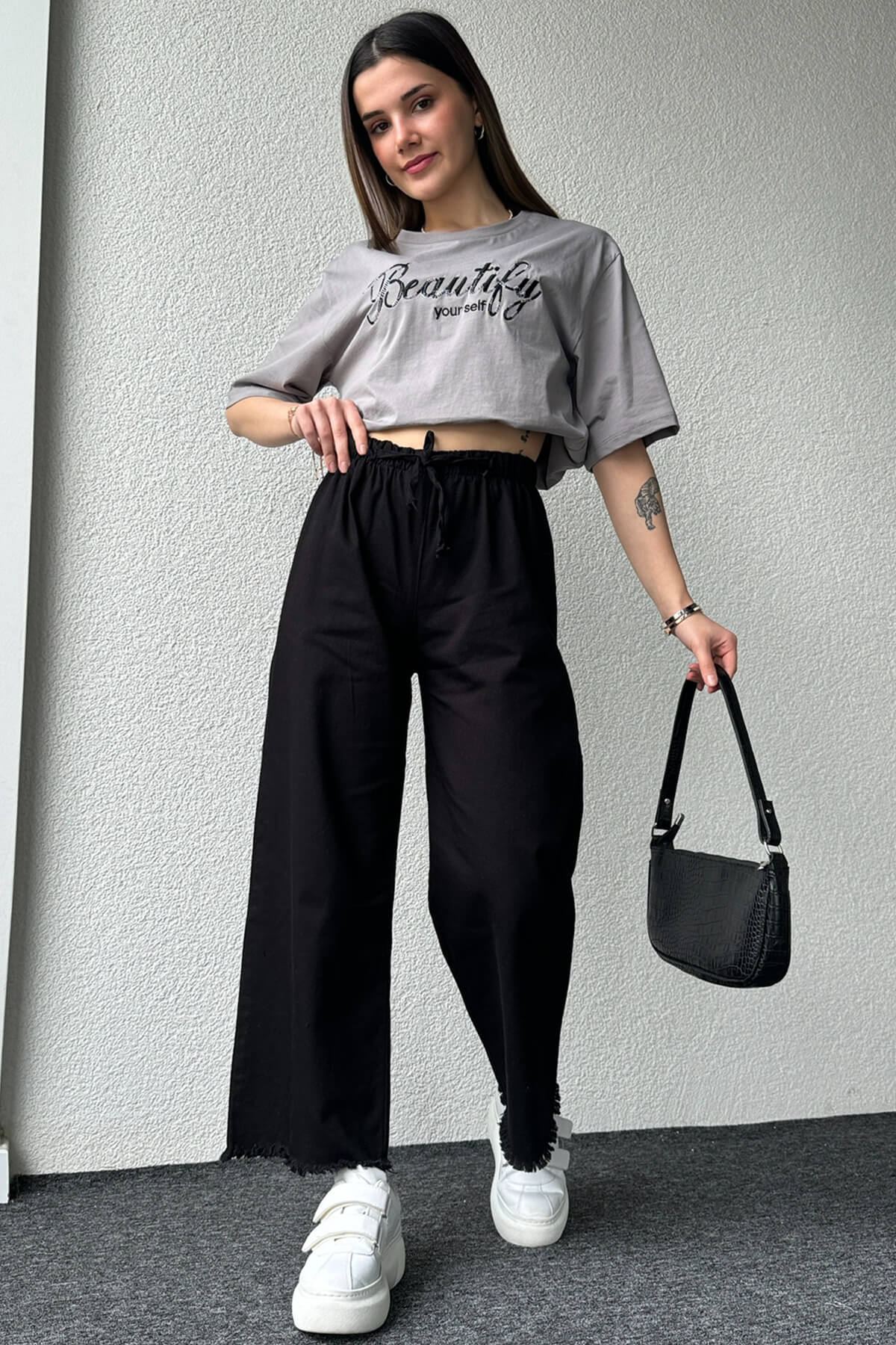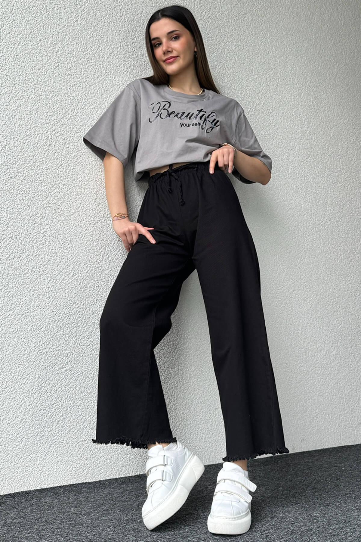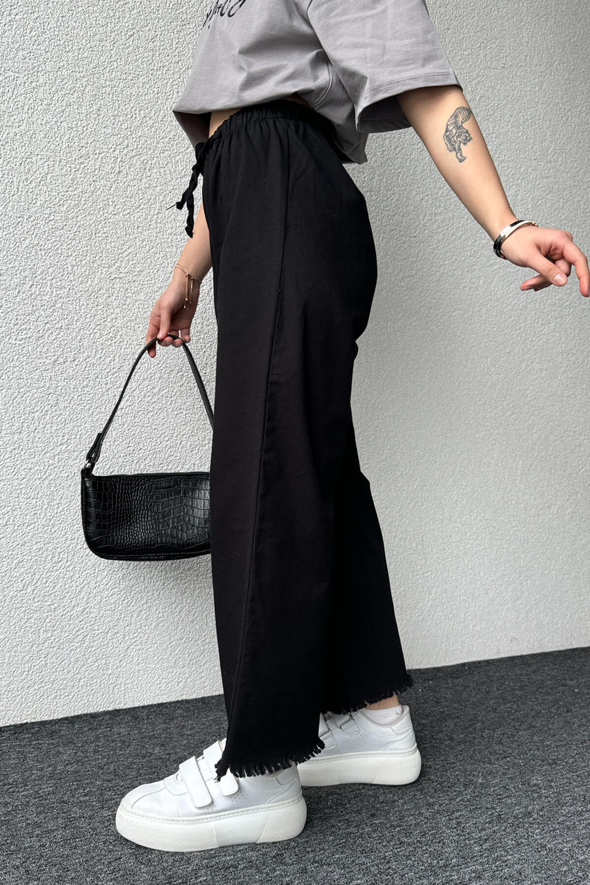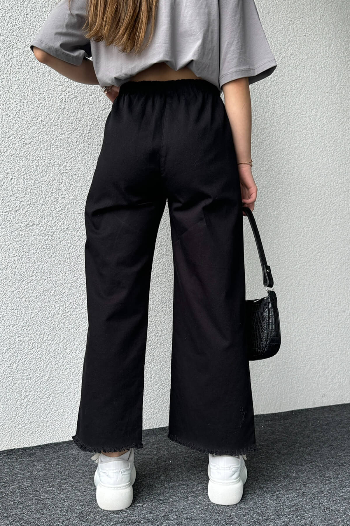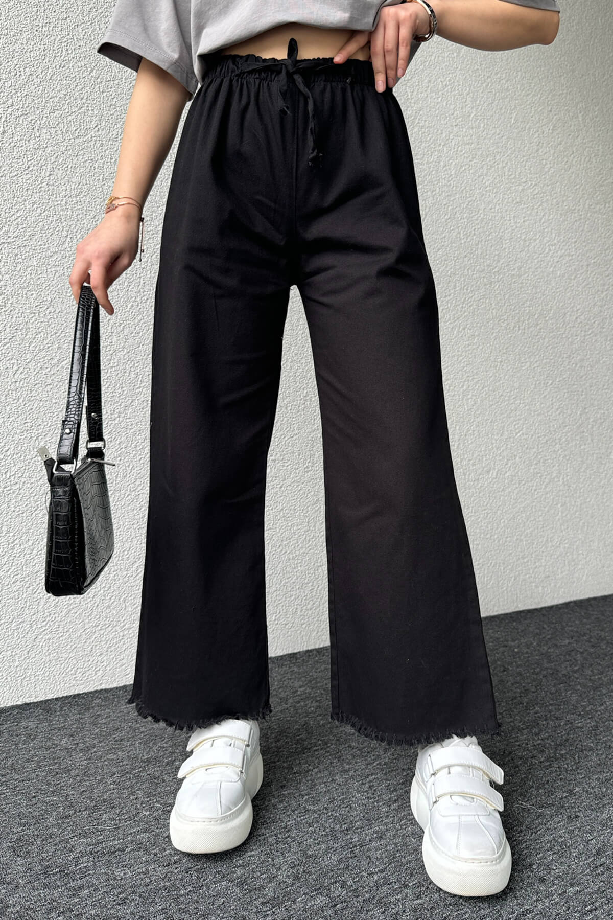 PNT-07379 Siyah Paça Püsküllü Bel Lastik Ve İp Detay Keten Kumaş Salaş Pantolon