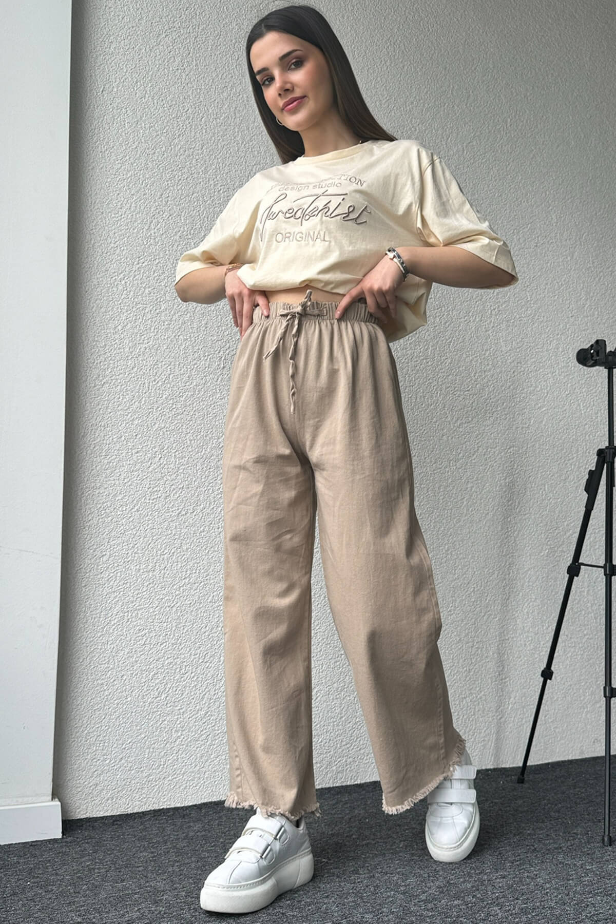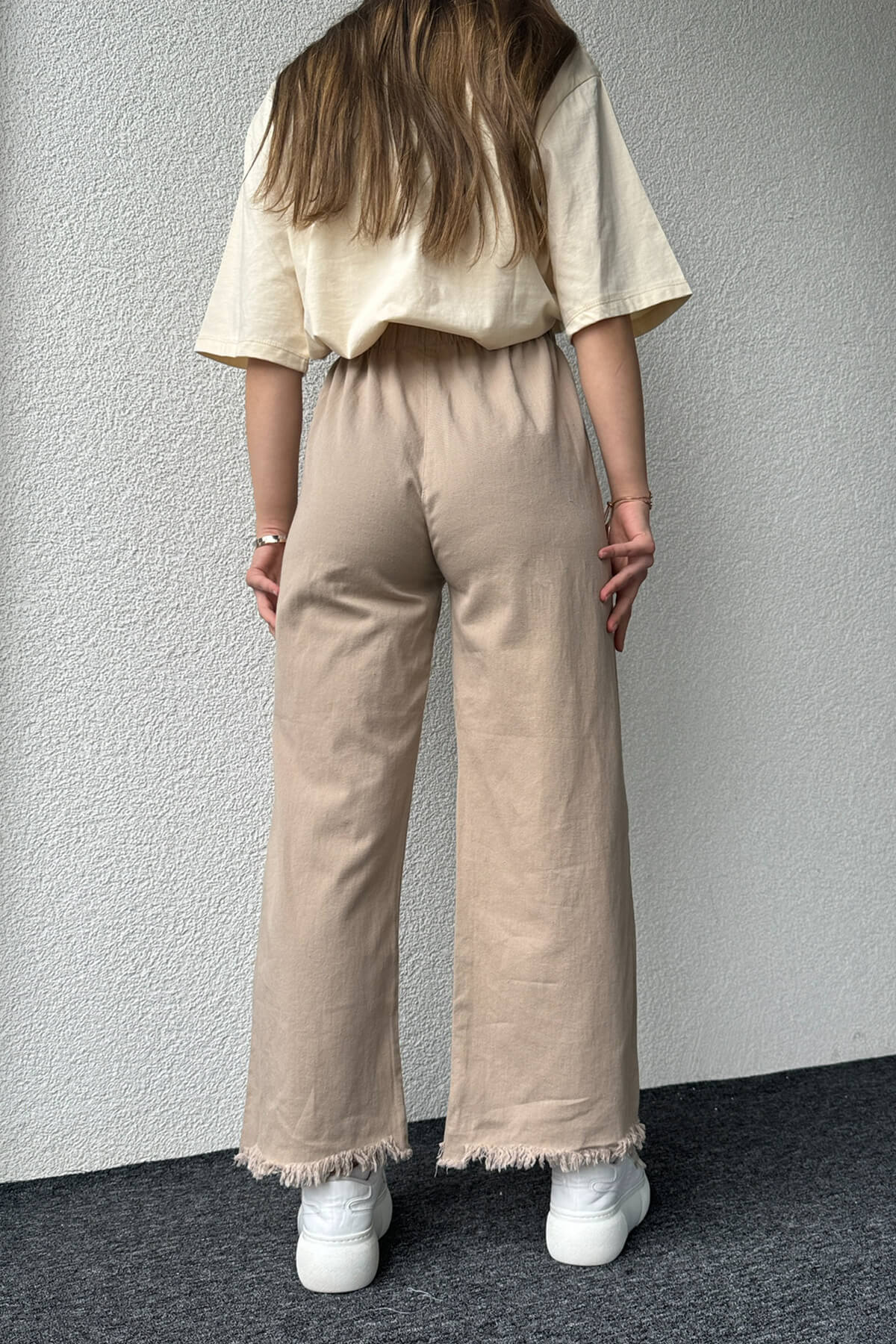 PNT-07379 Taş Rengi Paça Püsküllü Bel Lastik Ve İp Detay Keten Kumaş Salaş Pantolon