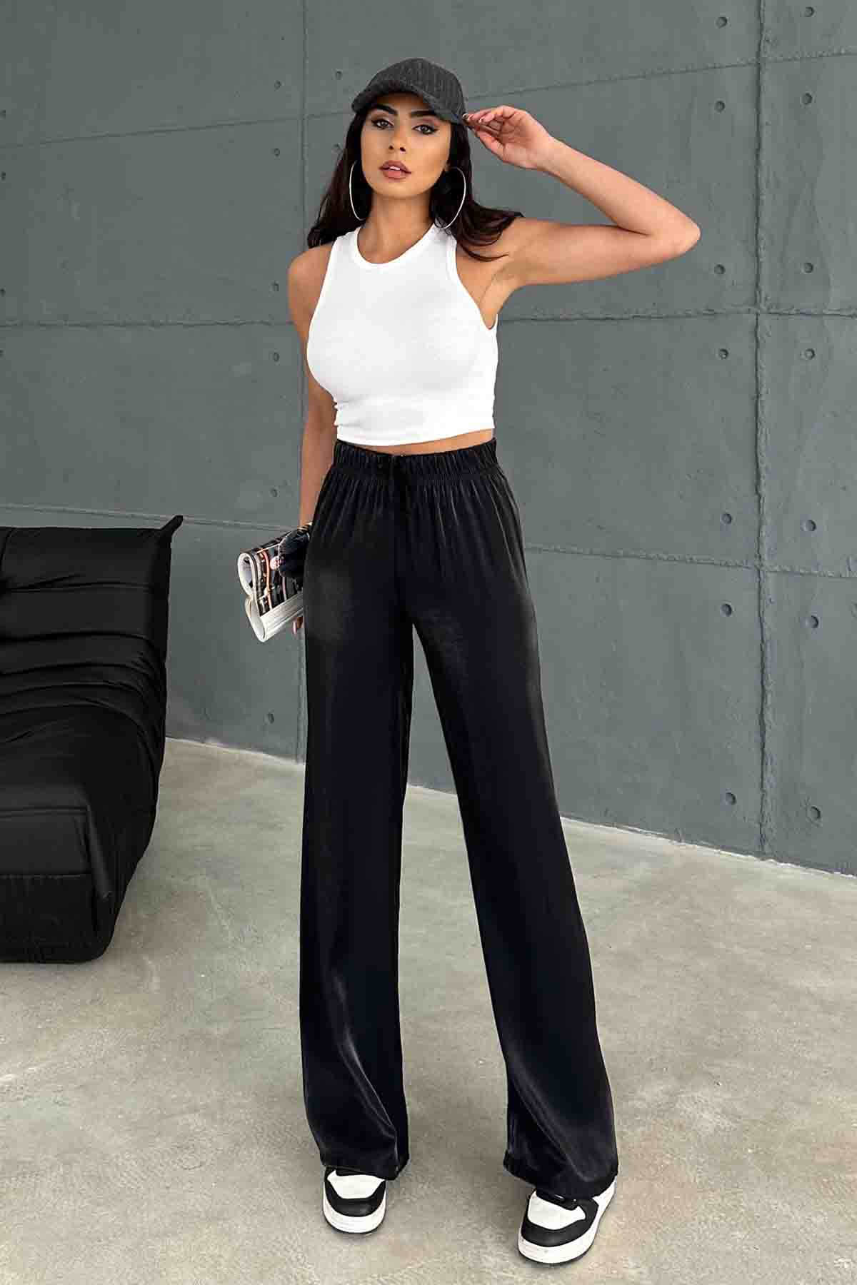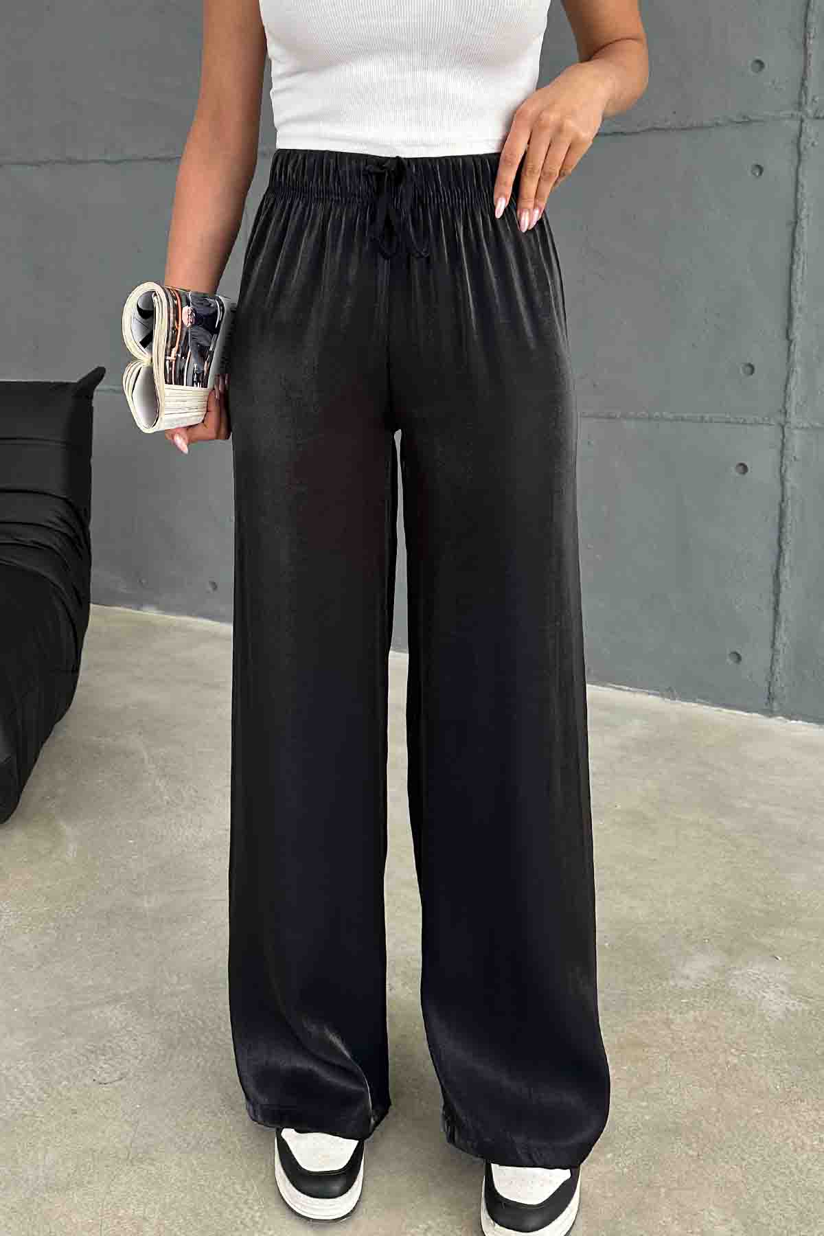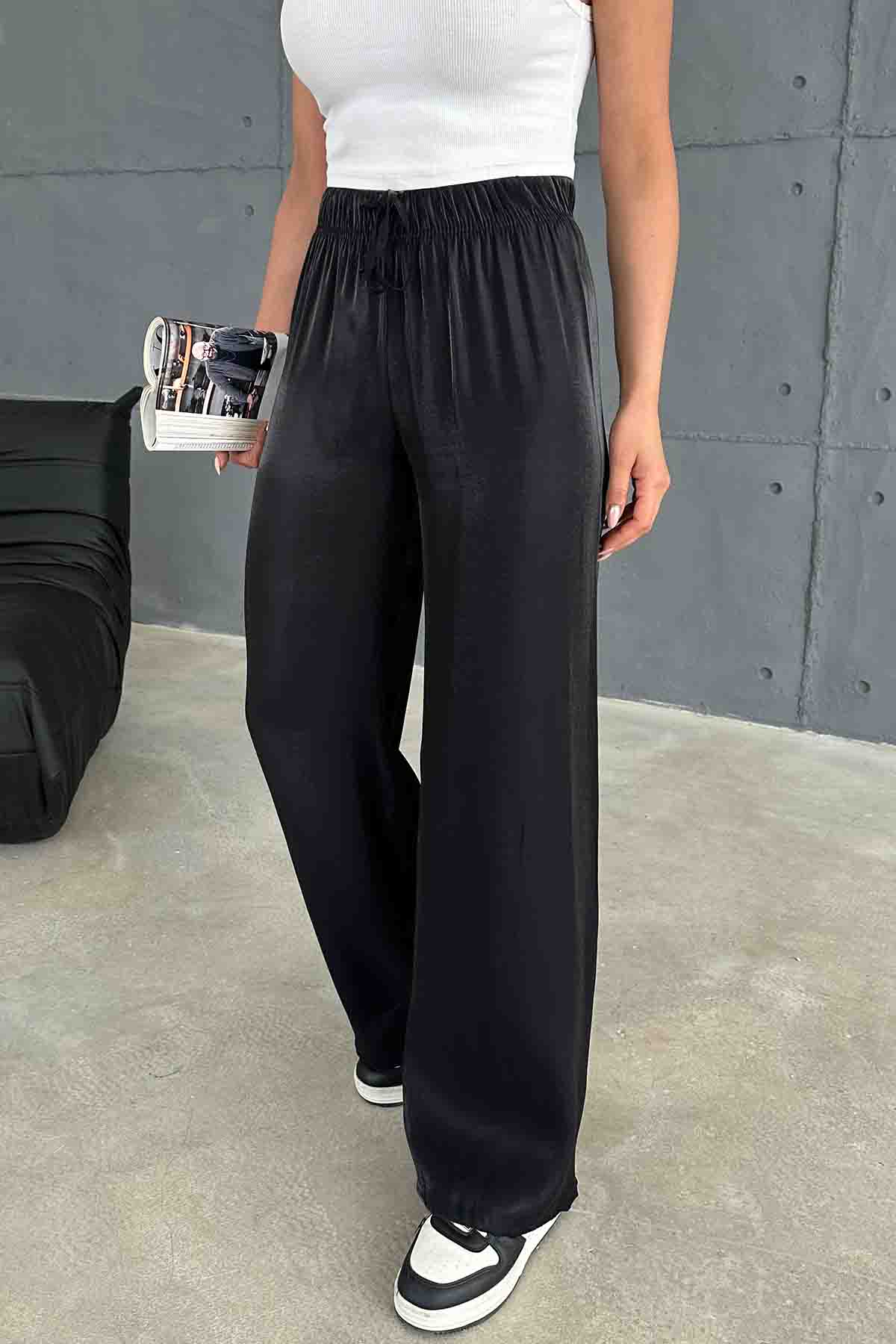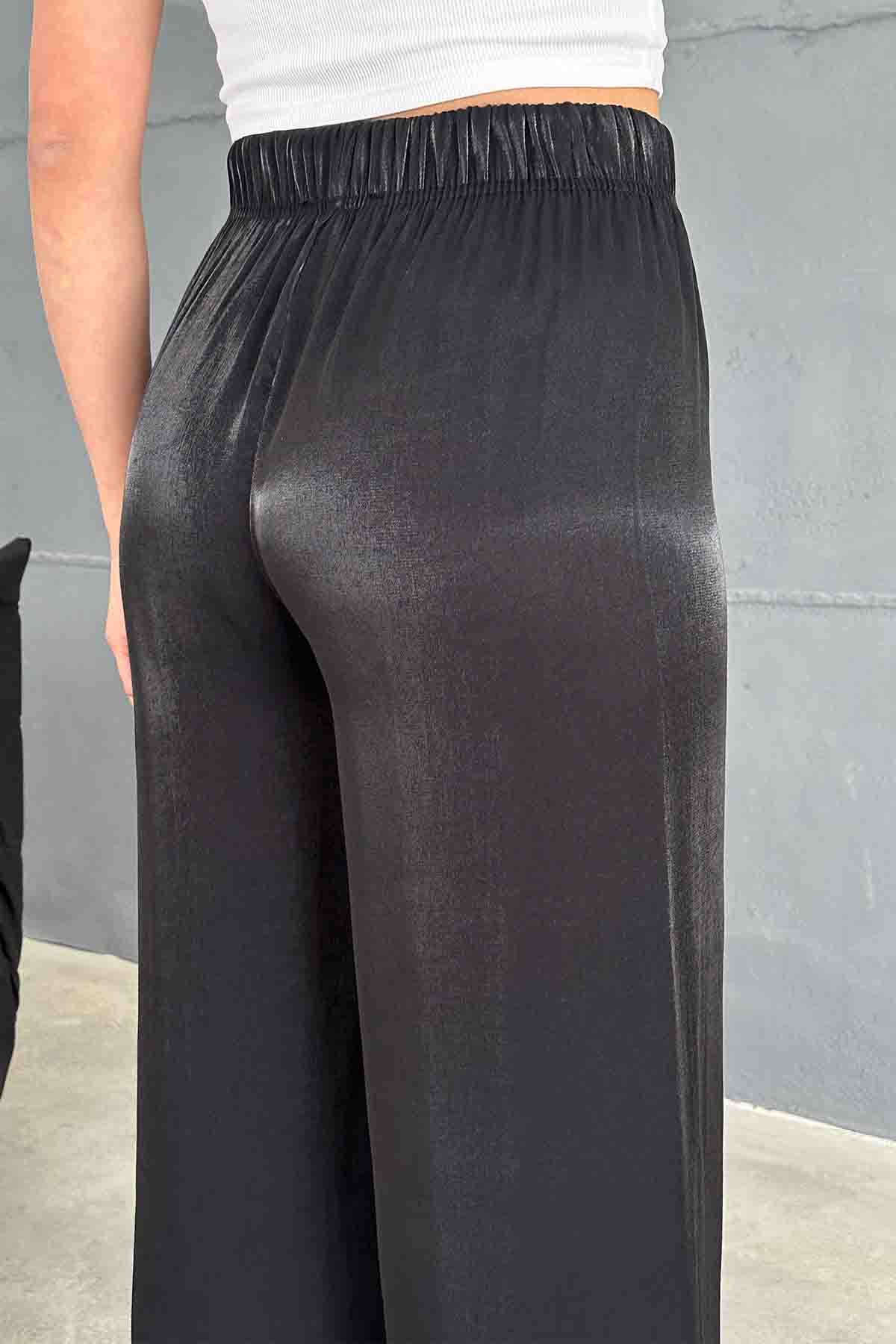 PNT-07395 Siyah Saten Kumaş Bel Lastikli Palazzo Pantolon