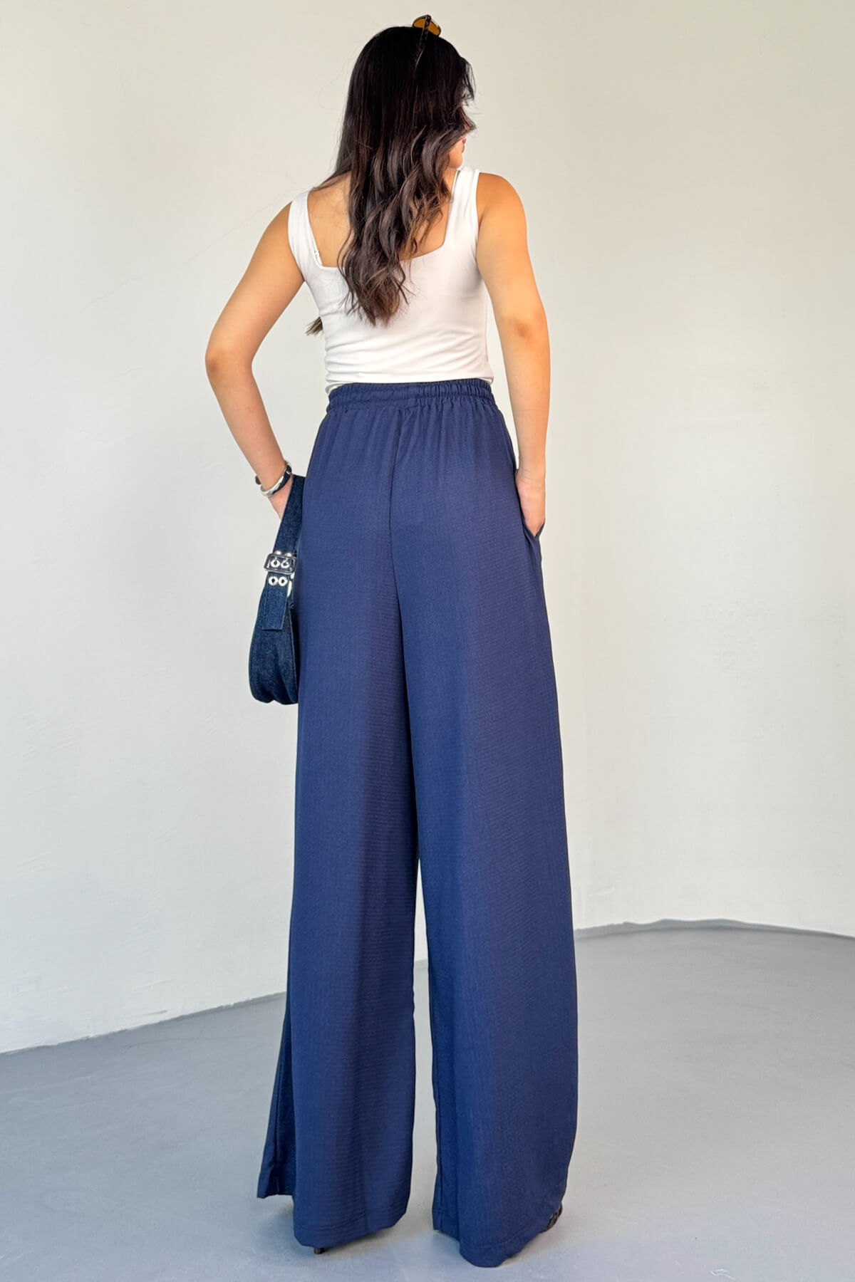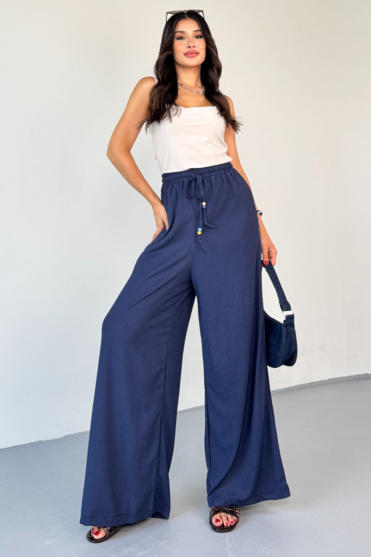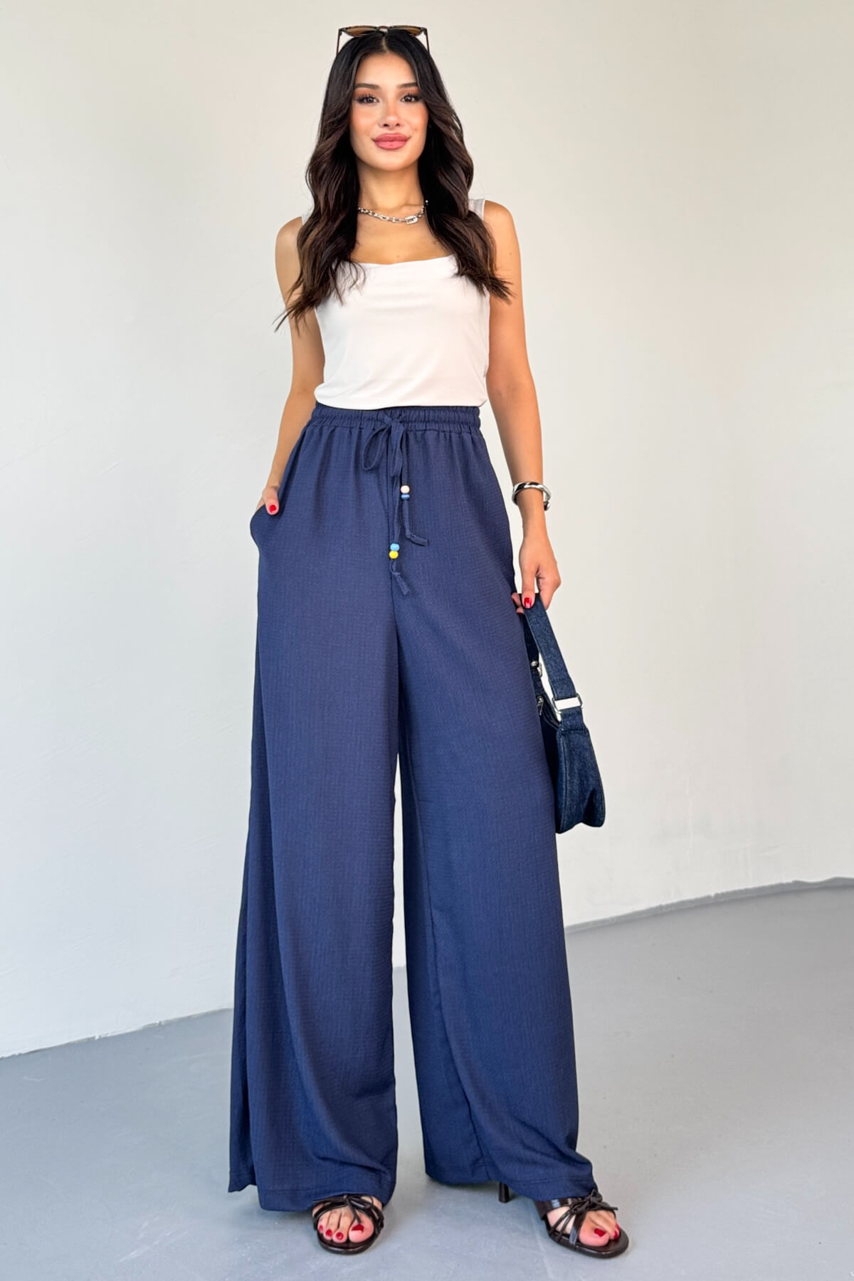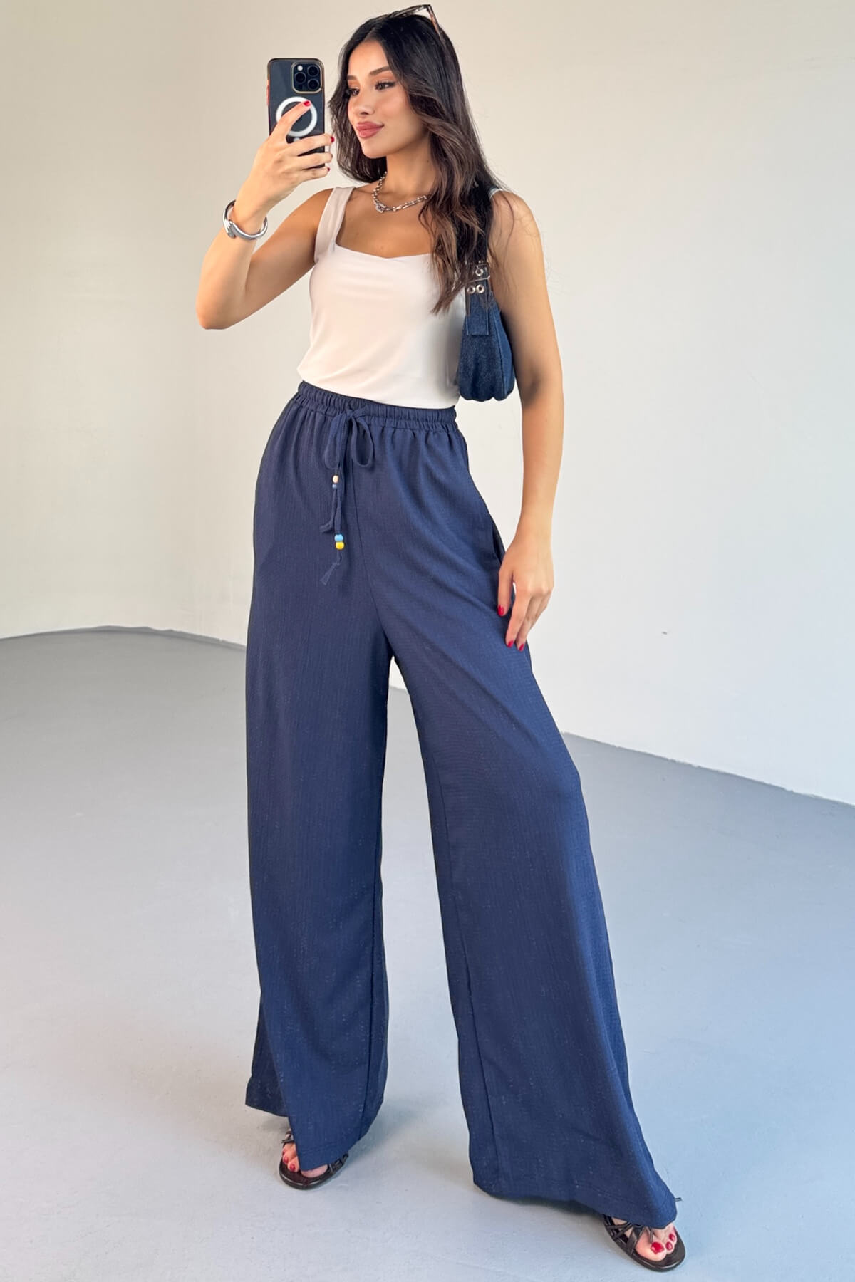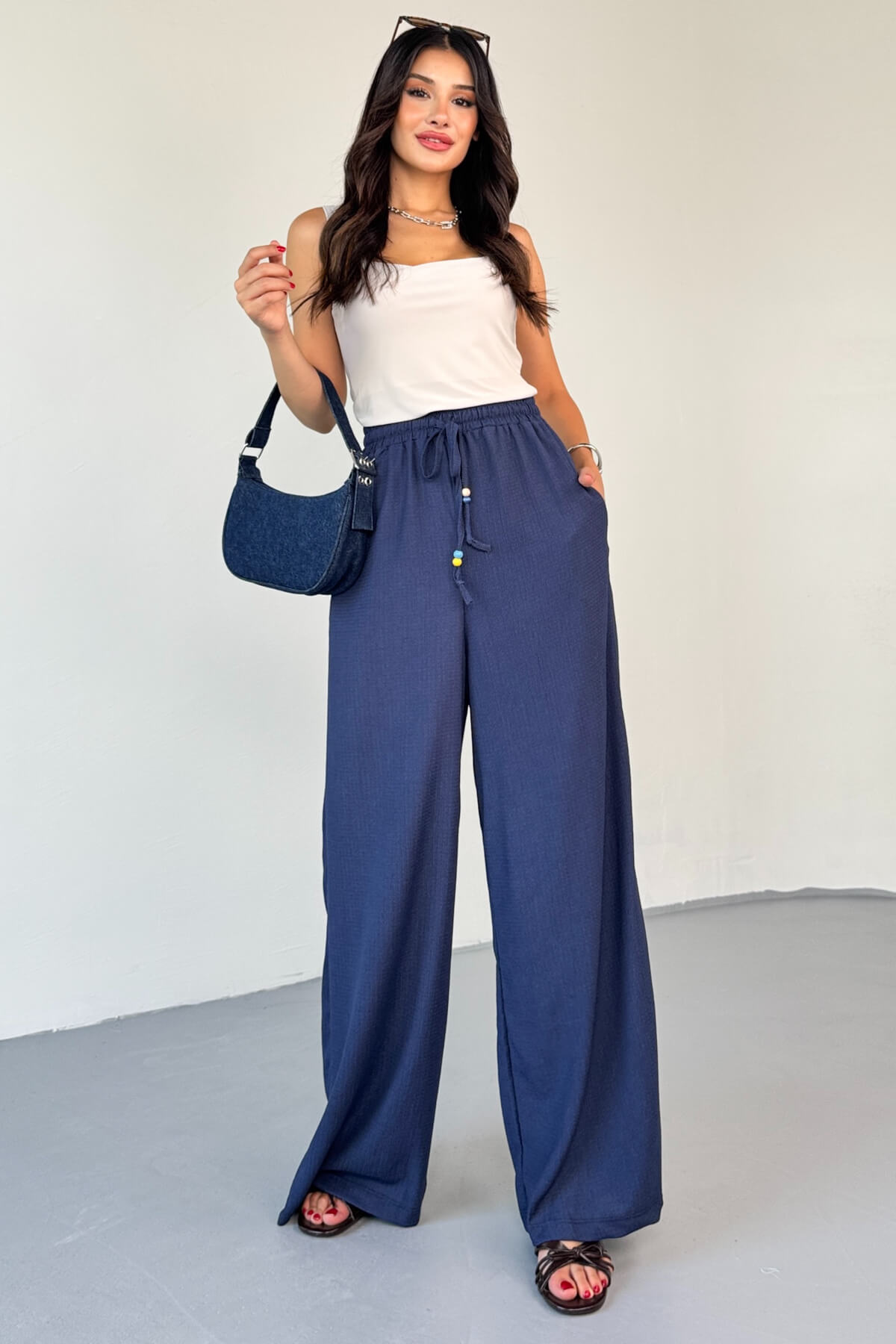 PNT-07408 Lacivert Bürümcük Kumaş Bel Lastikli İp Boncuklu Salaş Pantolon