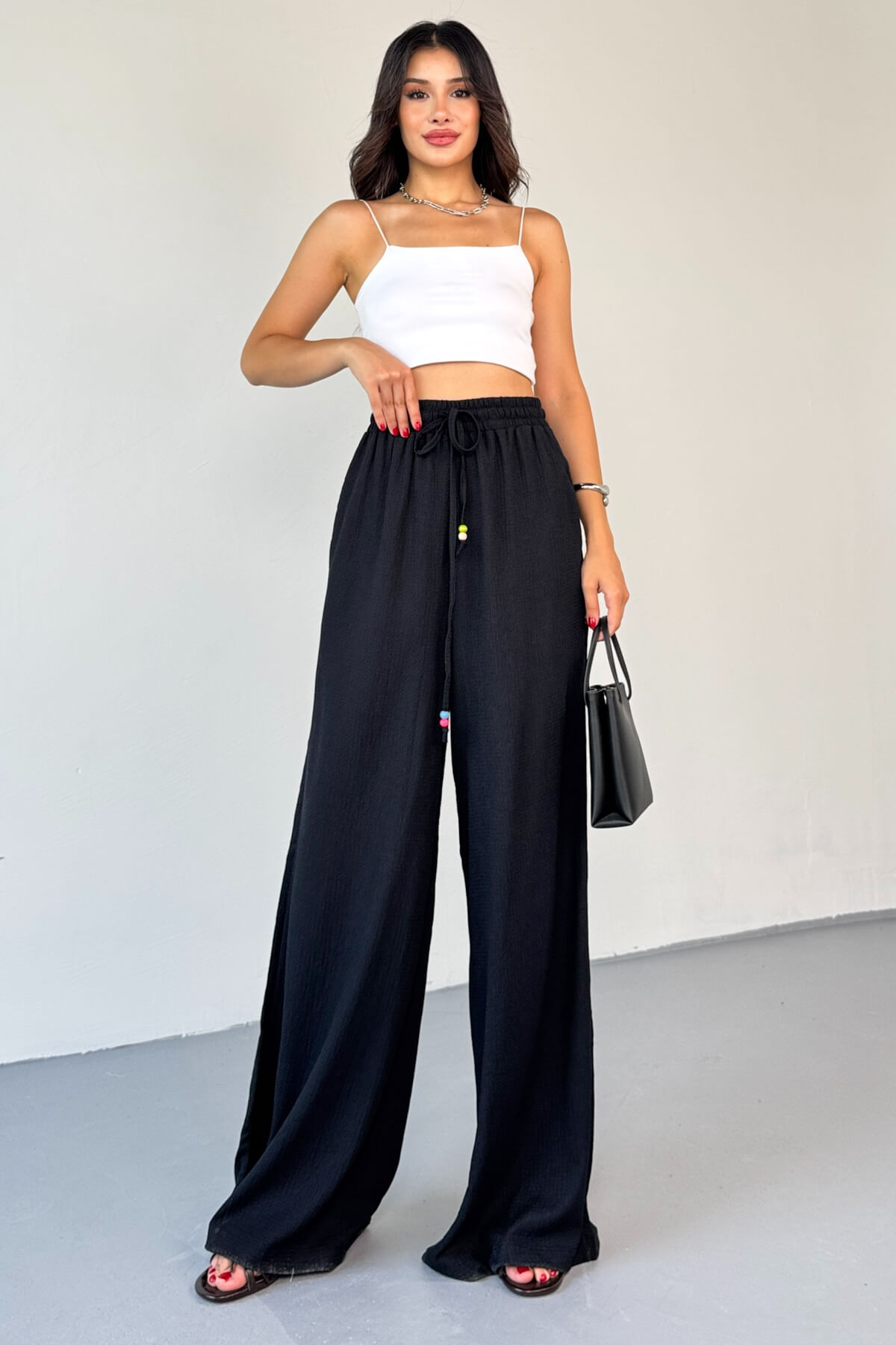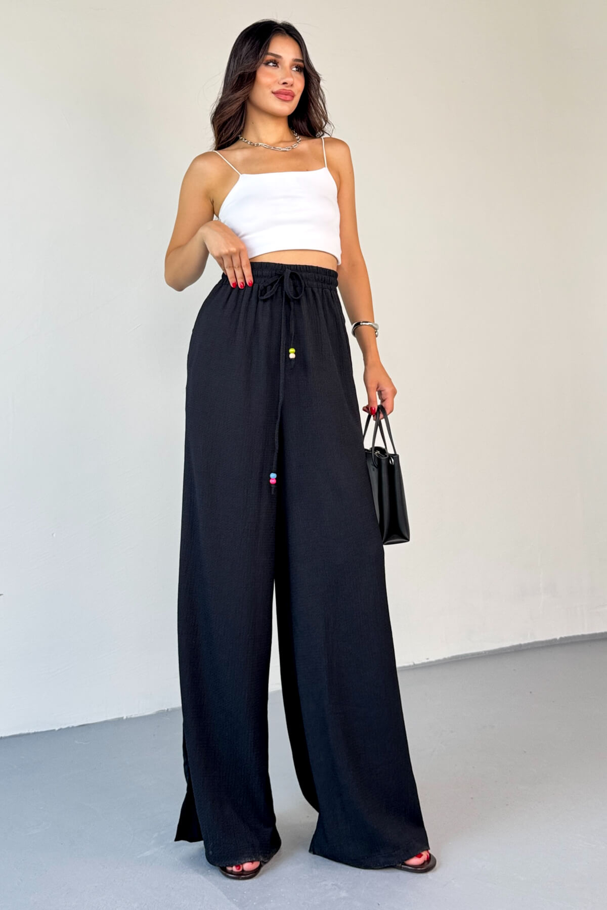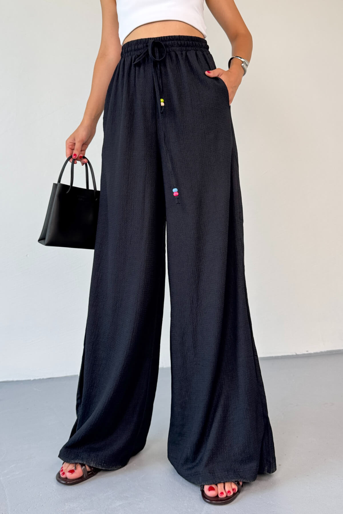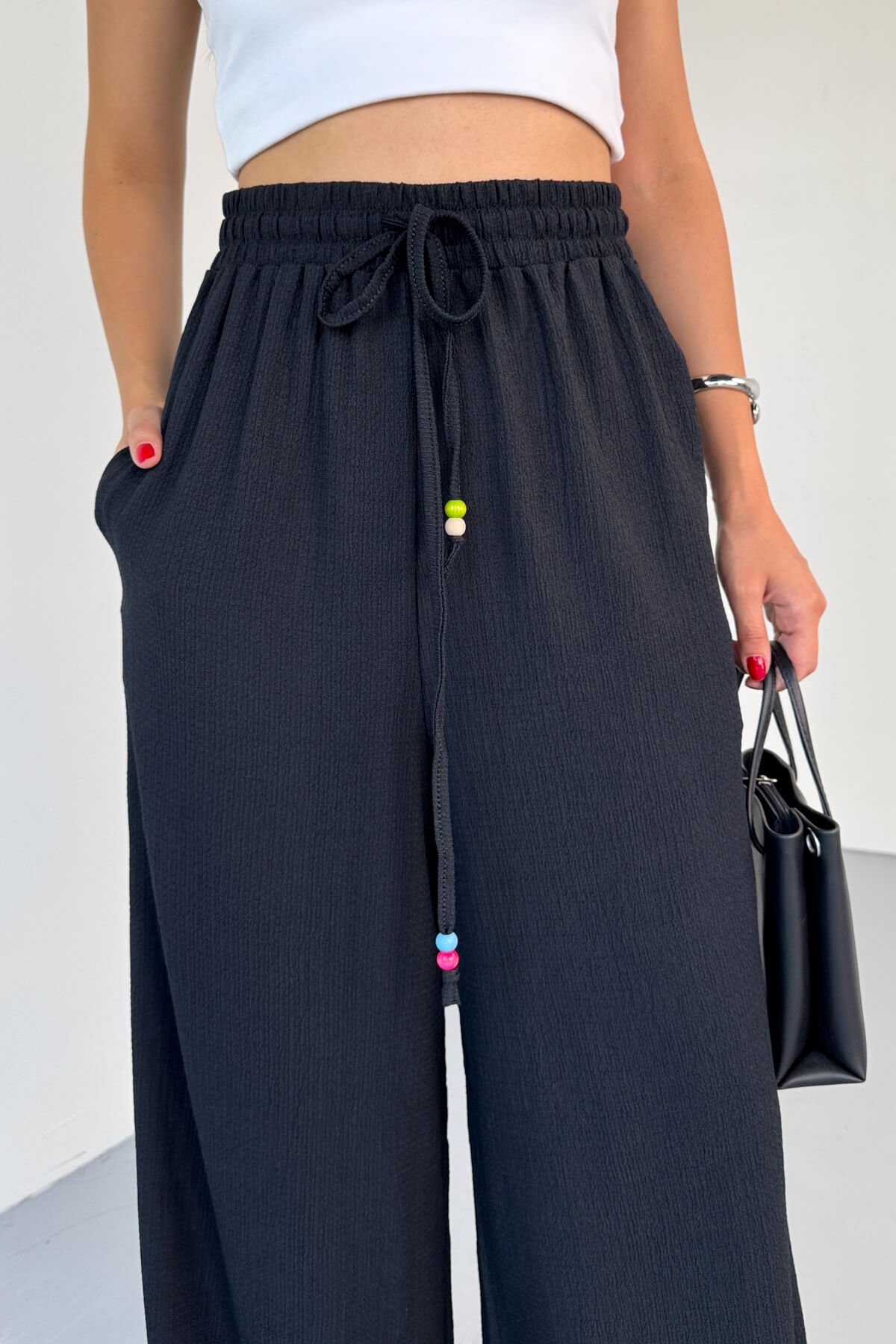 PNT-07408 Siyah Bürümcük Kumaş İp Boncuklu Salaş Pantolon